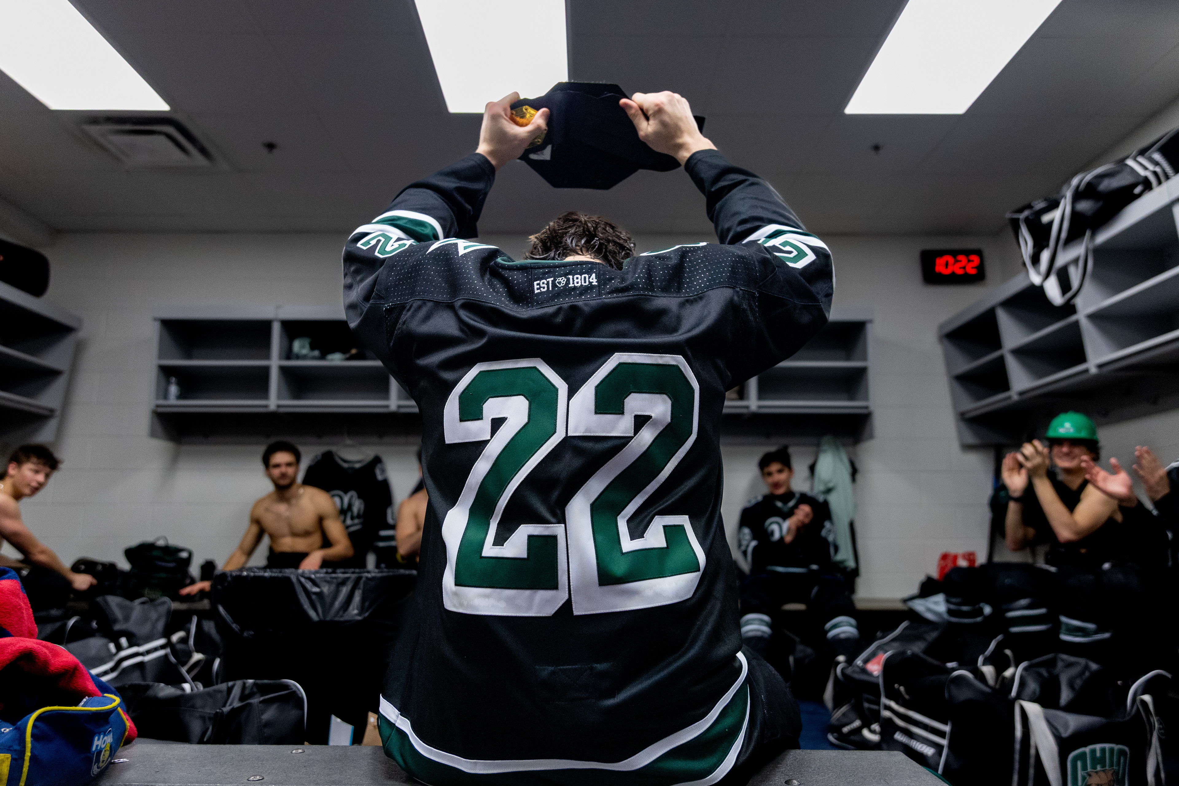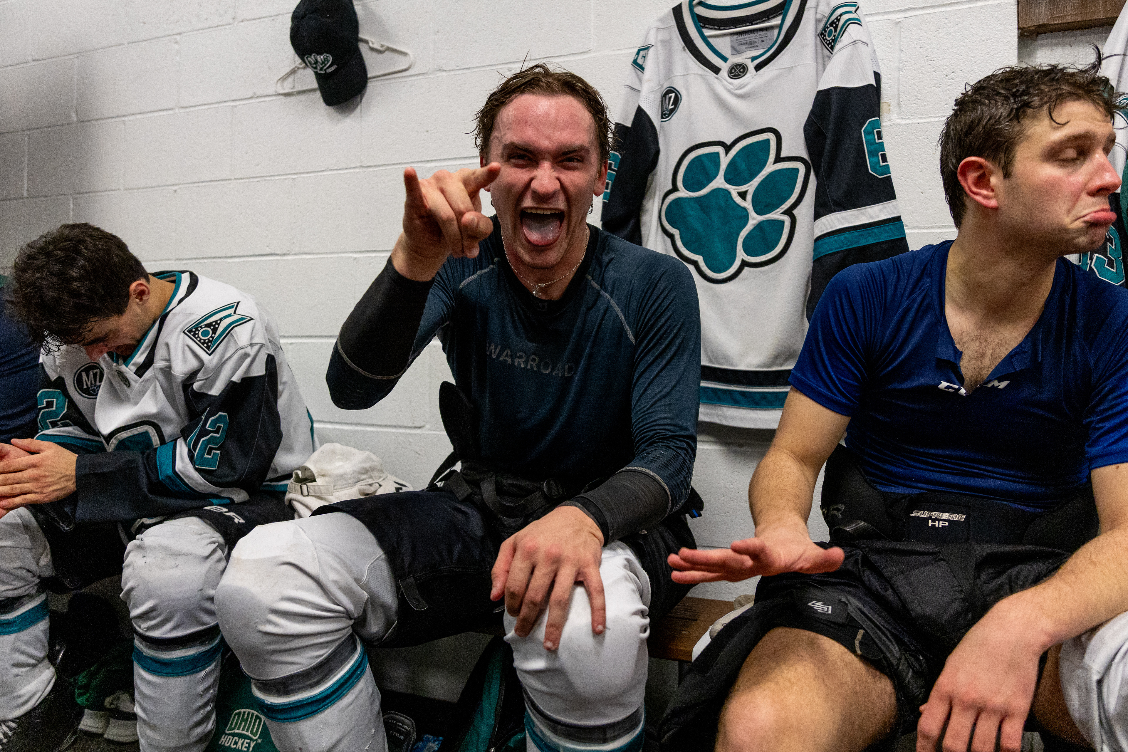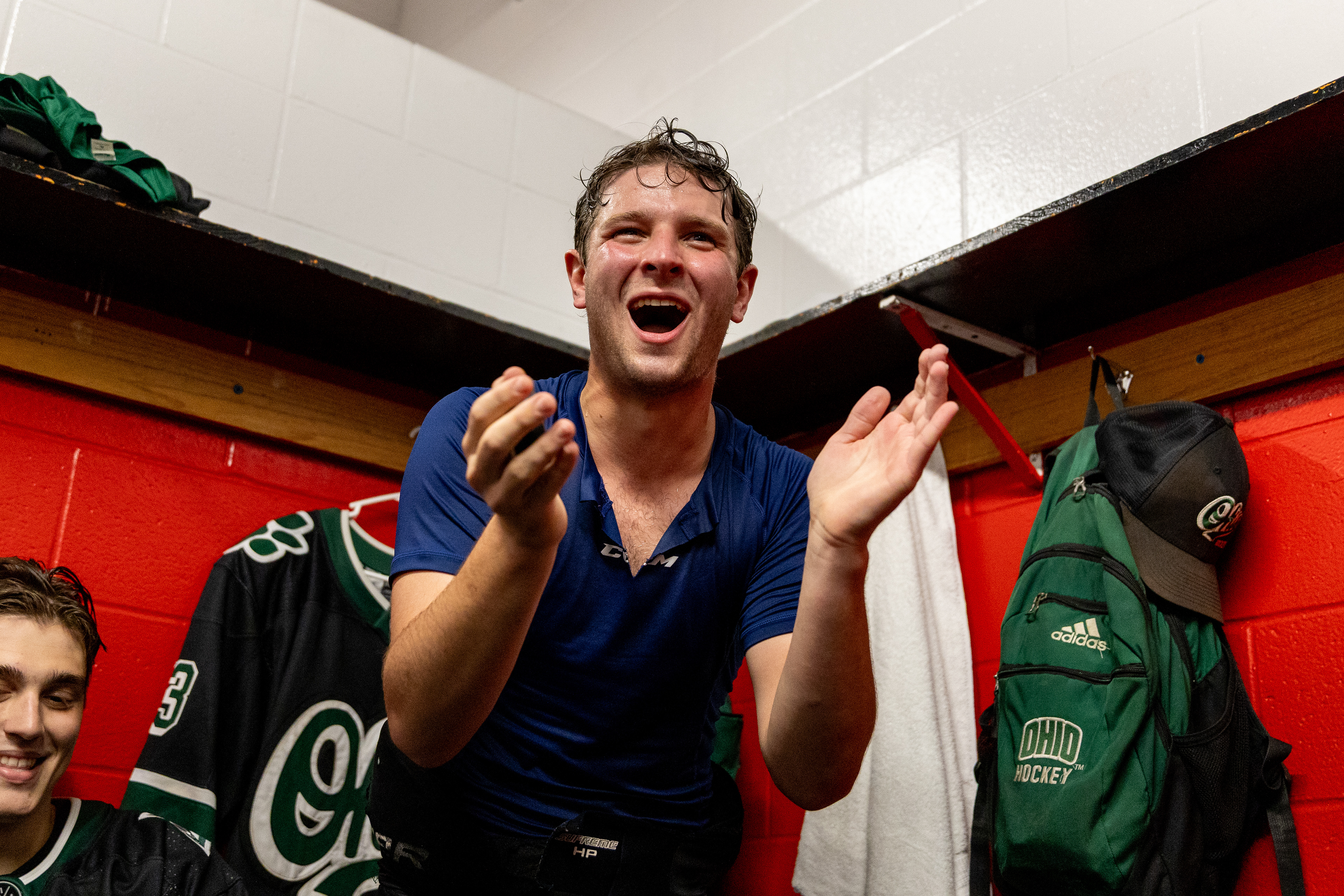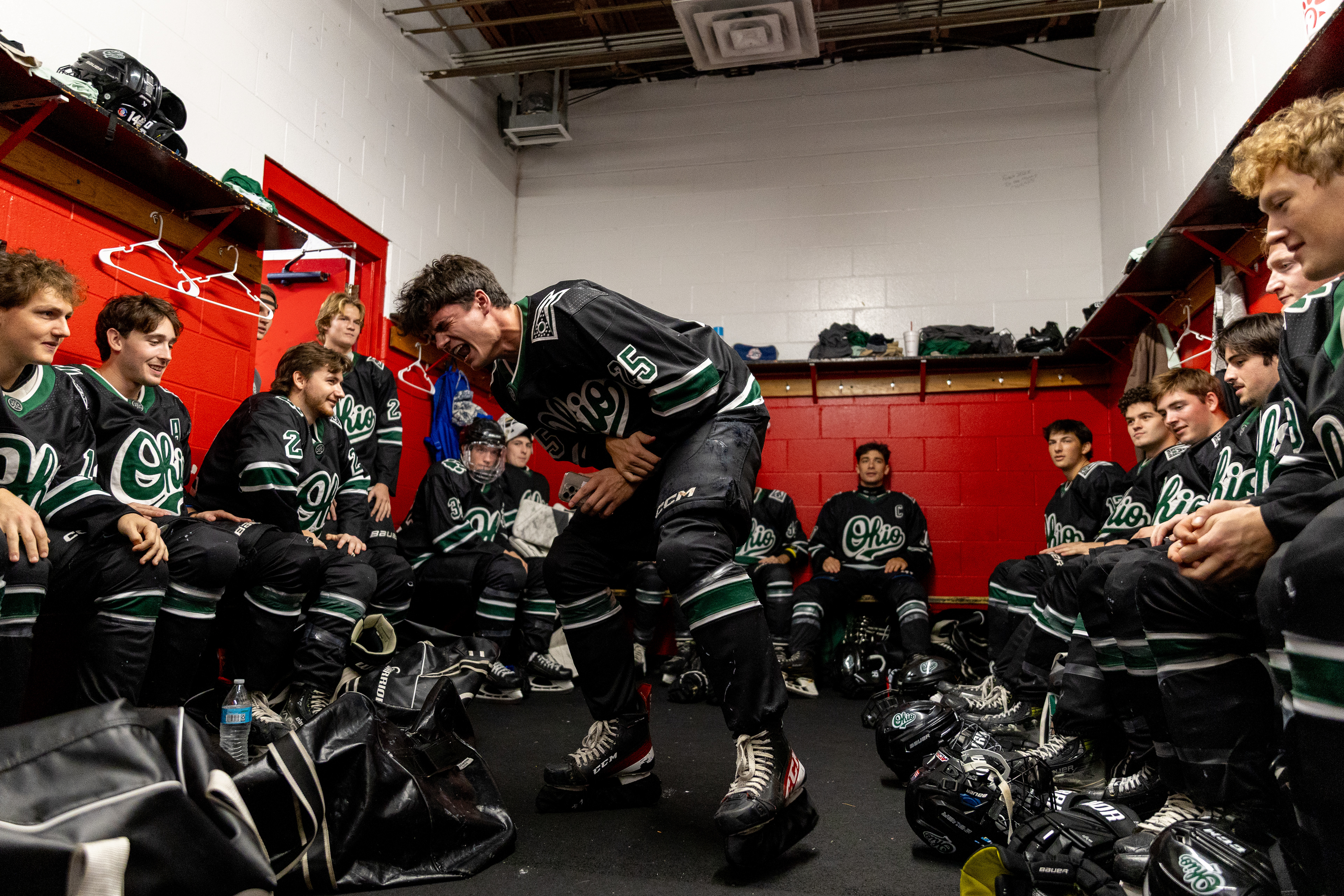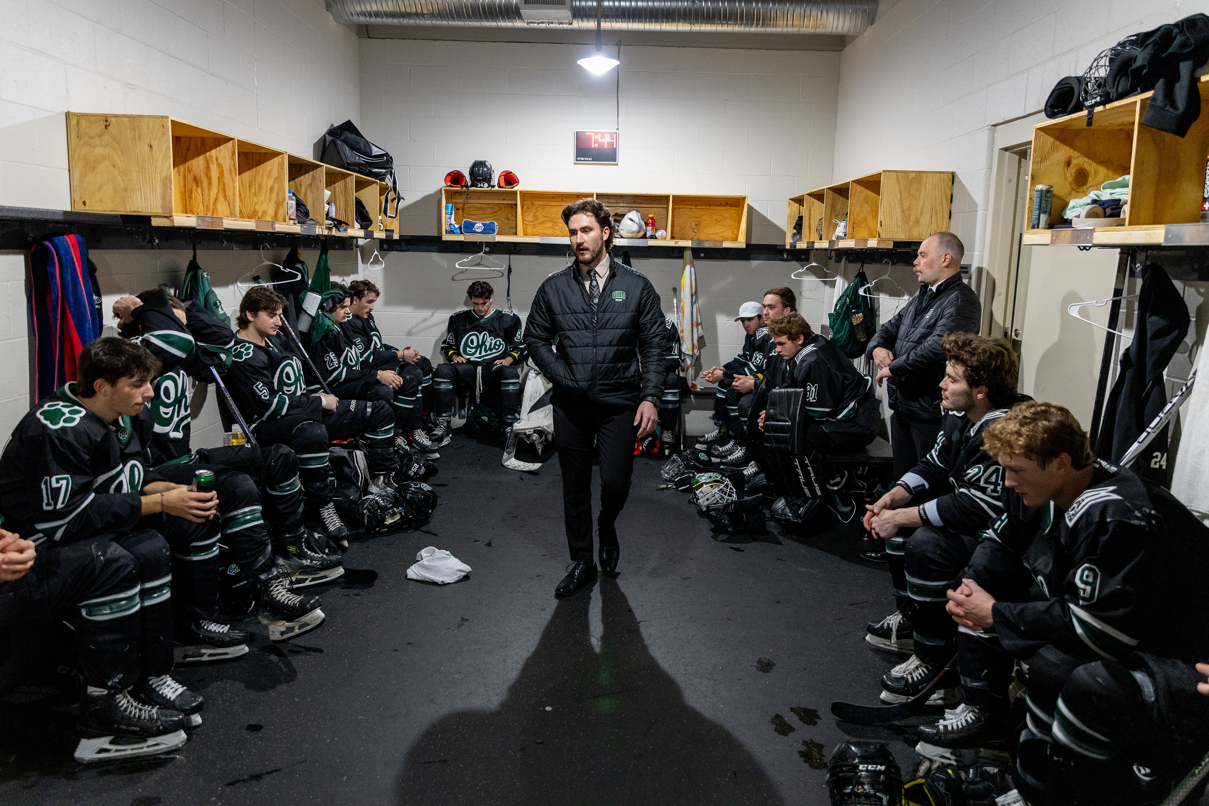 Ohio Bobcats Forward #25, Xander Danner, announces the starting lineup in the locker room before a game against Adrian at Arrington Ice Arena on October 23 2025.