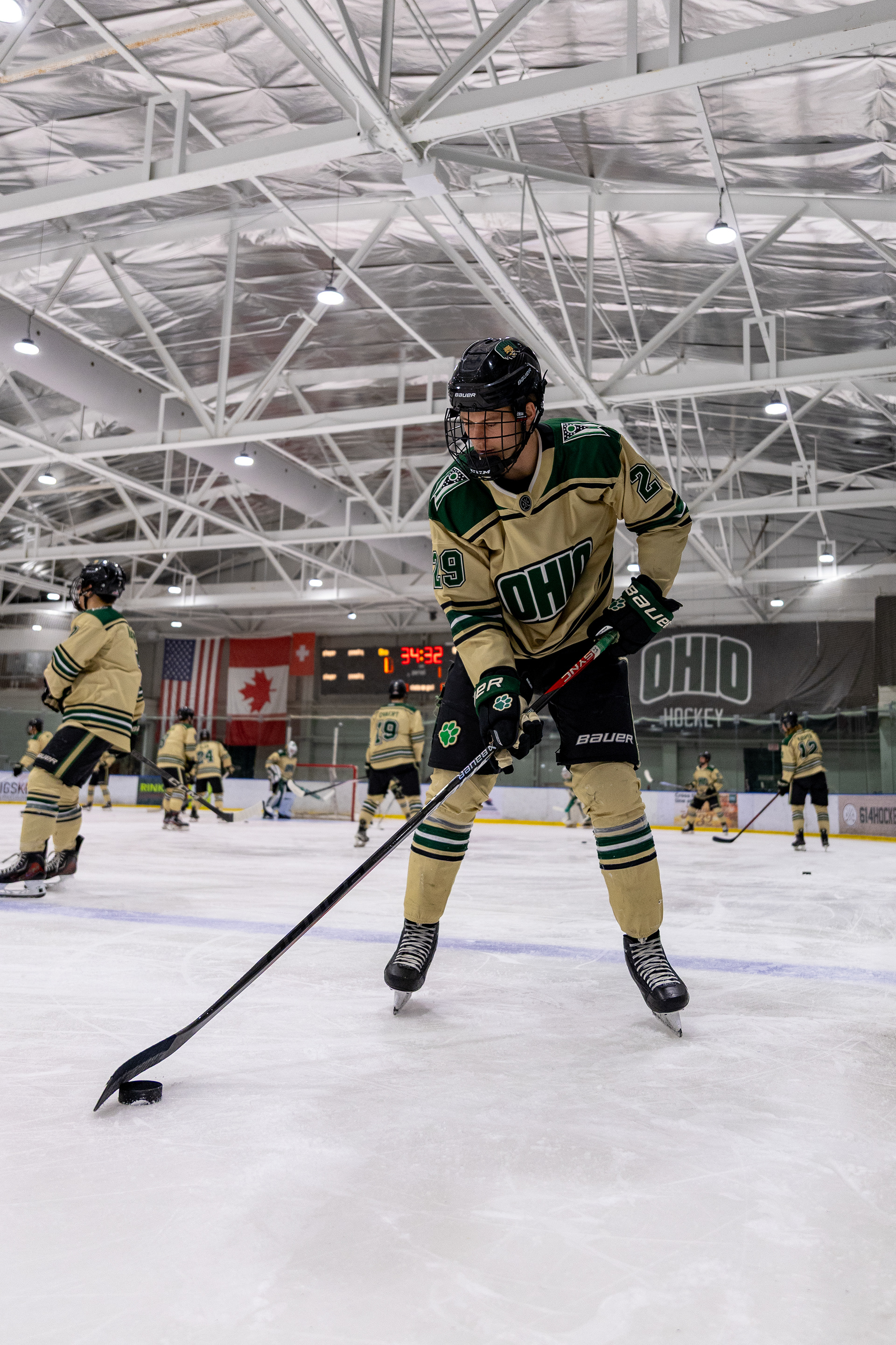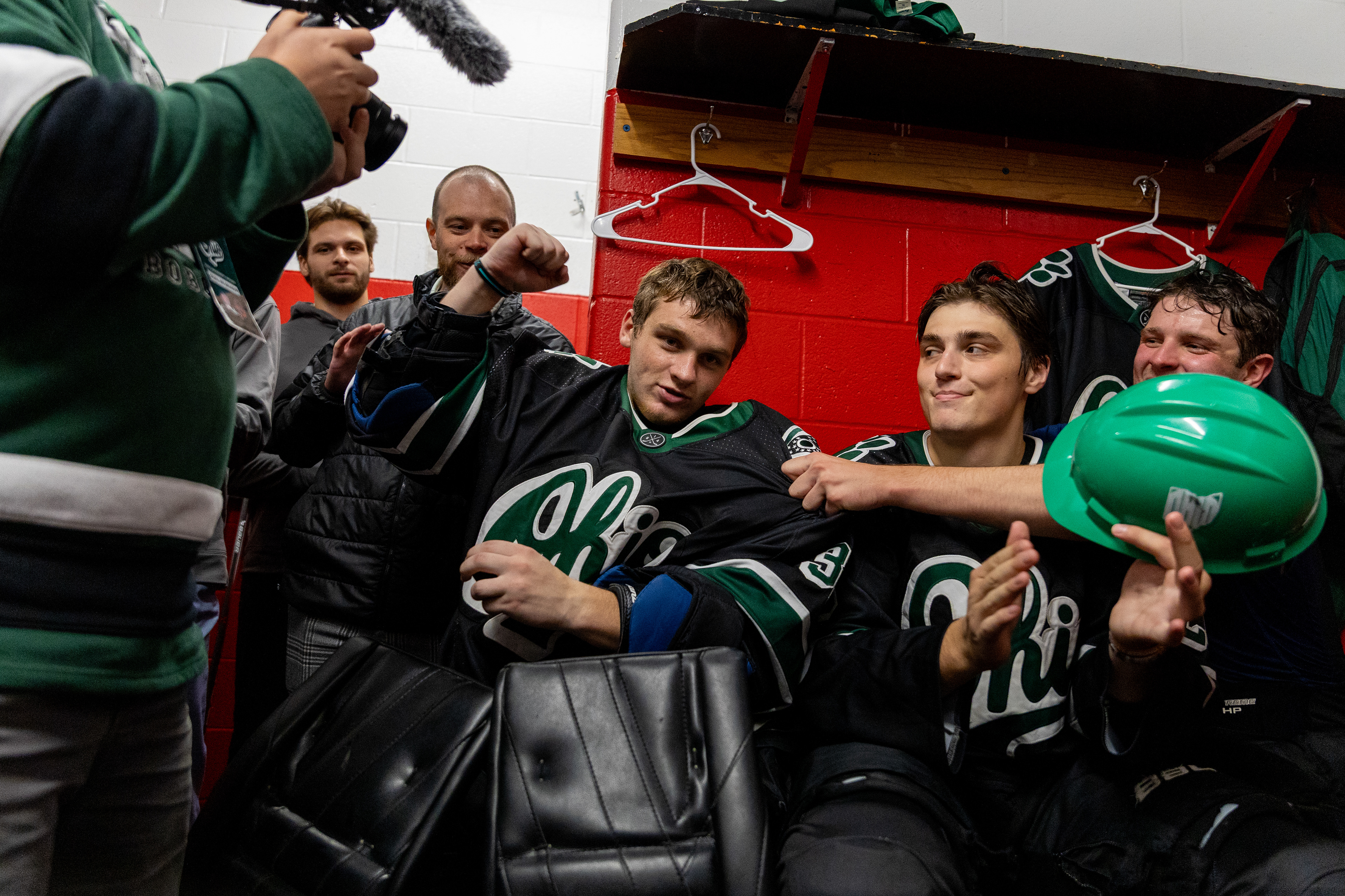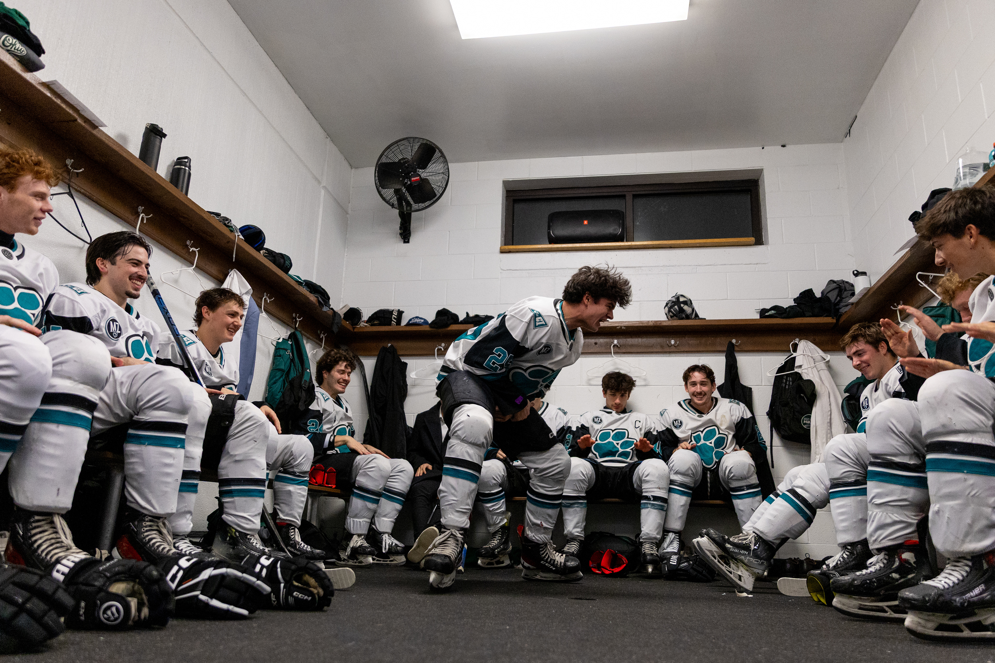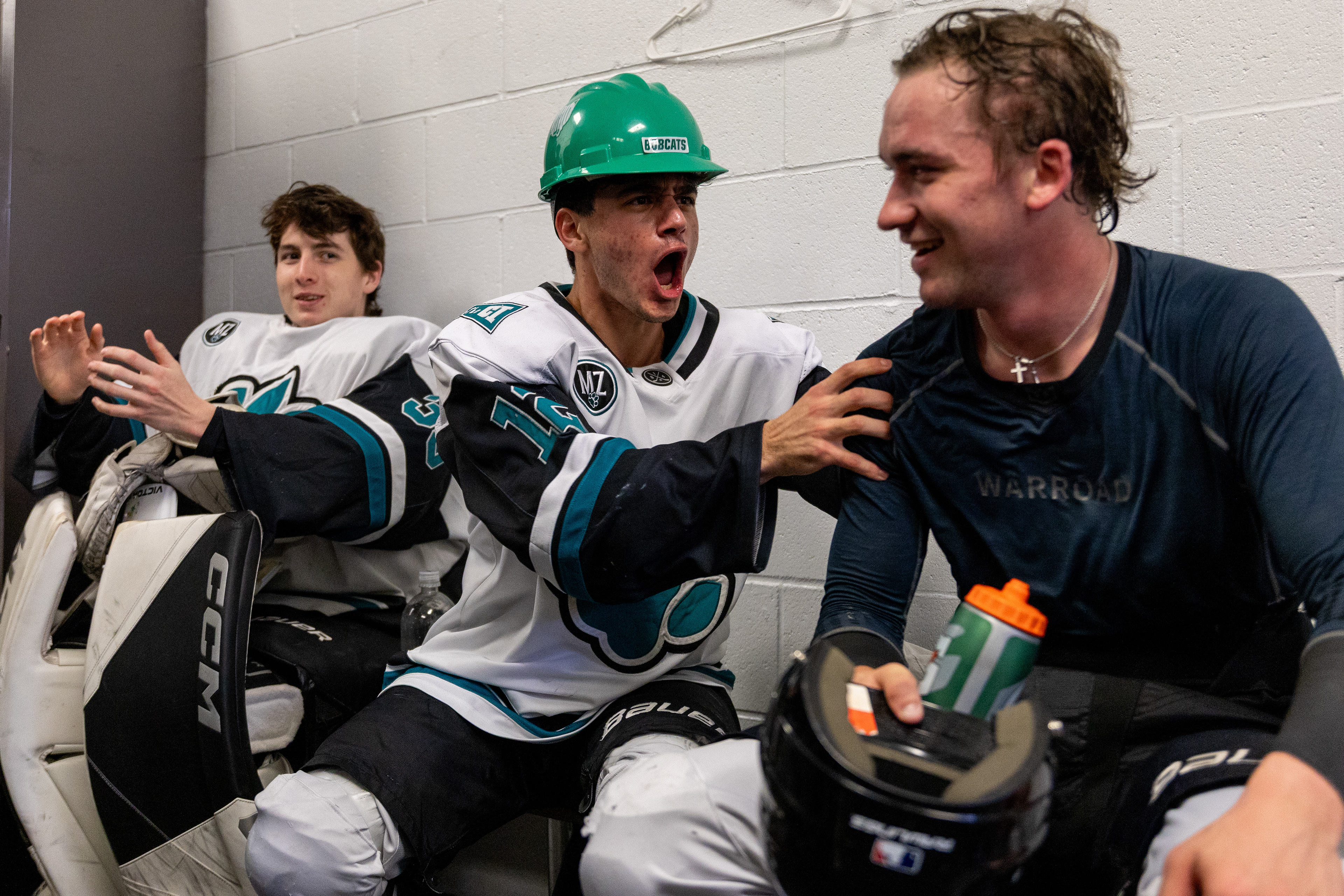 Ohio Bobcats Forward #25, Xander Danner, announces the starting lineup in the locker room before a game against Adrian at Arrington Ice Arena on October 23 2025.