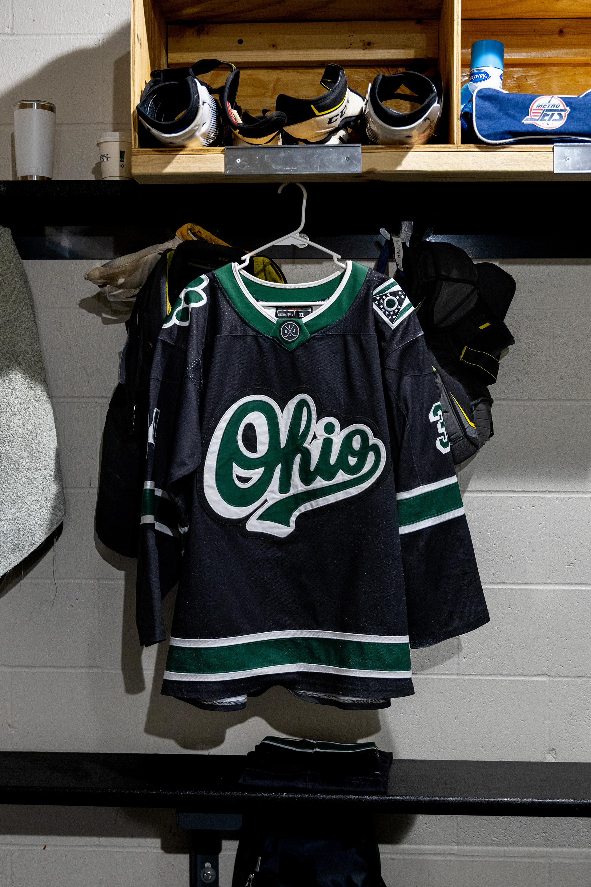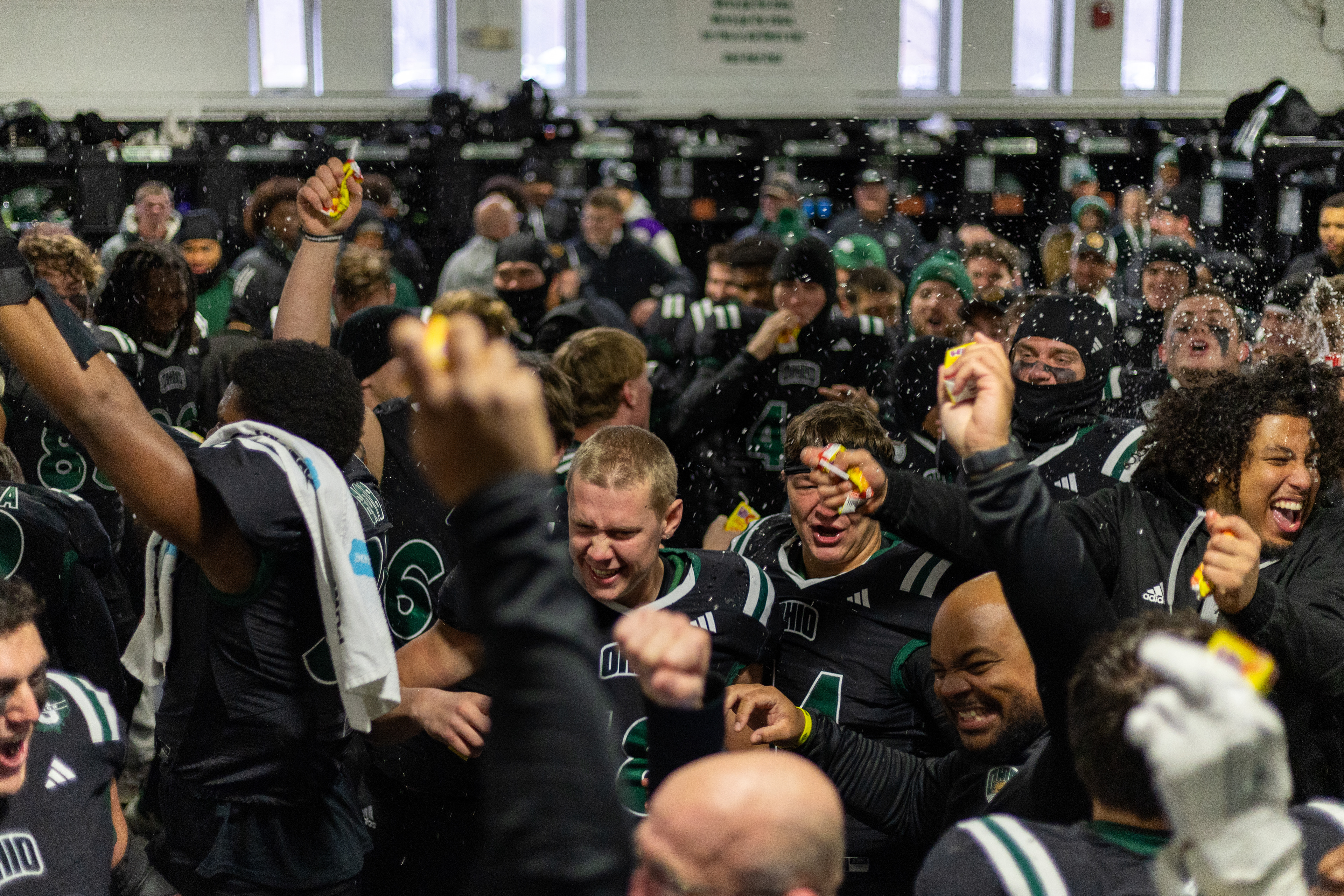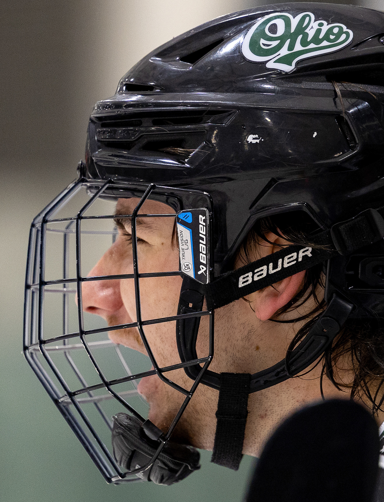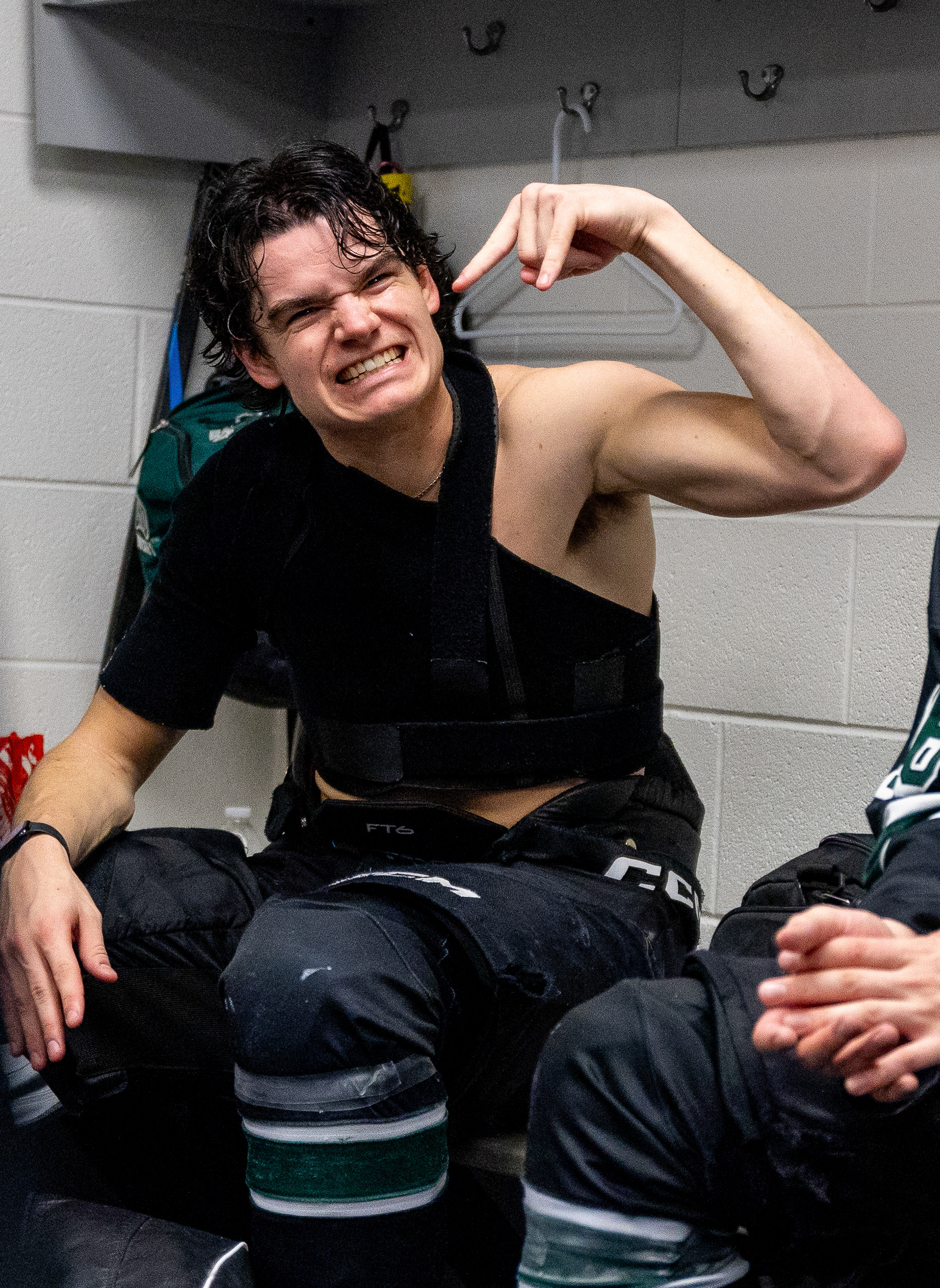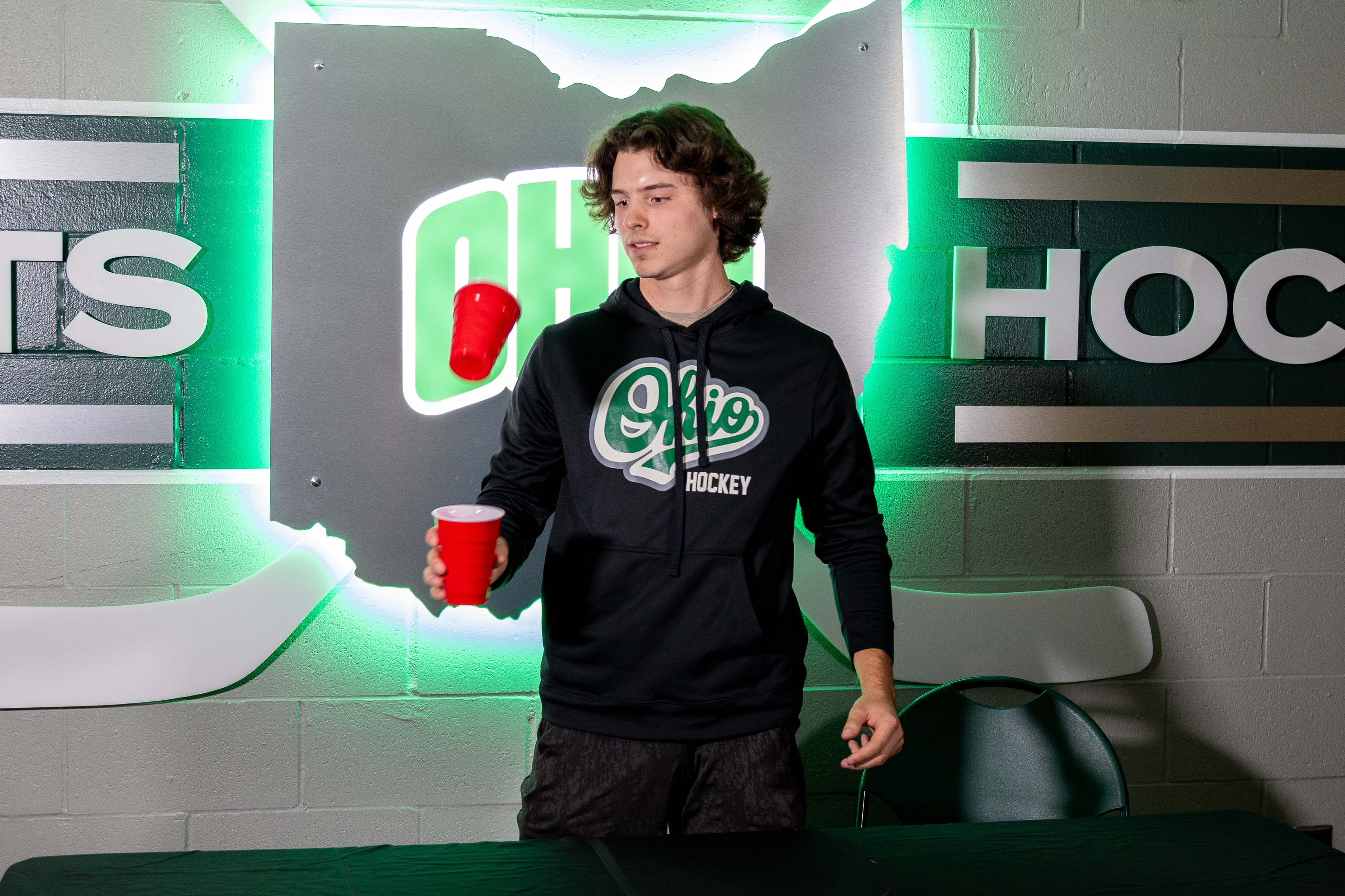 Ohio Bobcats Forward #25, Xander Danner, announces the starting lineup in the locker room before a game against Adrian at Arrington Ice Arena on October 23 2025.