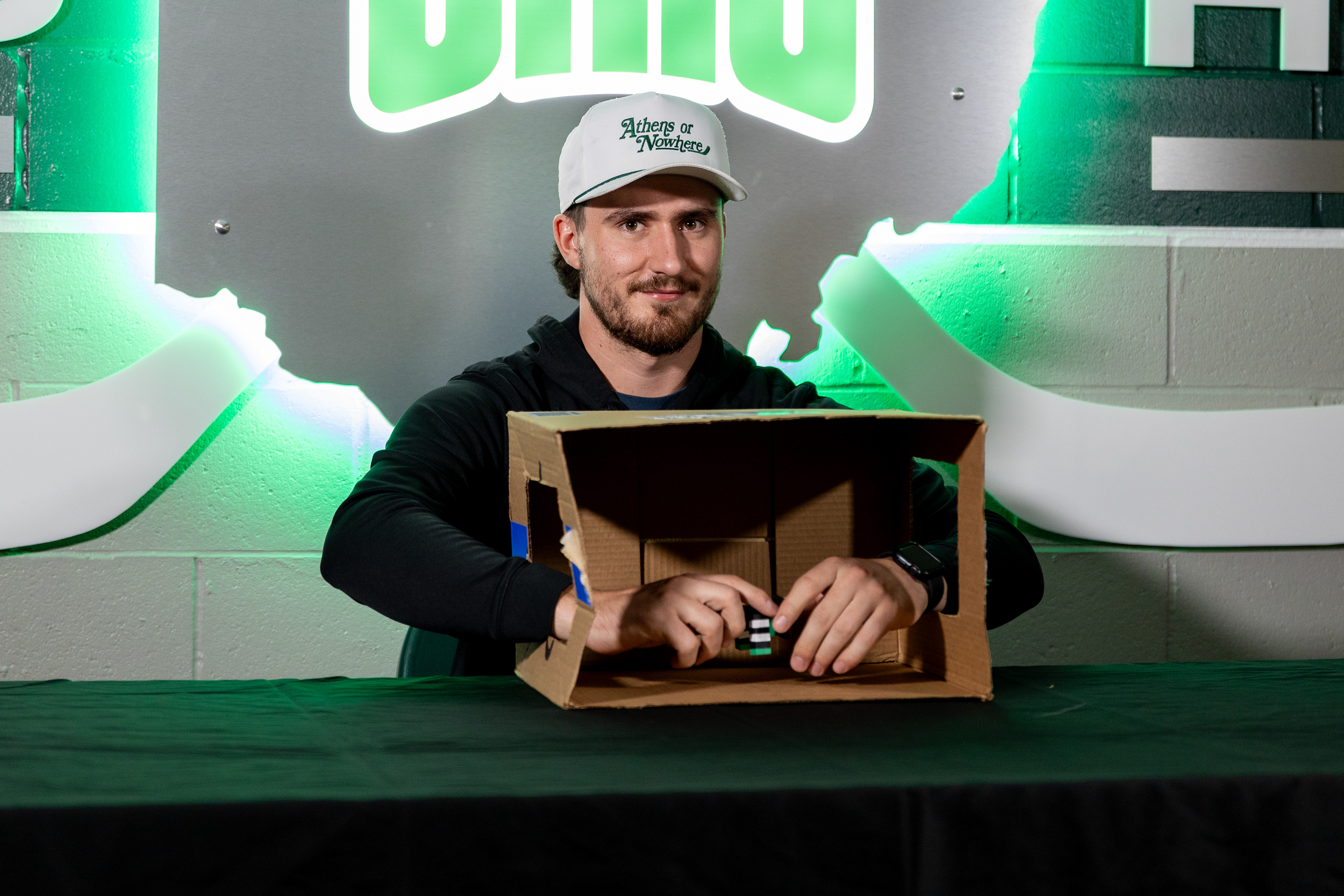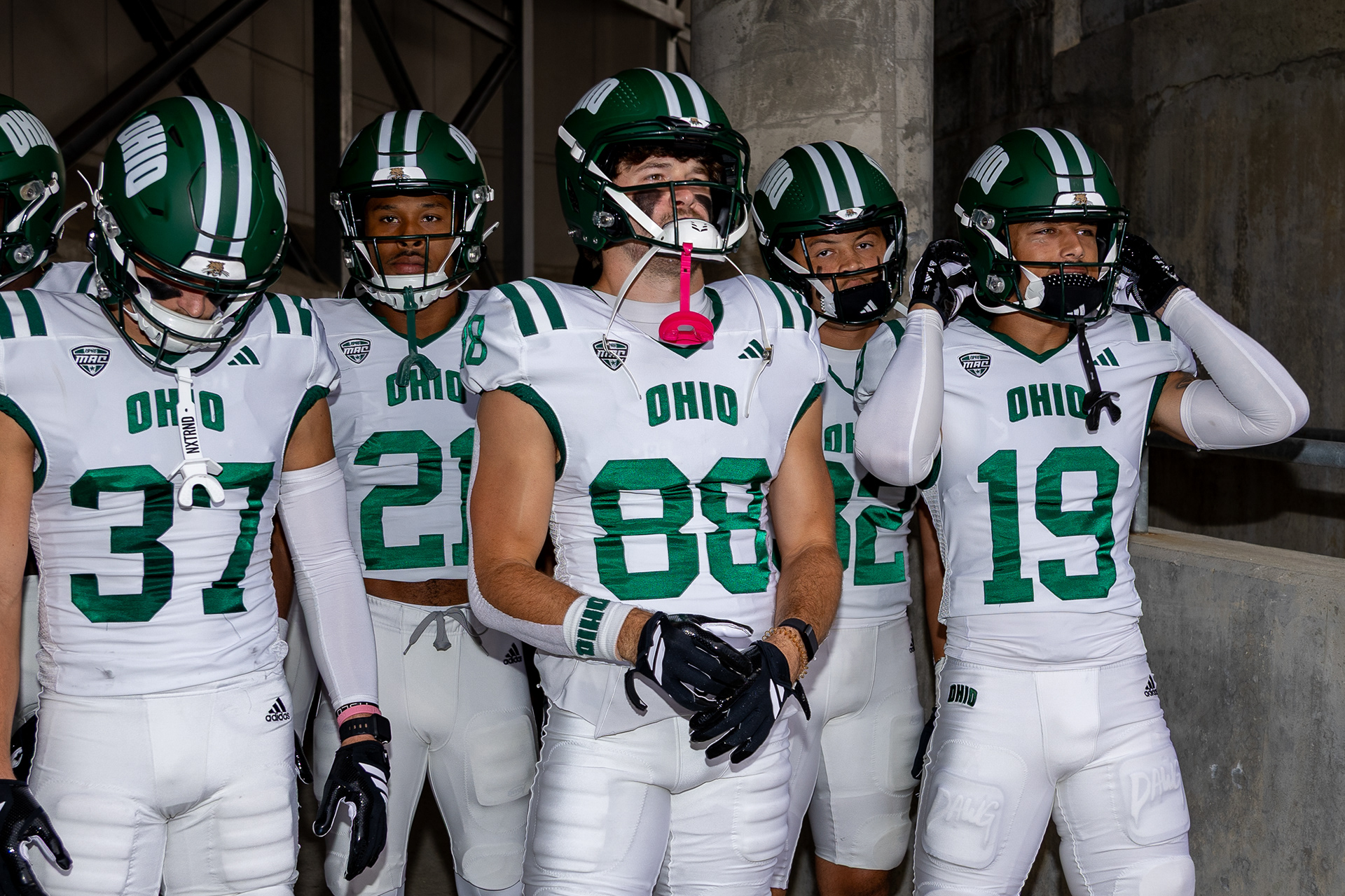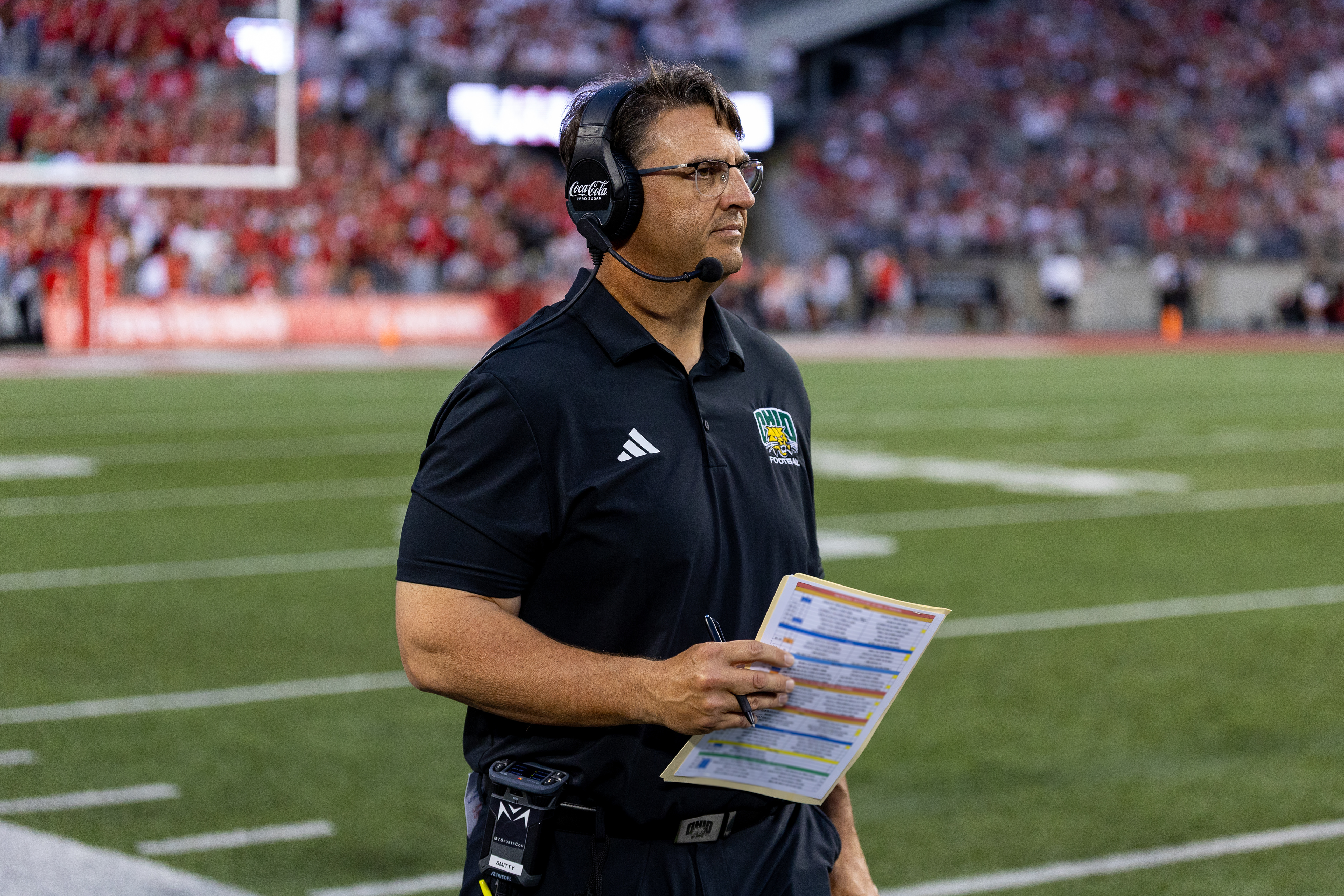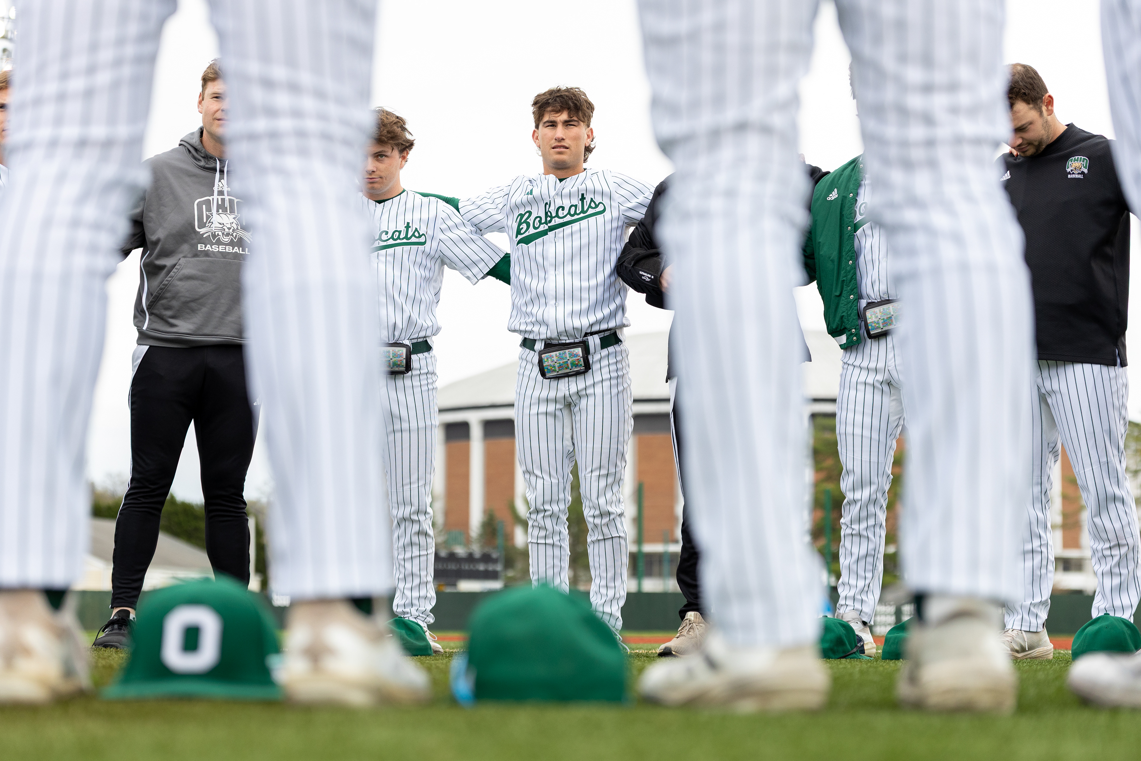 Ohio Bobcats Forward #25, Xander Danner, announces the starting lineup in the locker room before a game against Adrian at Arrington Ice Arena on October 23 2025.