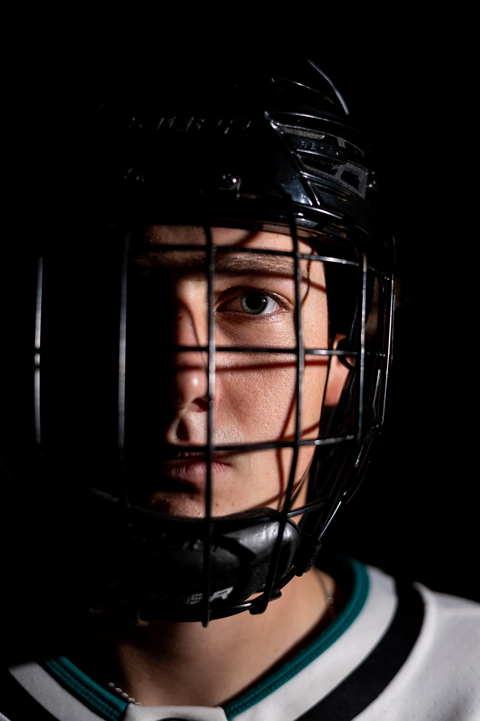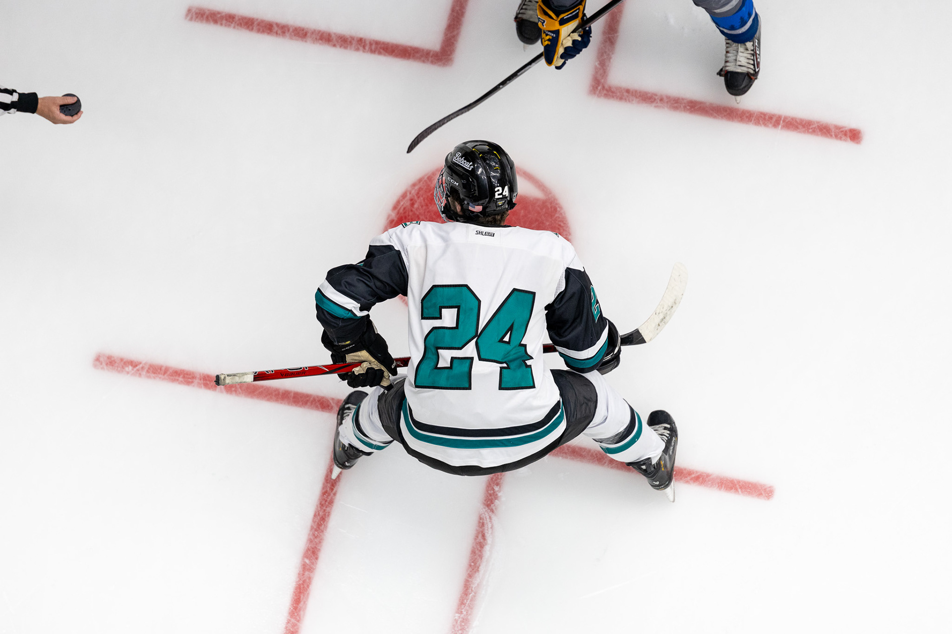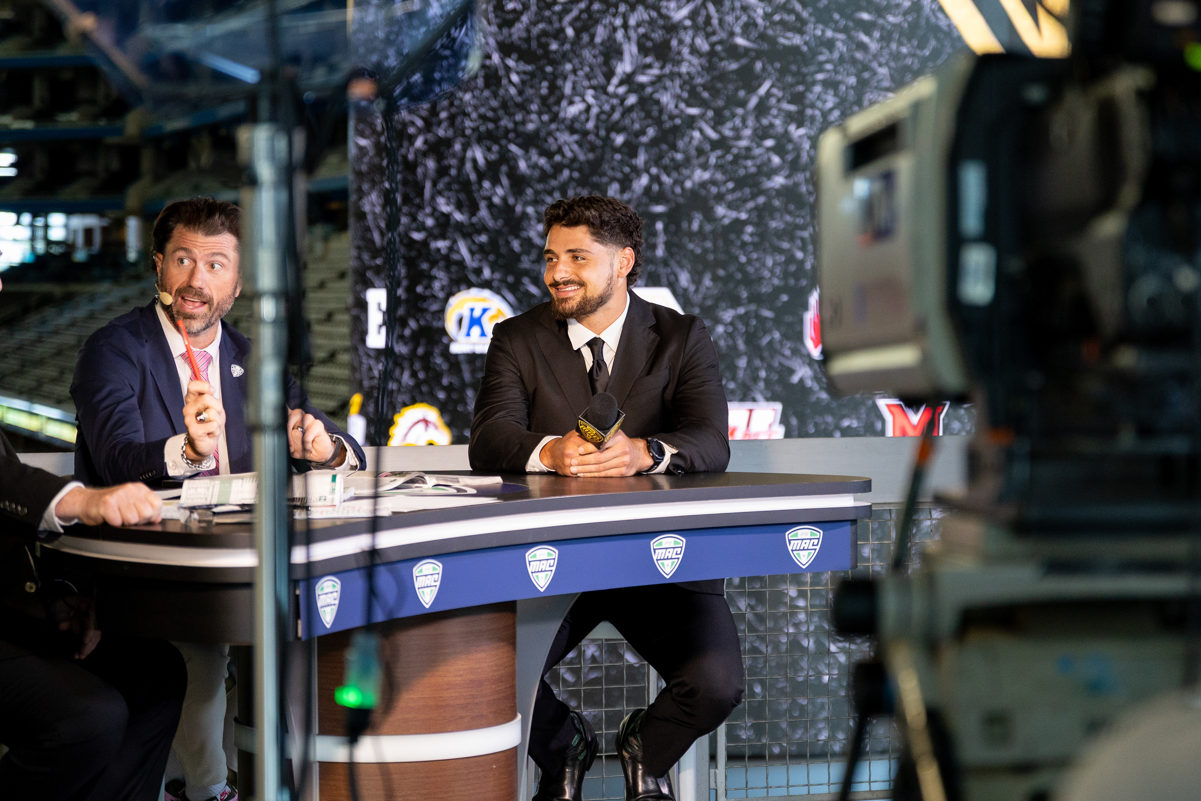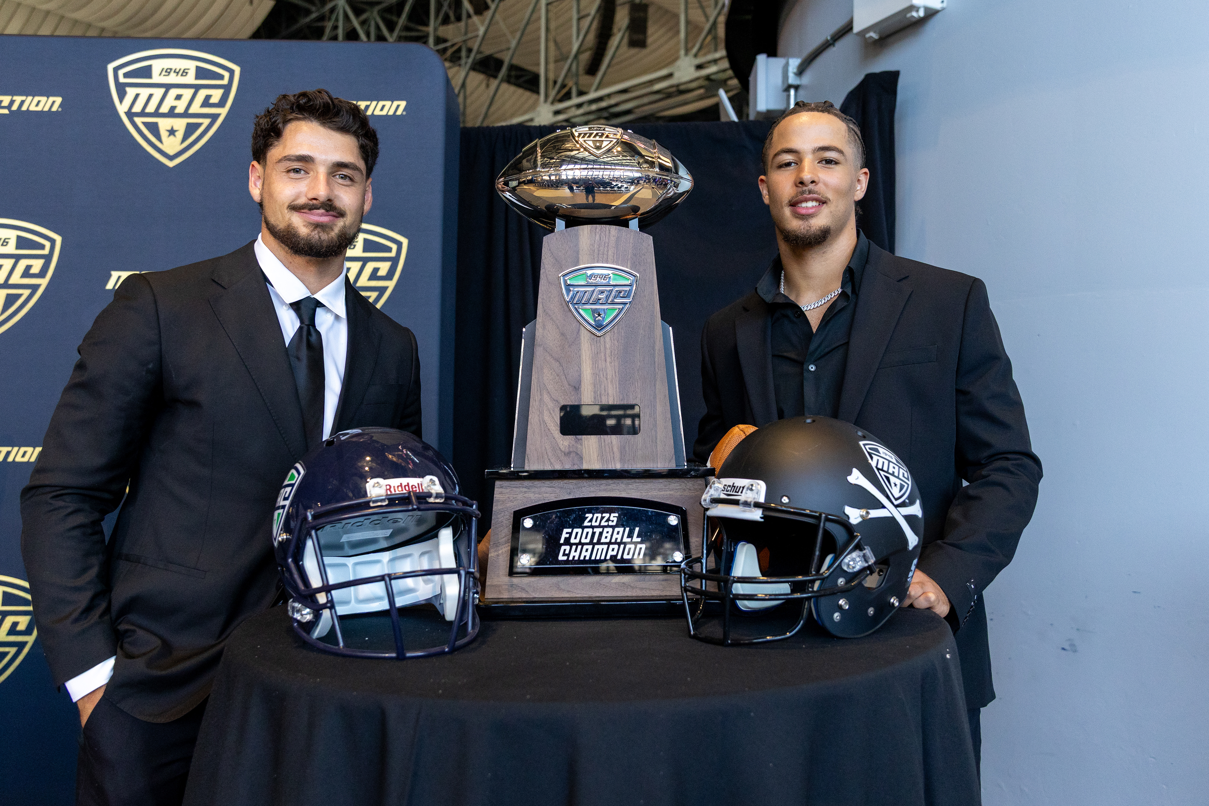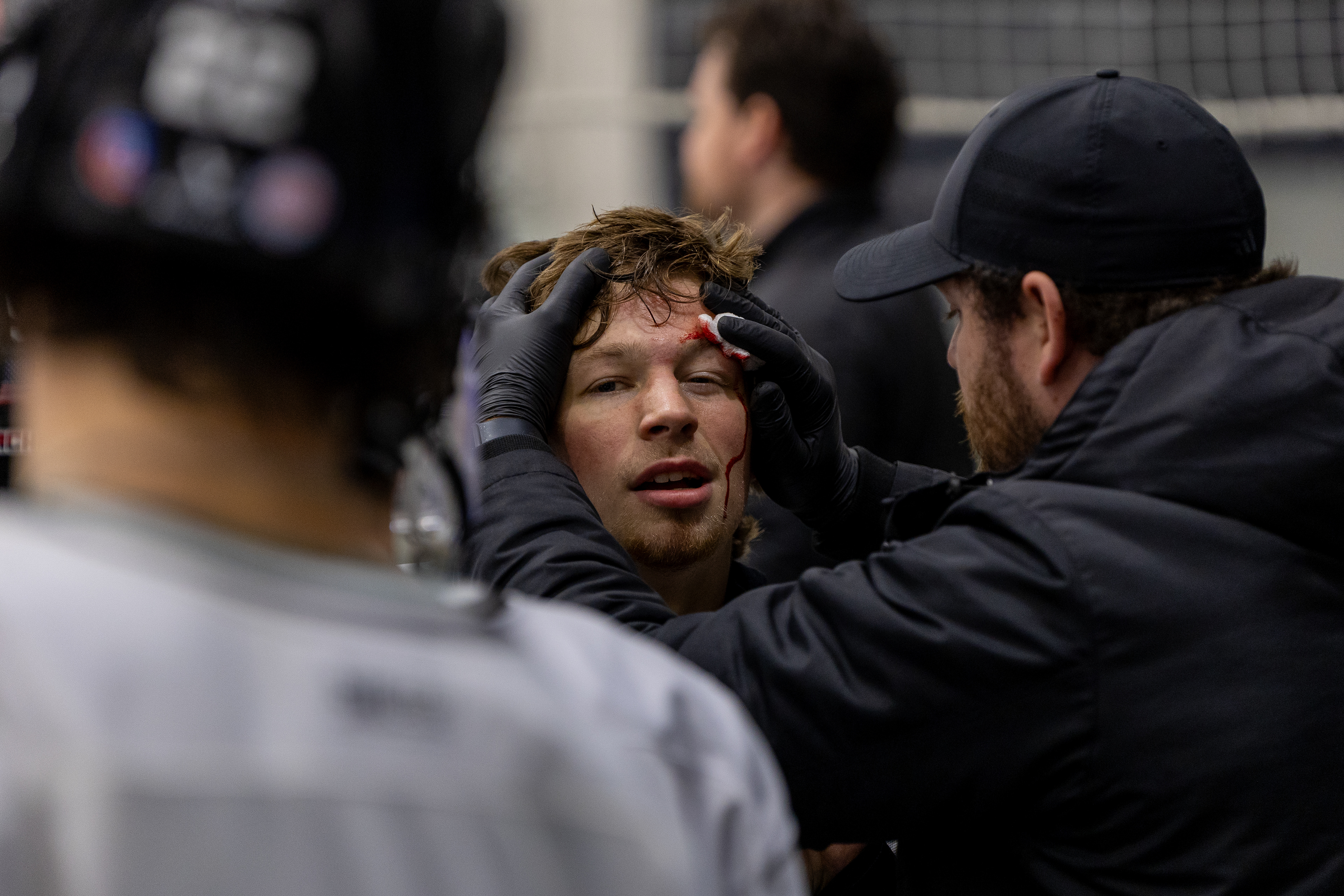 Ohio Bobcats Forward #25, Xander Danner, announces the starting lineup in the locker room before a game against Adrian at Arrington Ice Arena on October 23 2025.