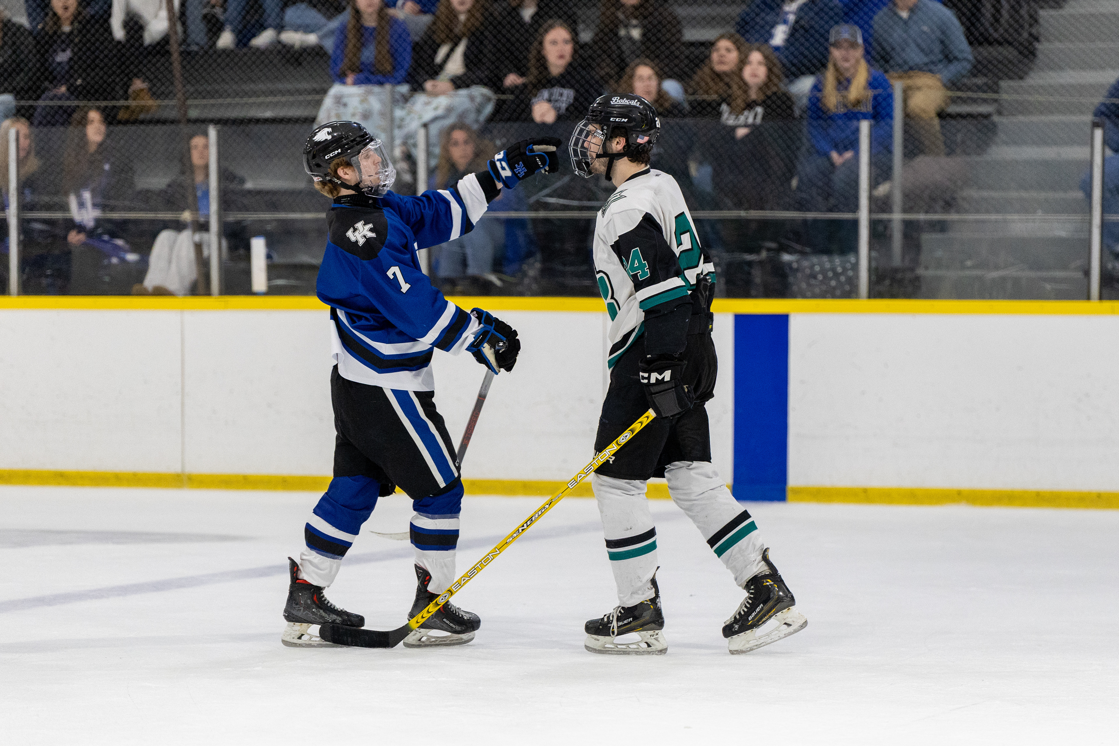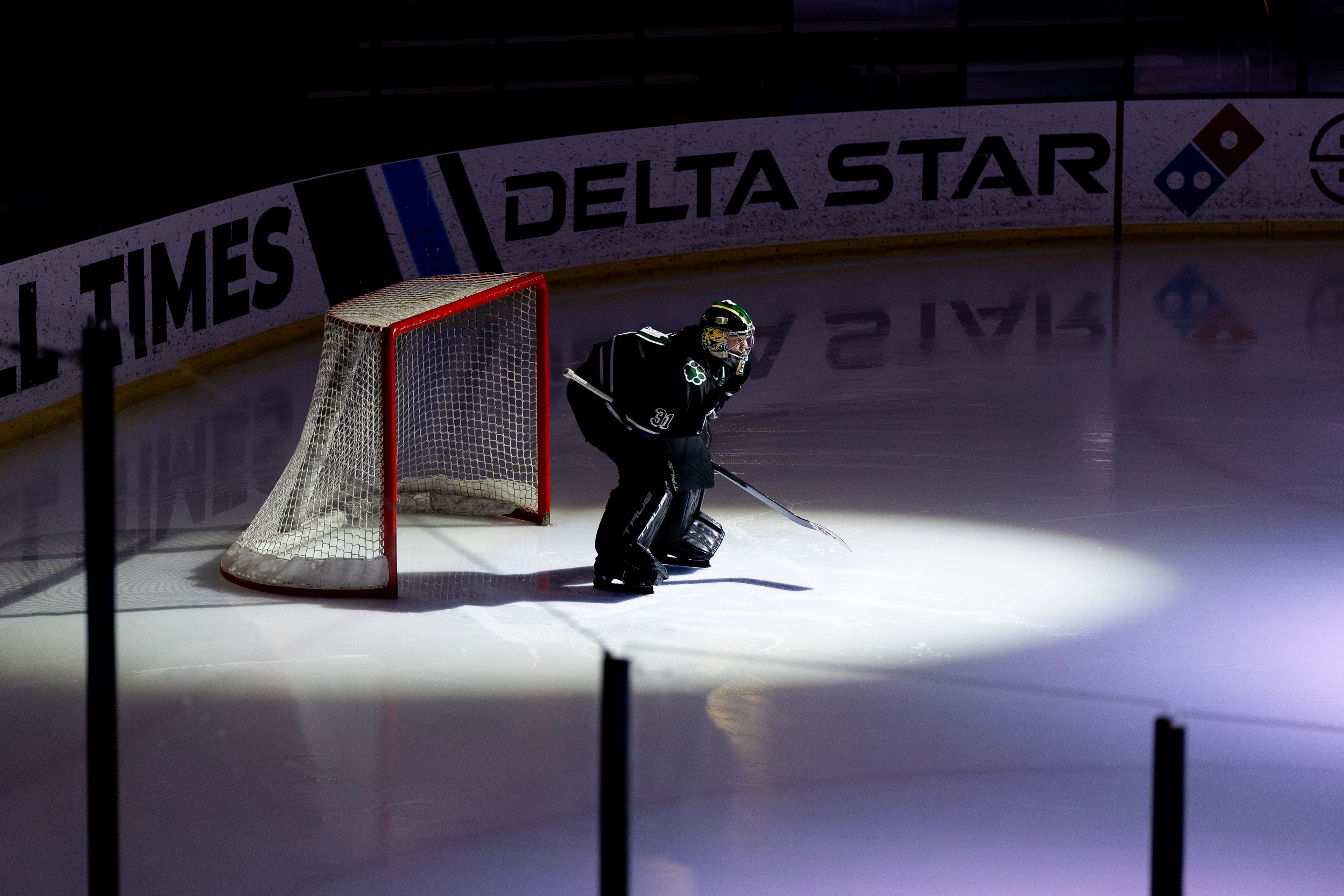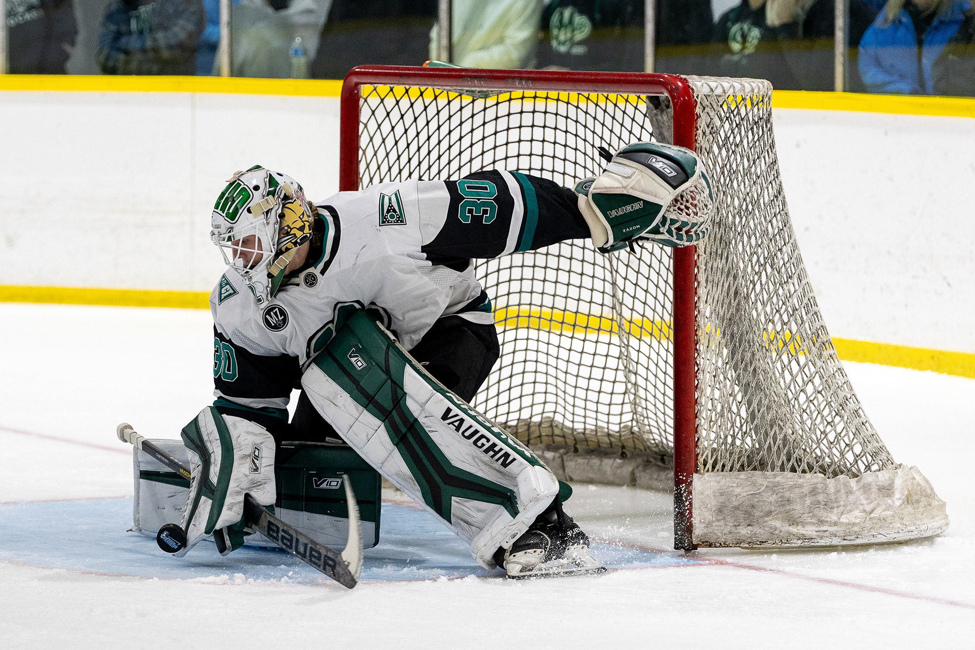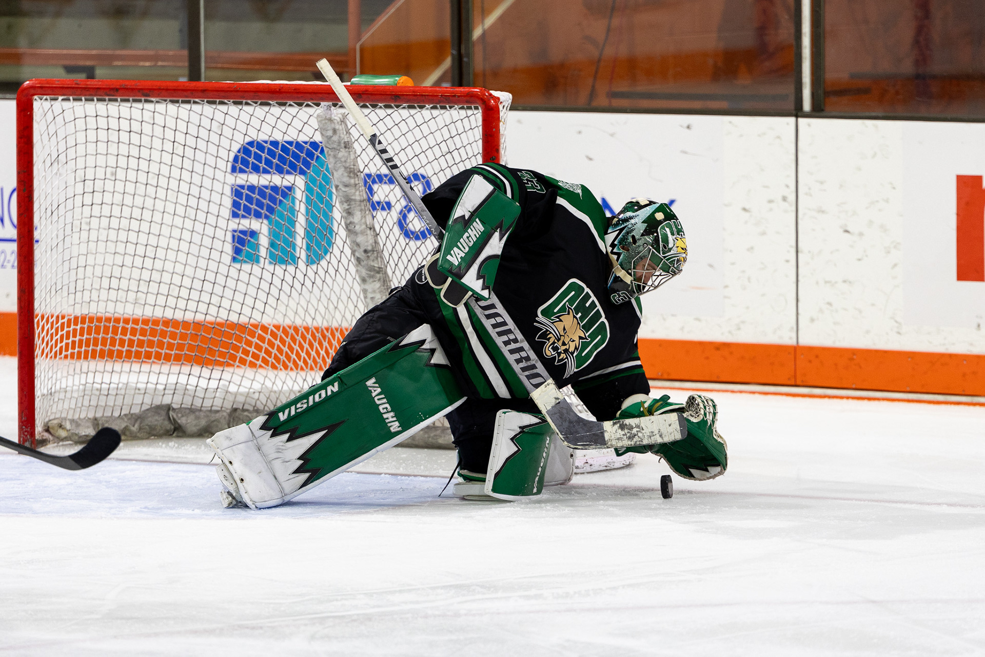 Ohio Bobcats #31, Austin Martin, blocks a shot at the second day of the 2026 ACHA SE Regionals tournament against Penn State in Heritage Bank Center on February 22 2026.