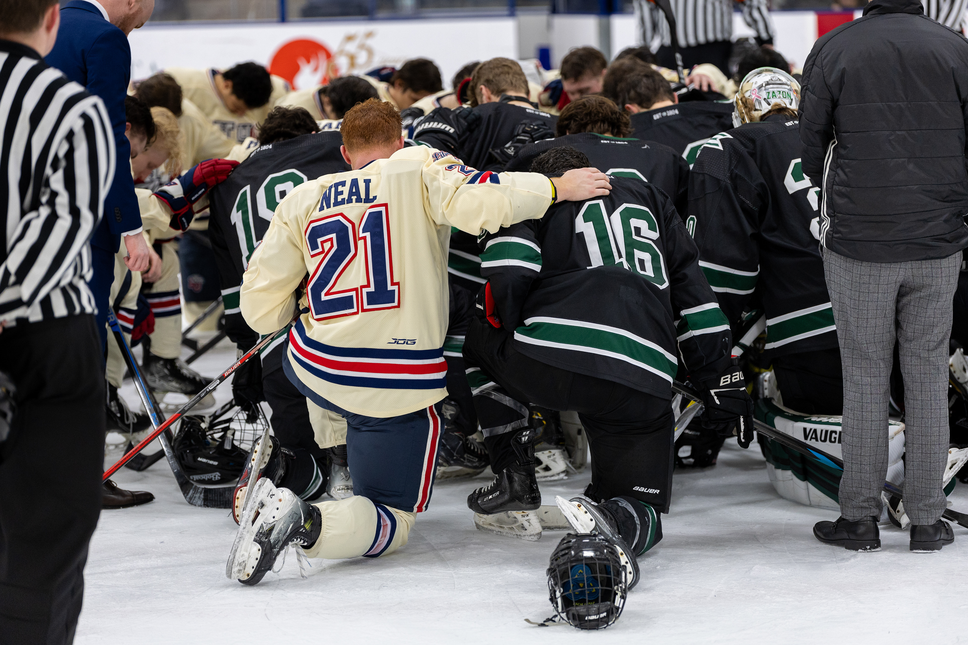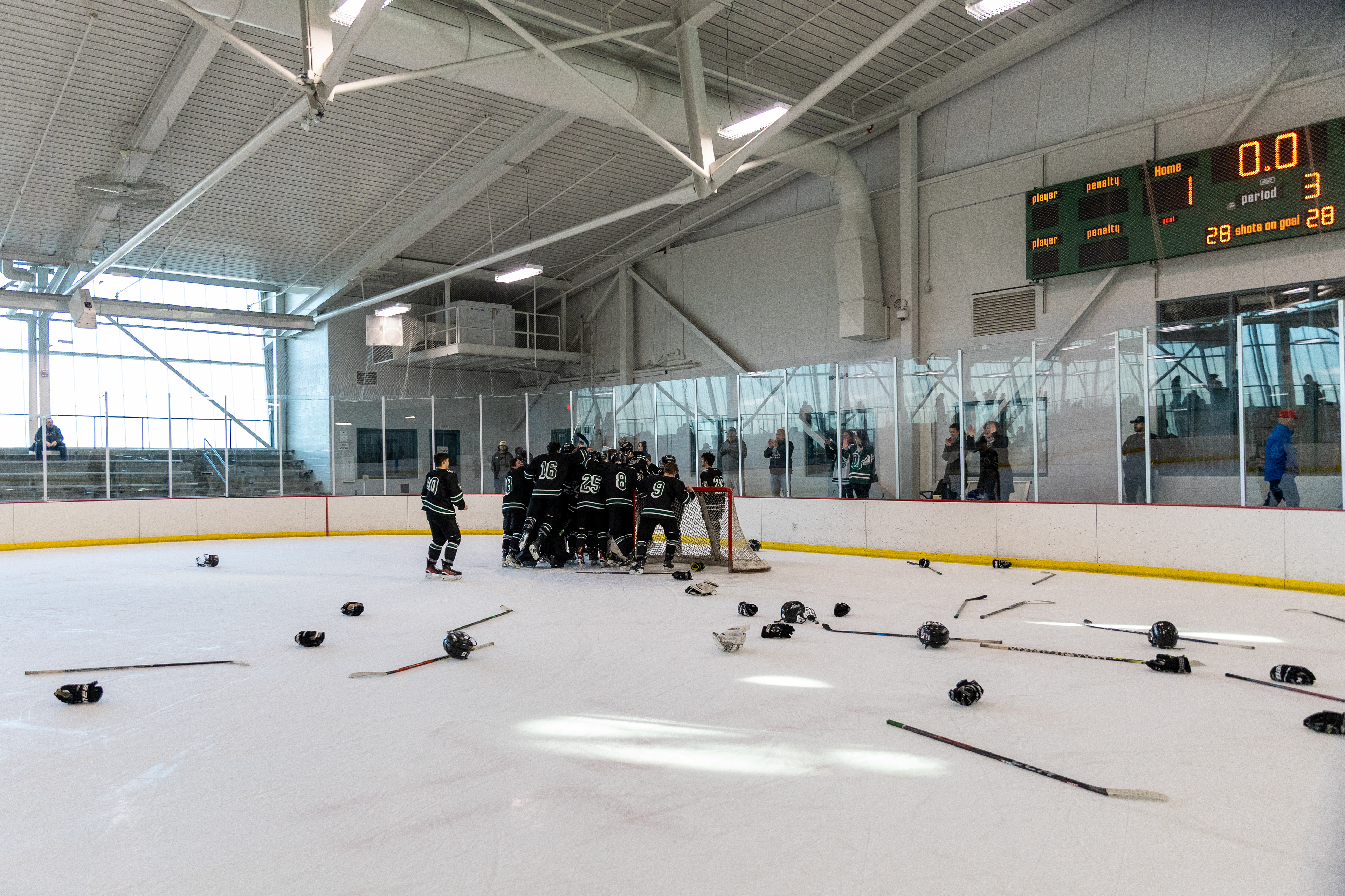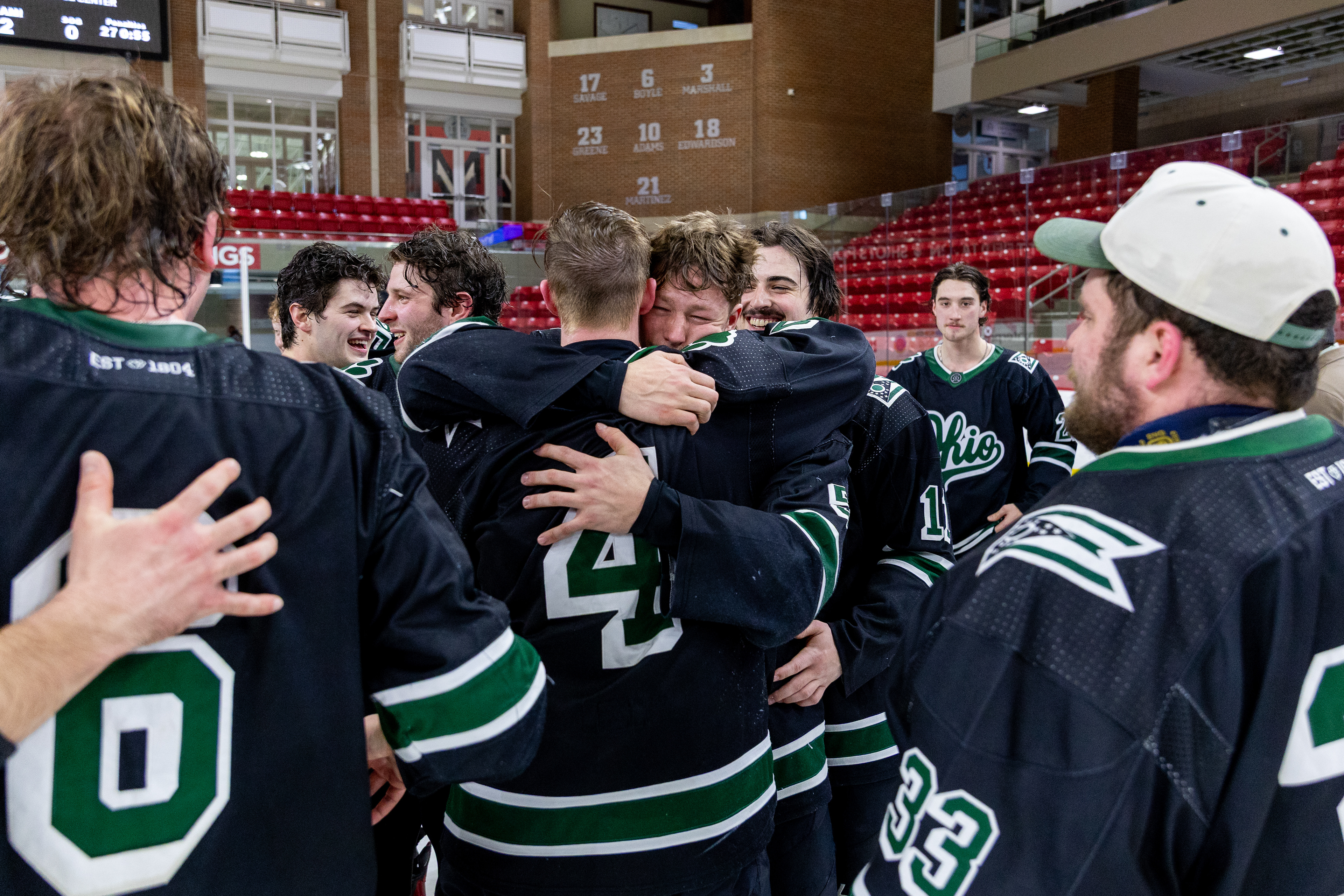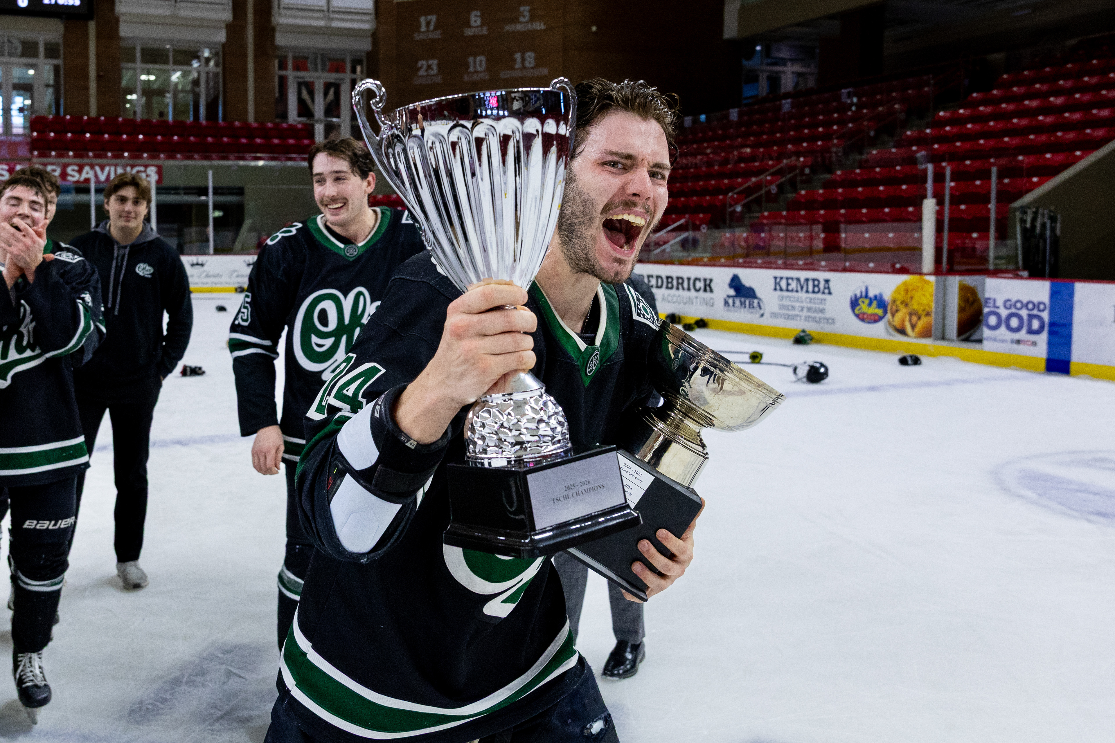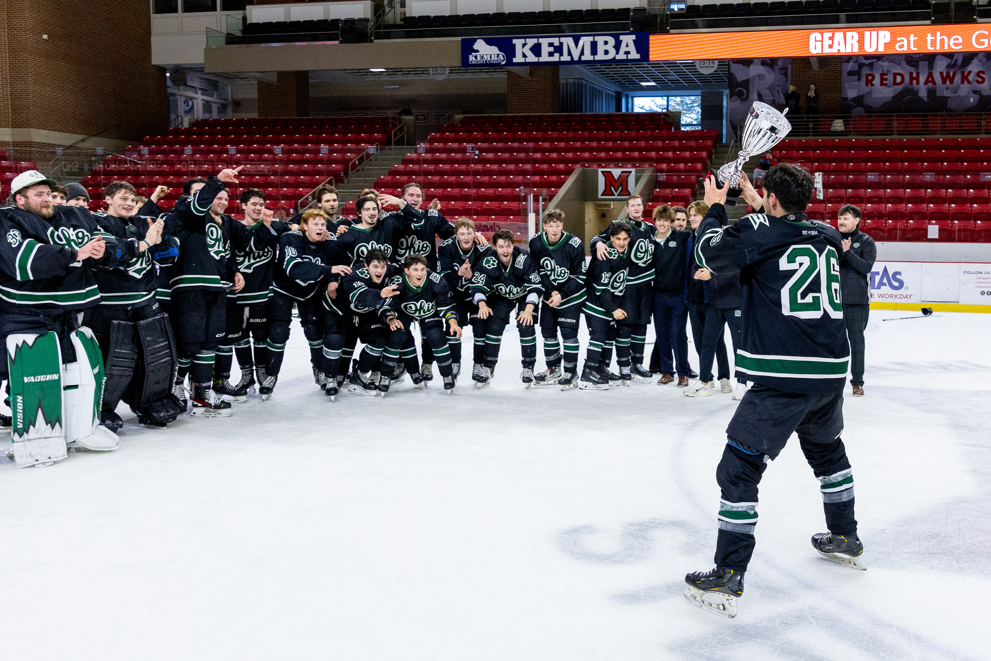 The 2025-26 Ohio University Division II Men's Ice Hockey team from Athens, OH poses for a photo after beating Miami University 6-2 to make them the 2026 TSCHL Champions. Photo taken at Goggin Ice Center in Oxford, OH on February 10 2026.