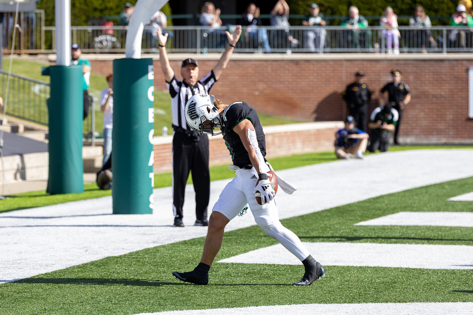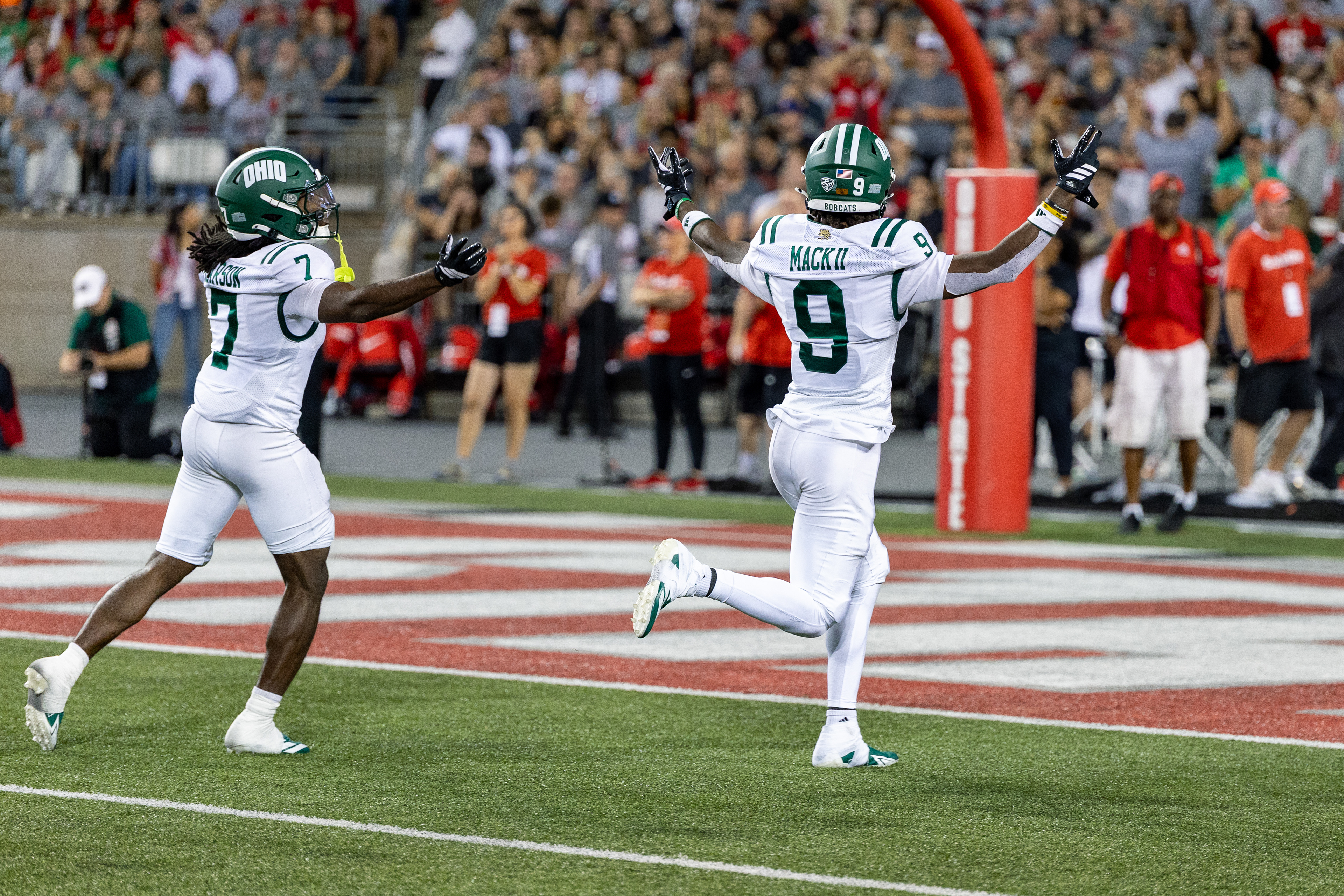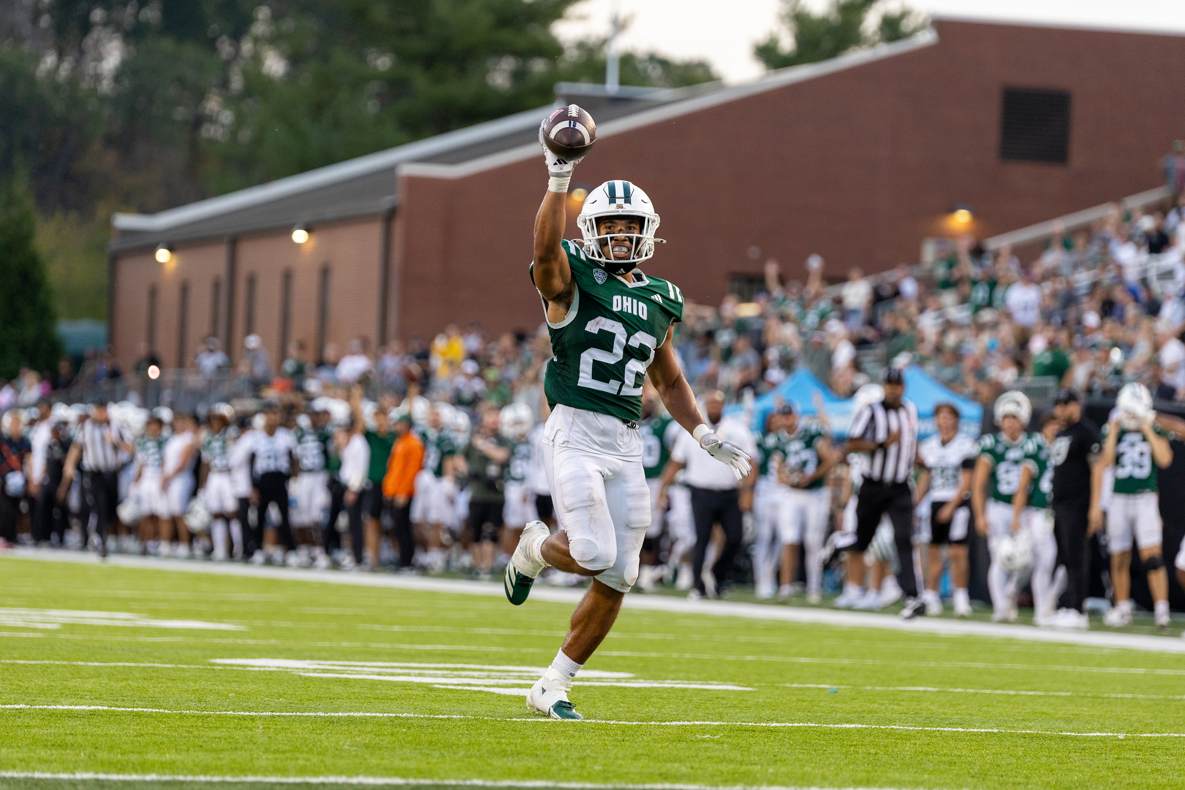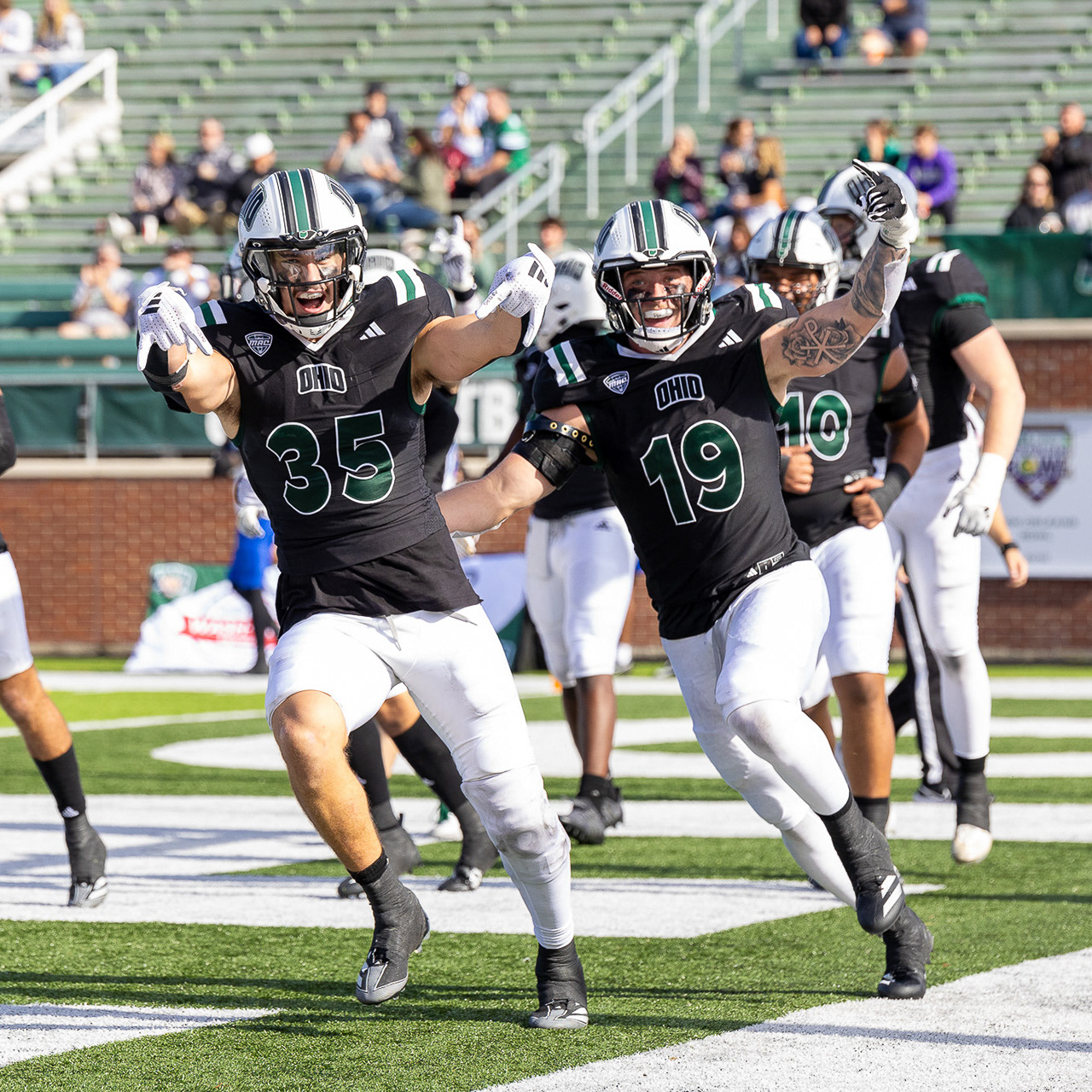 Ohio Bobcats #6, Coleman Owens, celebrates after a touchdown against the Buffalo Bulls at Peden Stadium on October 26 2024.