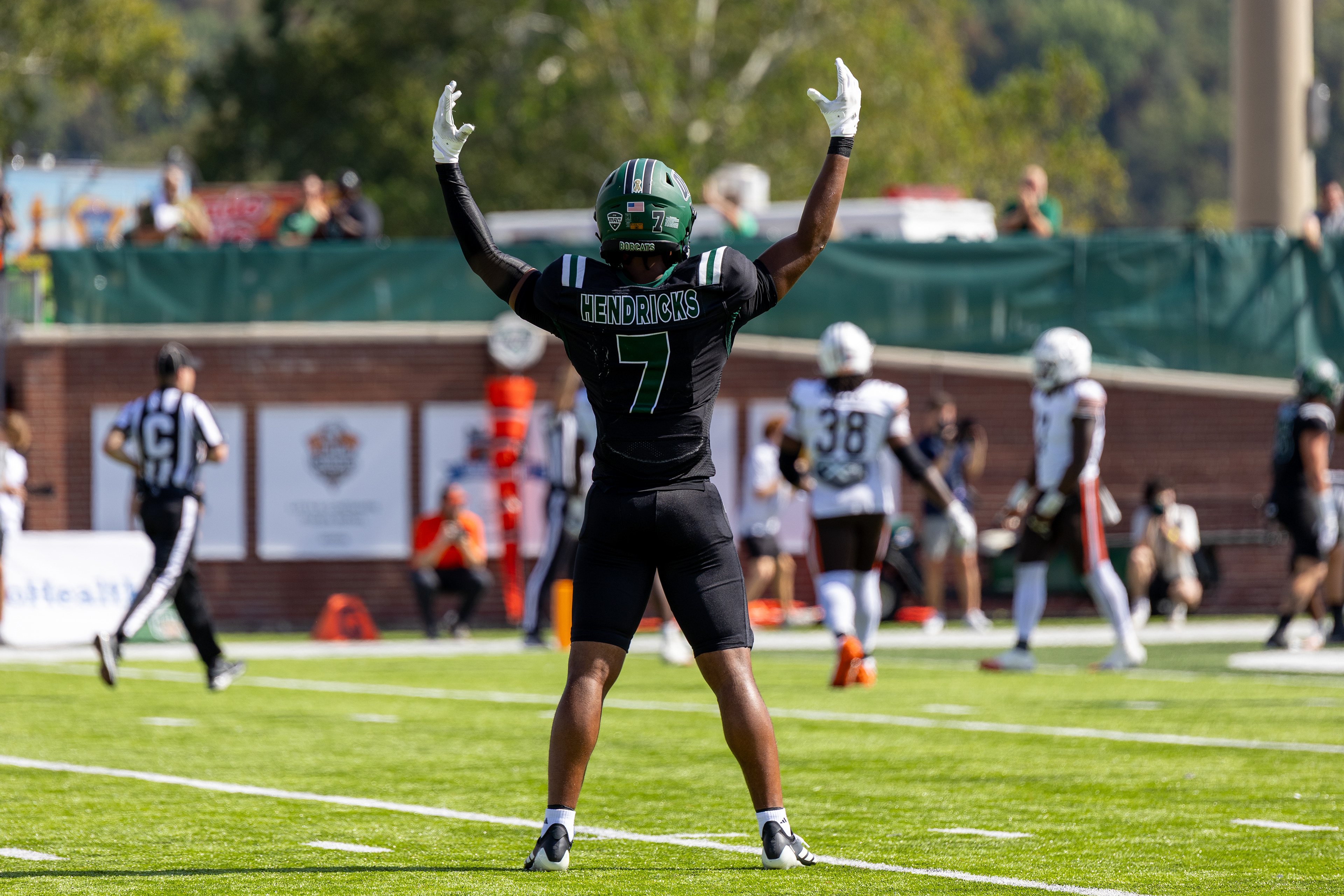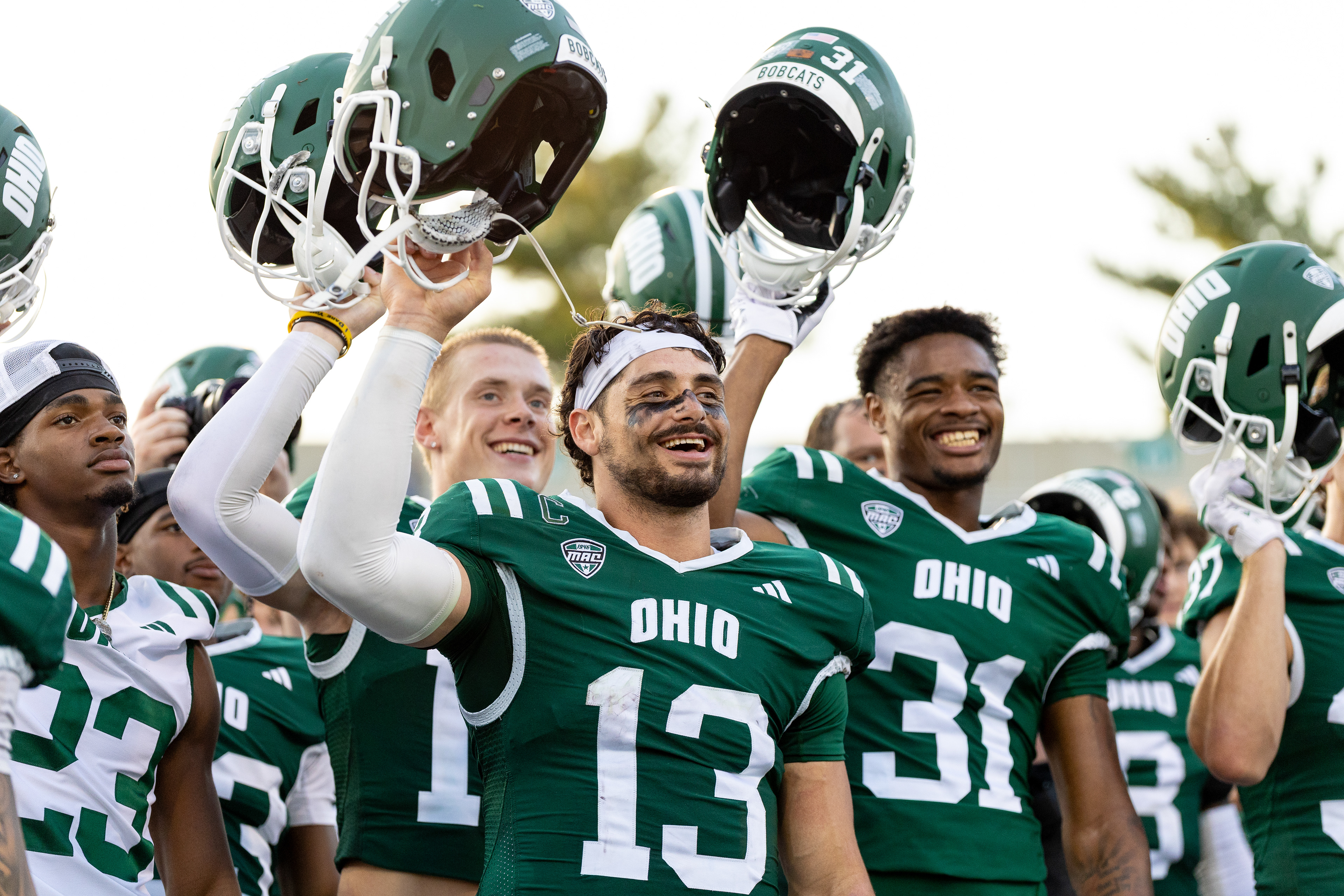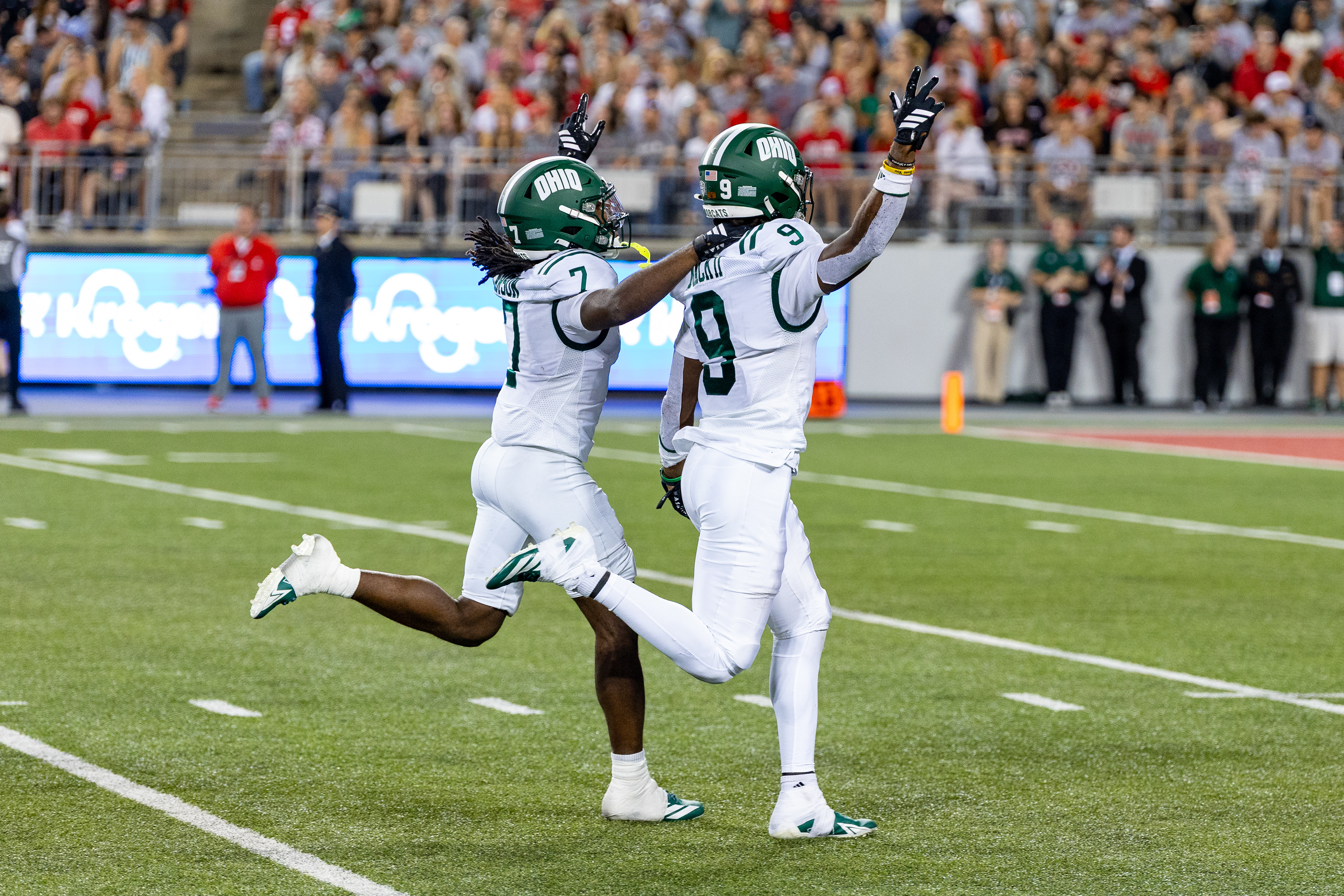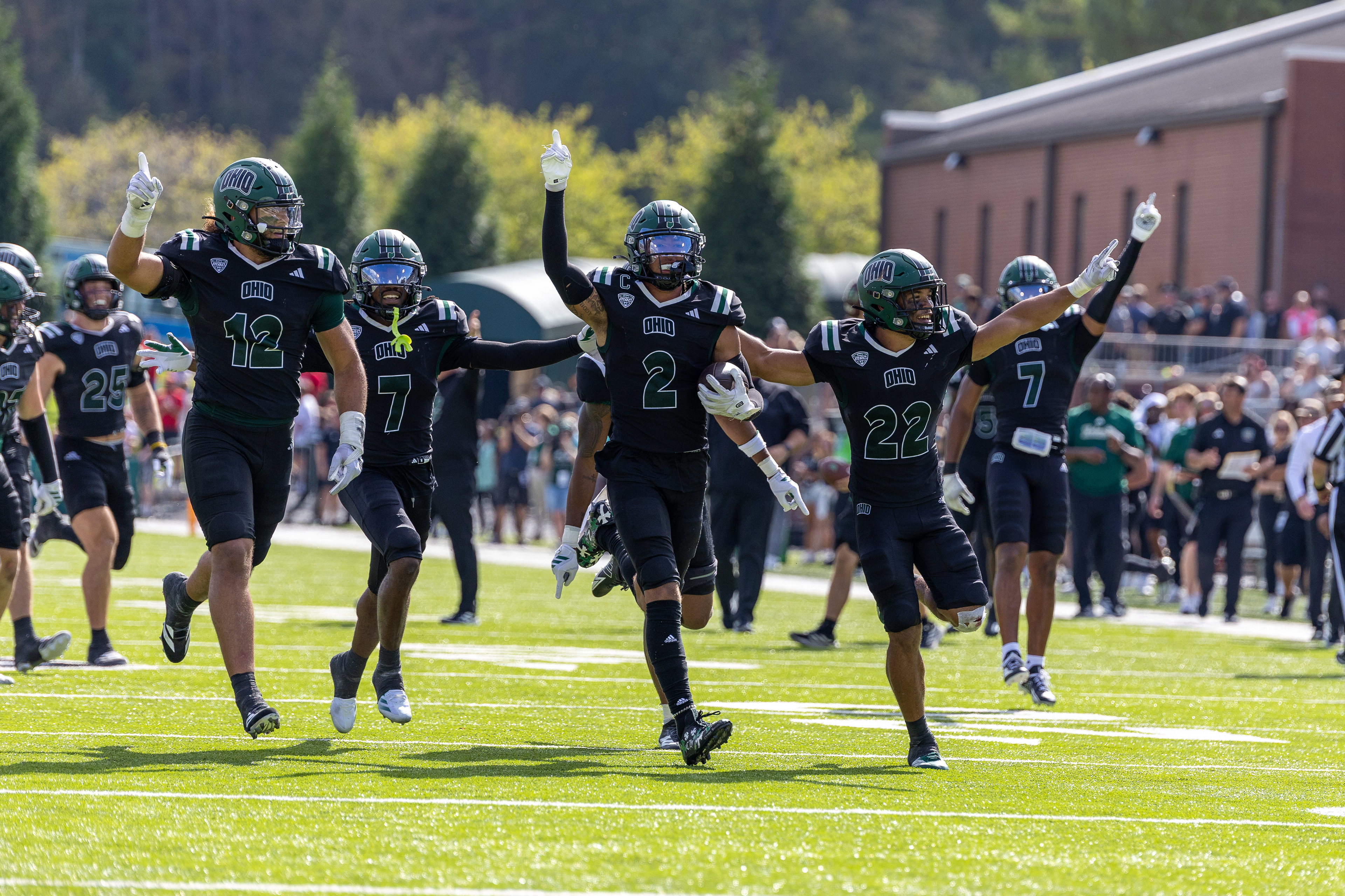 Ohio Bobcats #6, Coleman Owens, celebrates after a touchdown against the Buffalo Bulls at Peden Stadium on October 26 2024.