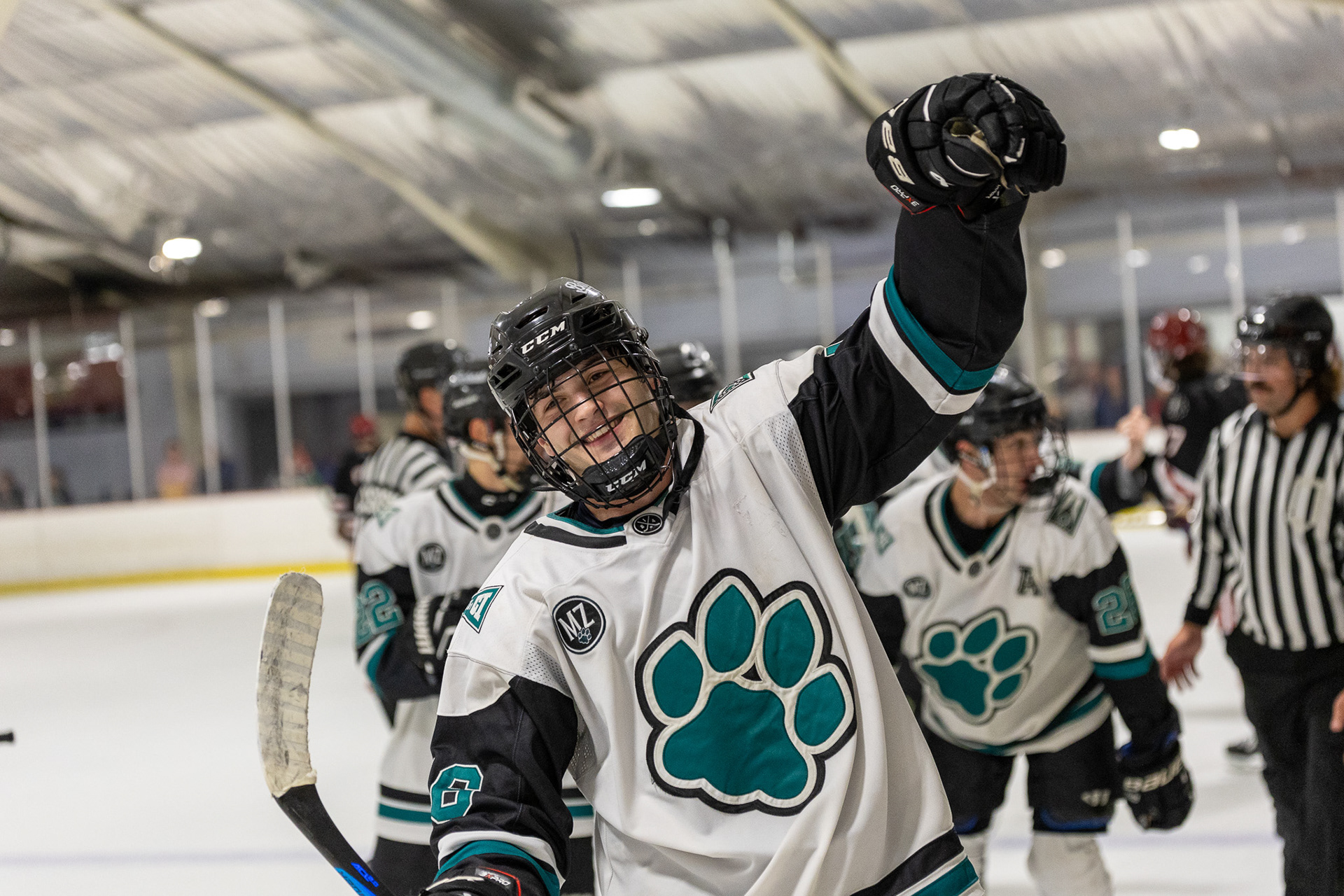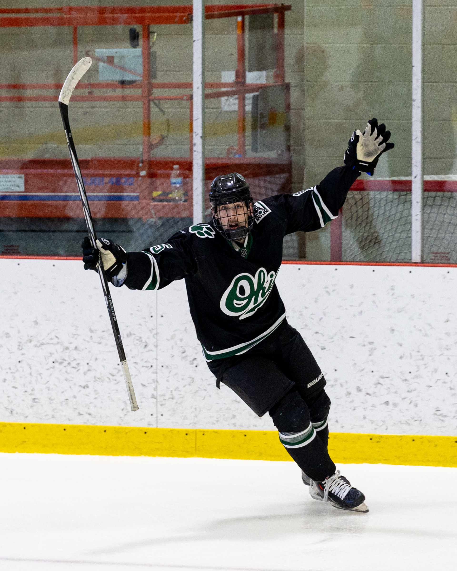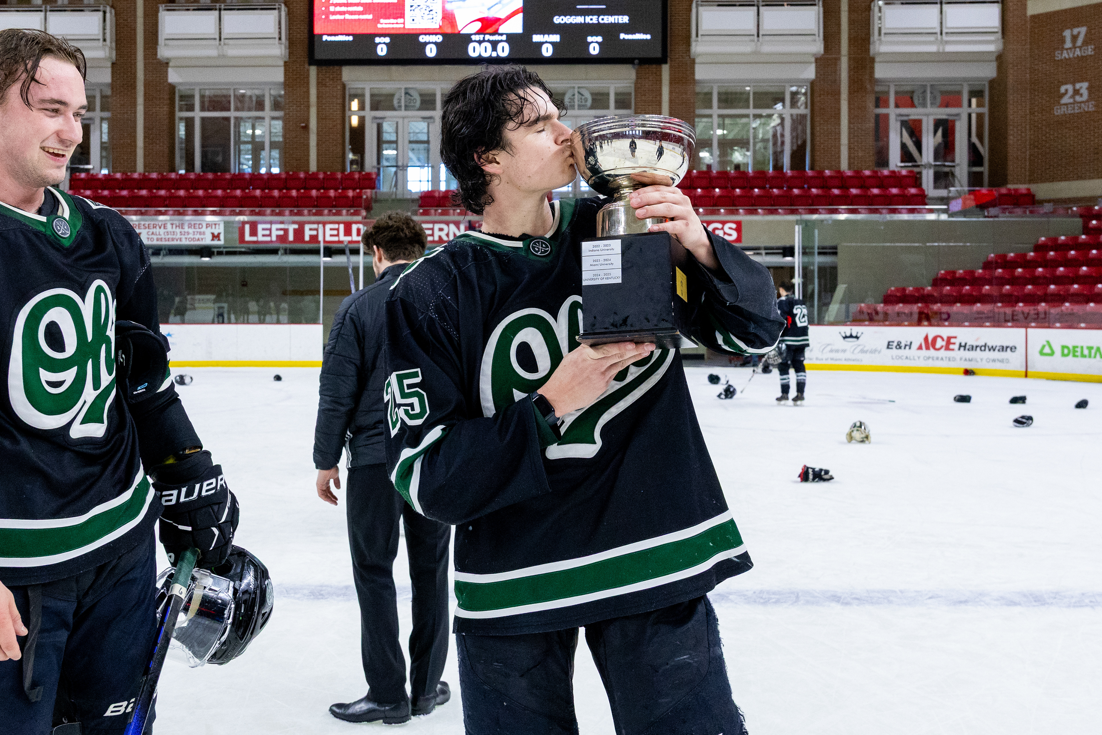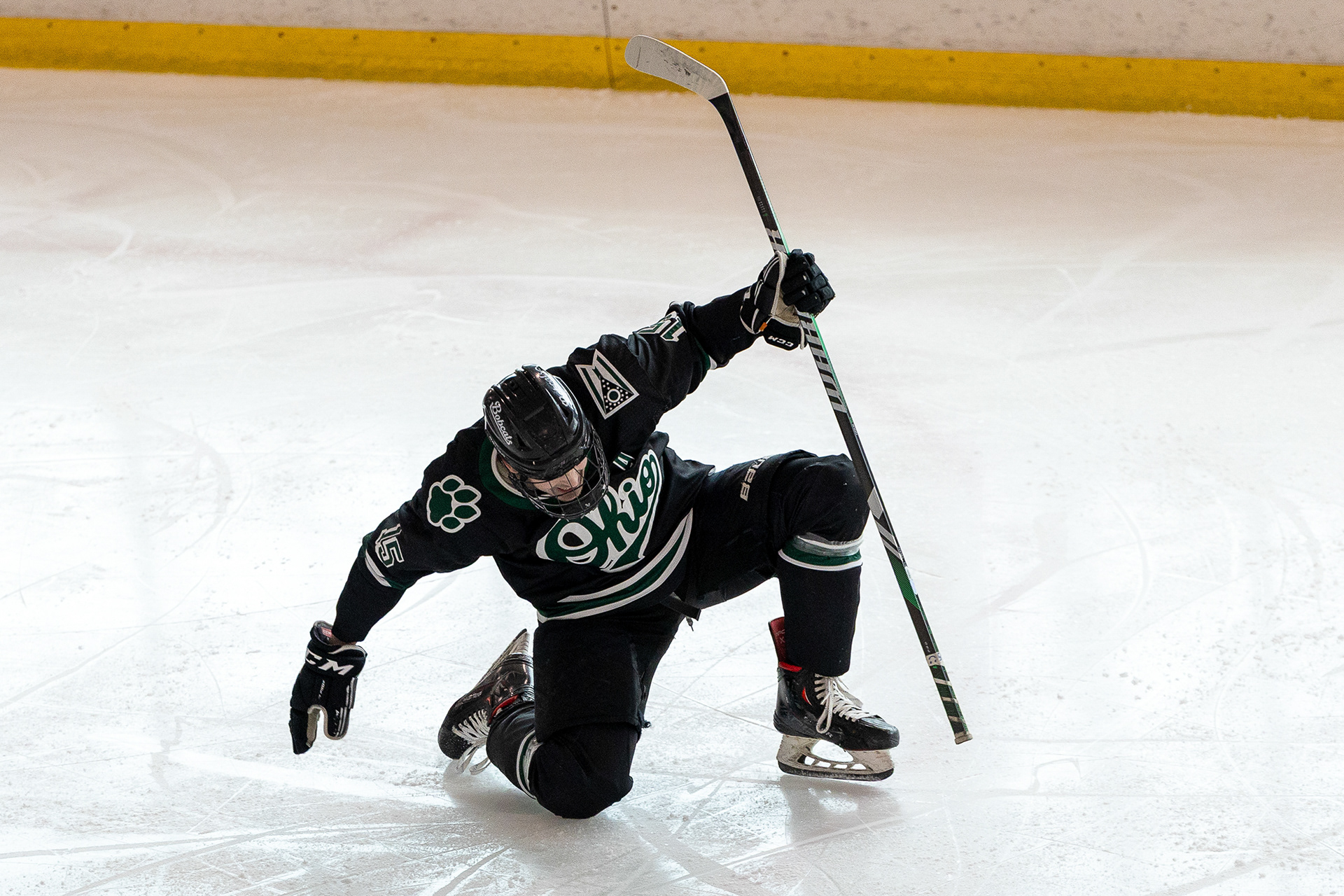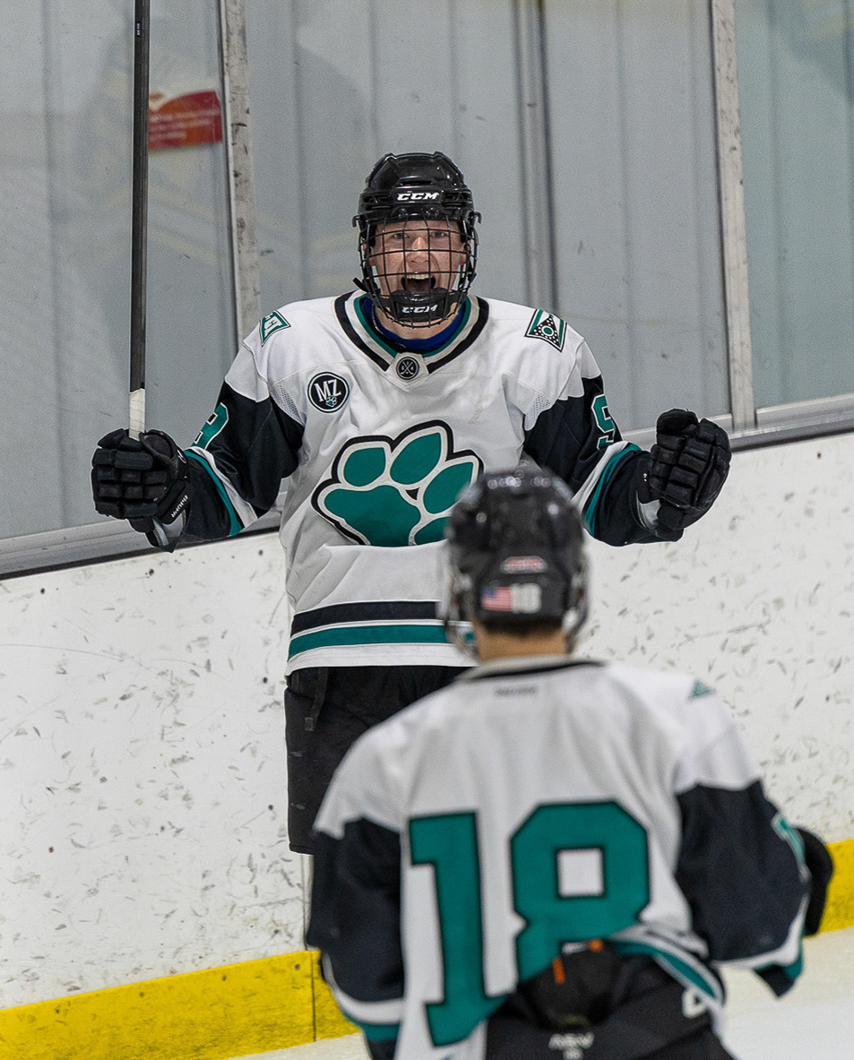 Ohio Bobcats Forward #17, Laker Aldridge, celebrates after scoring a goal against Maryville at Bird Ice Arena on November 14 2025.