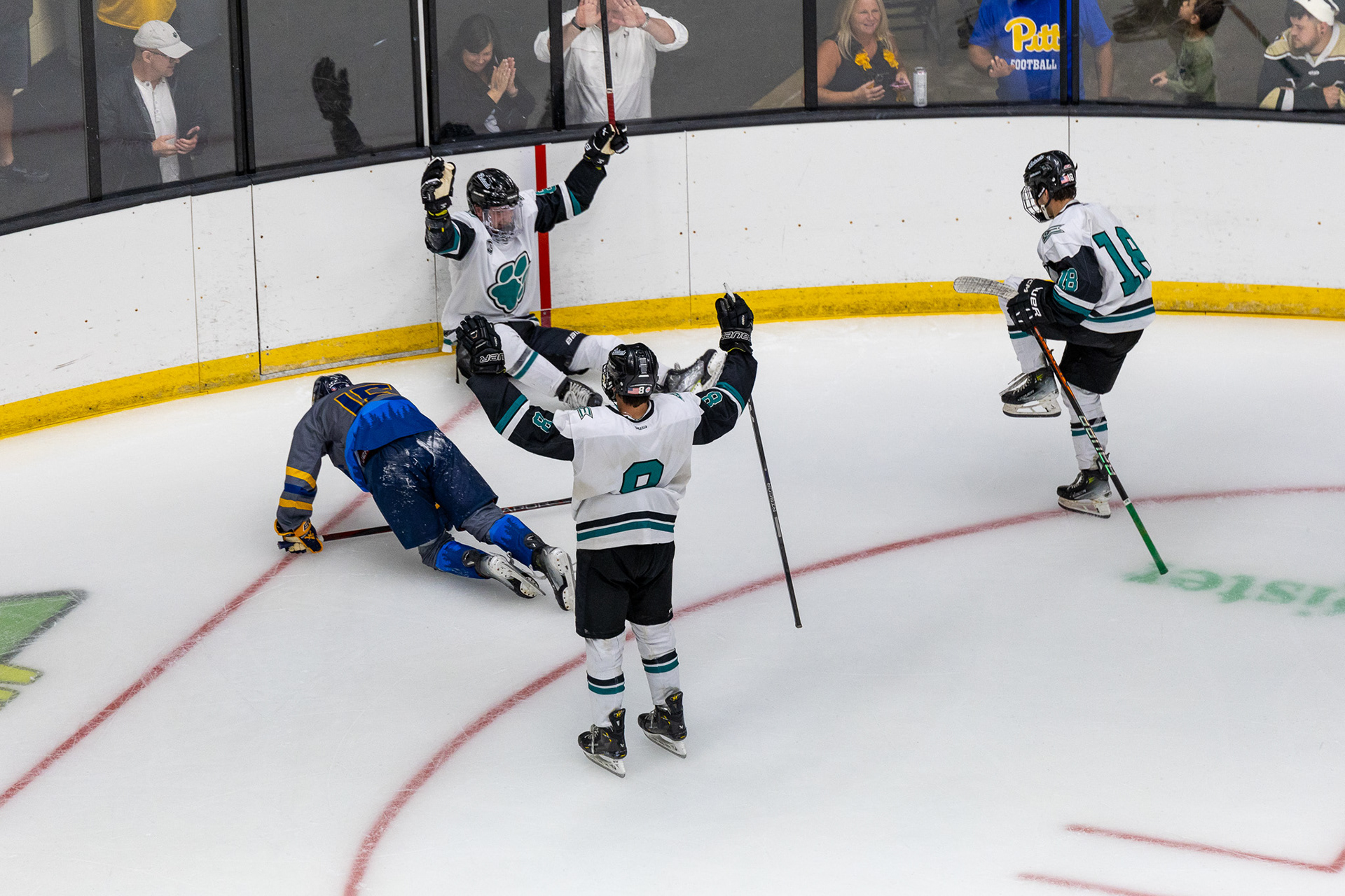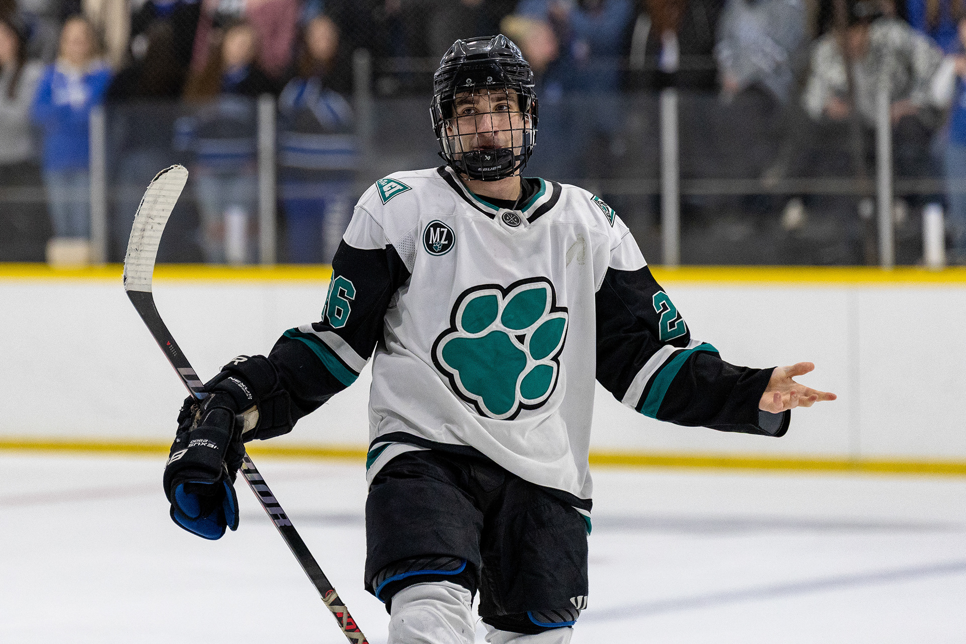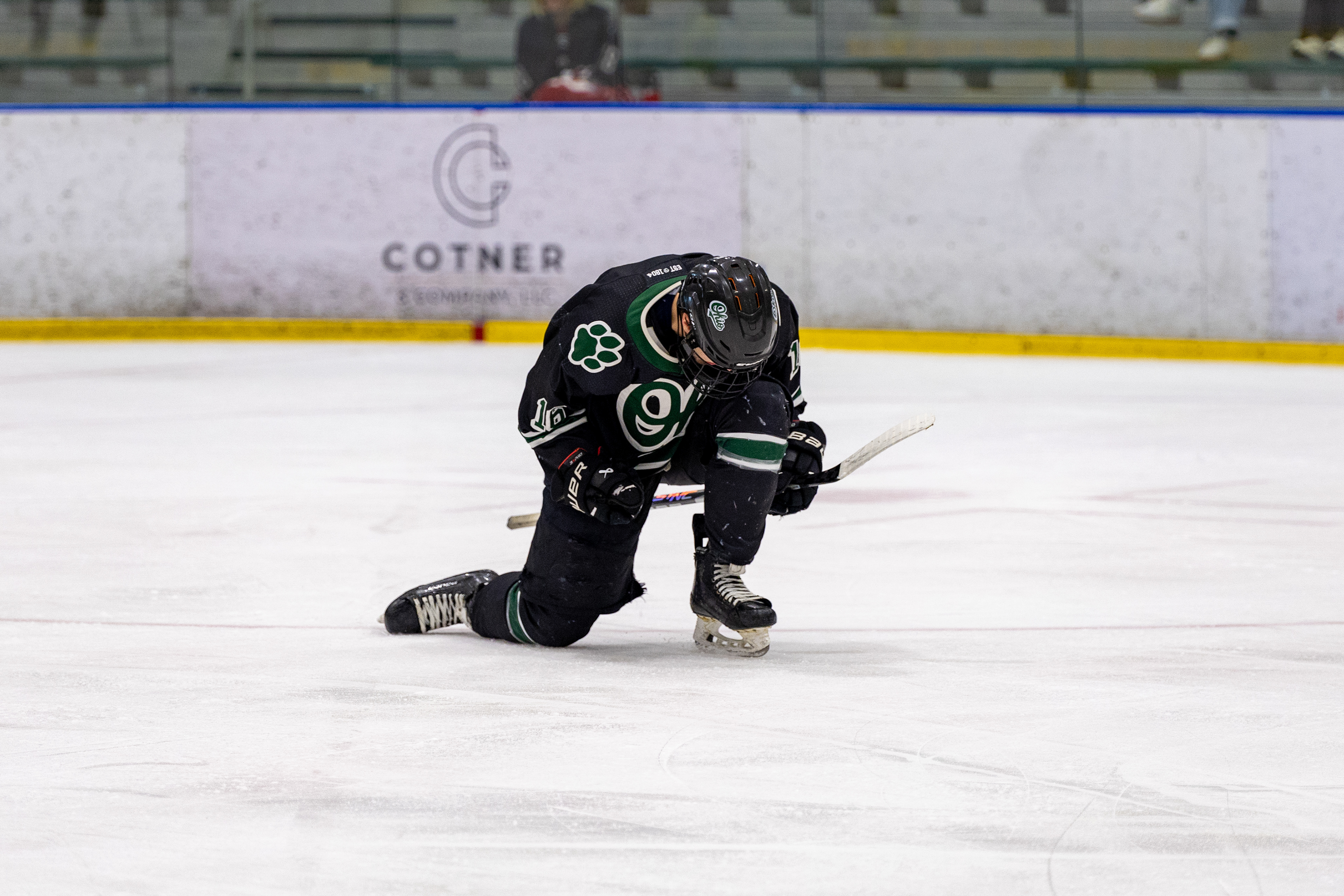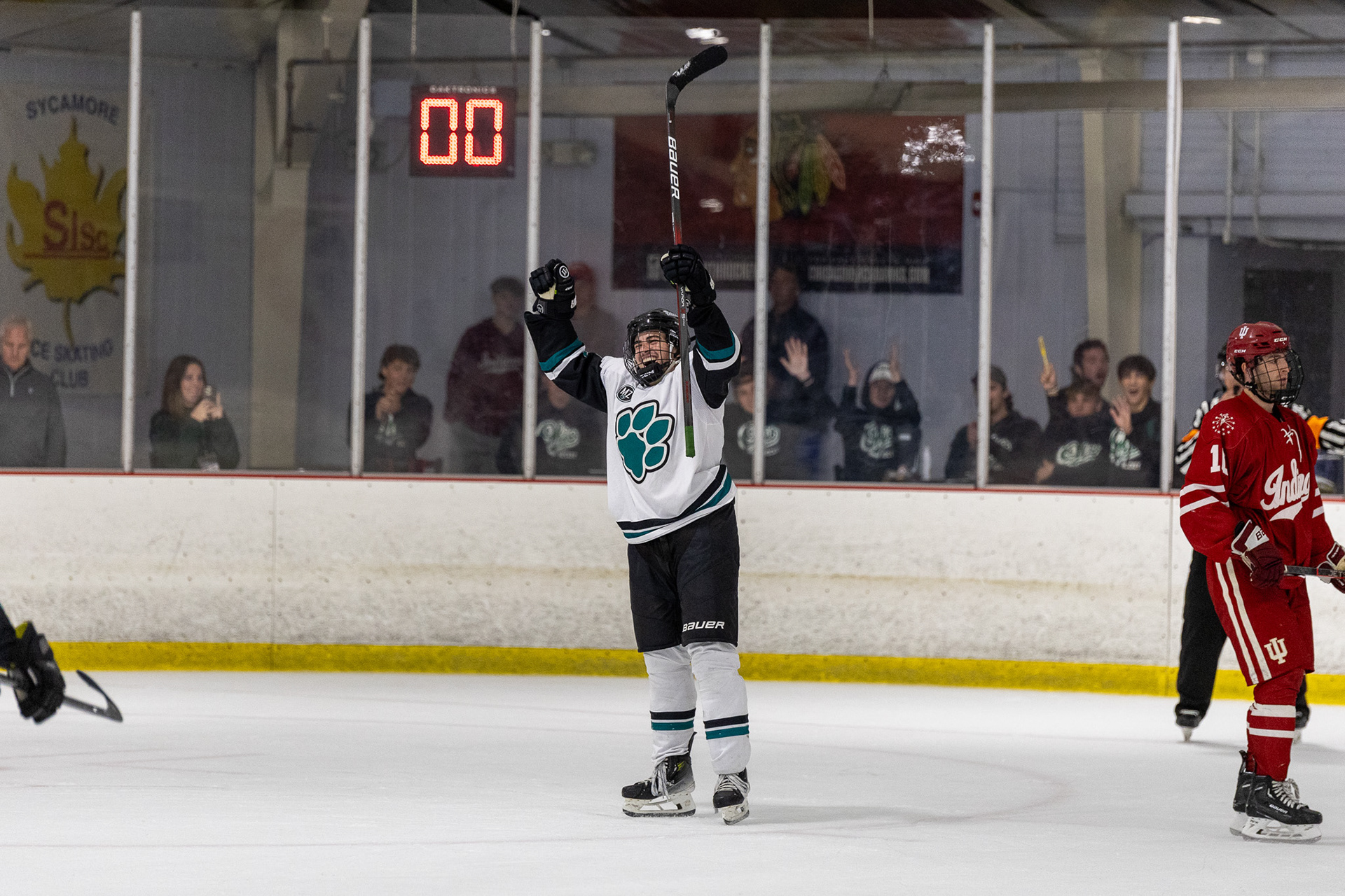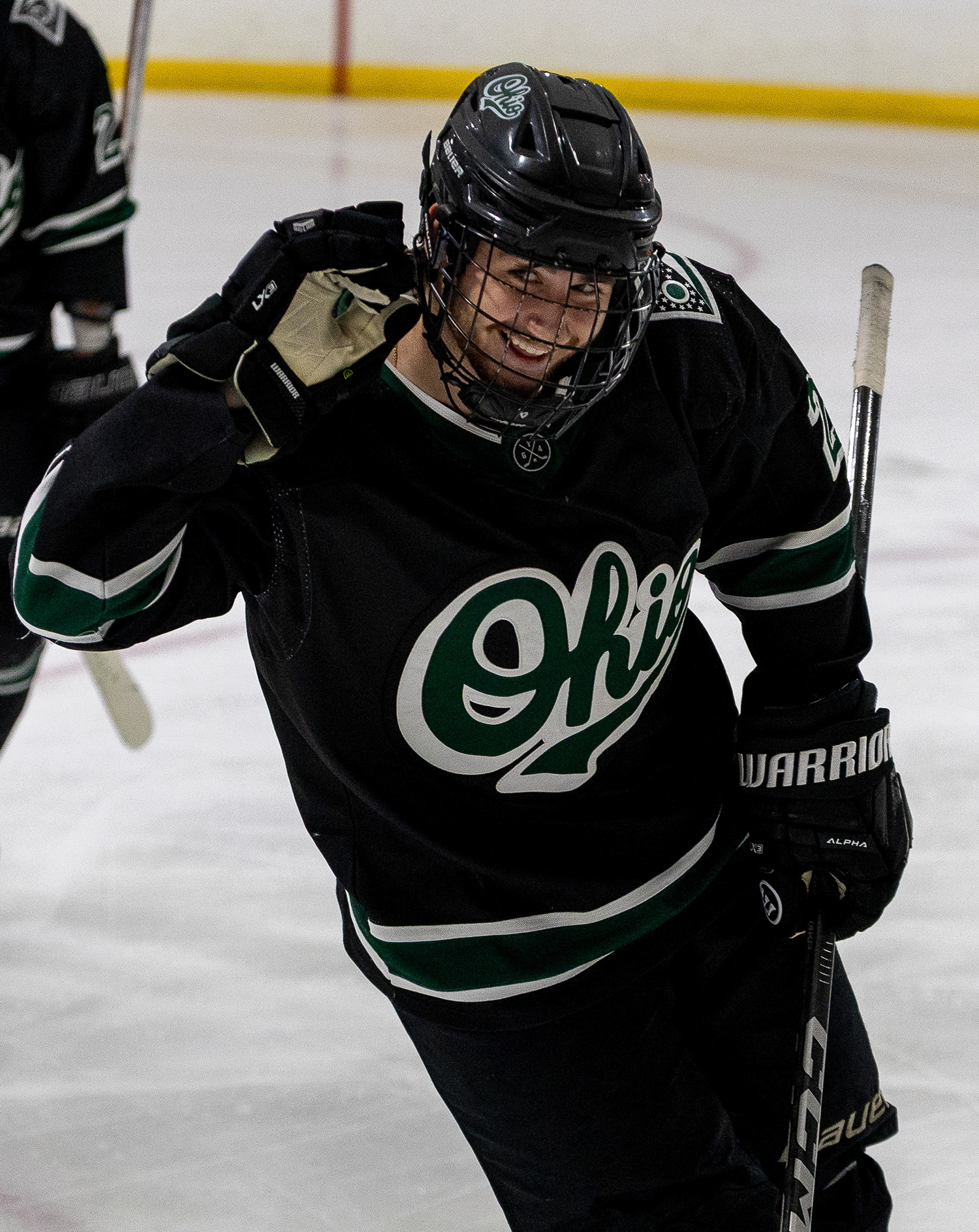 Ohio Bobcats Forward #17, Laker Aldridge, celebrates after scoring a goal against Maryville at Bird Ice Arena on November 14 2025.