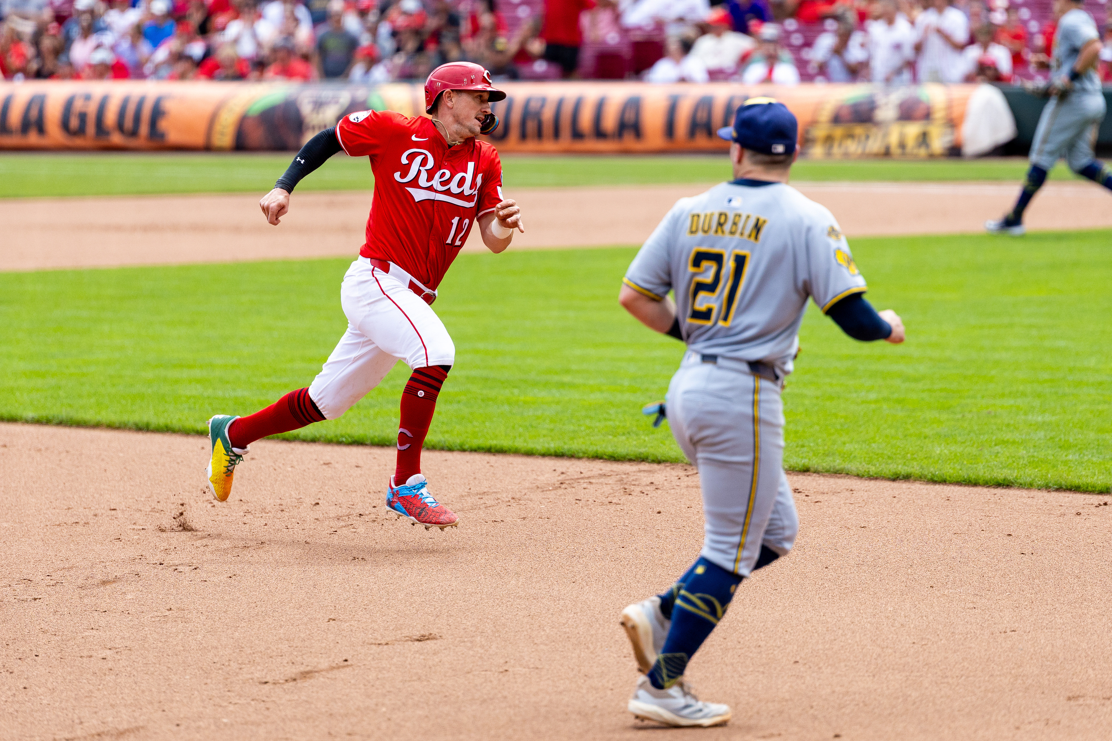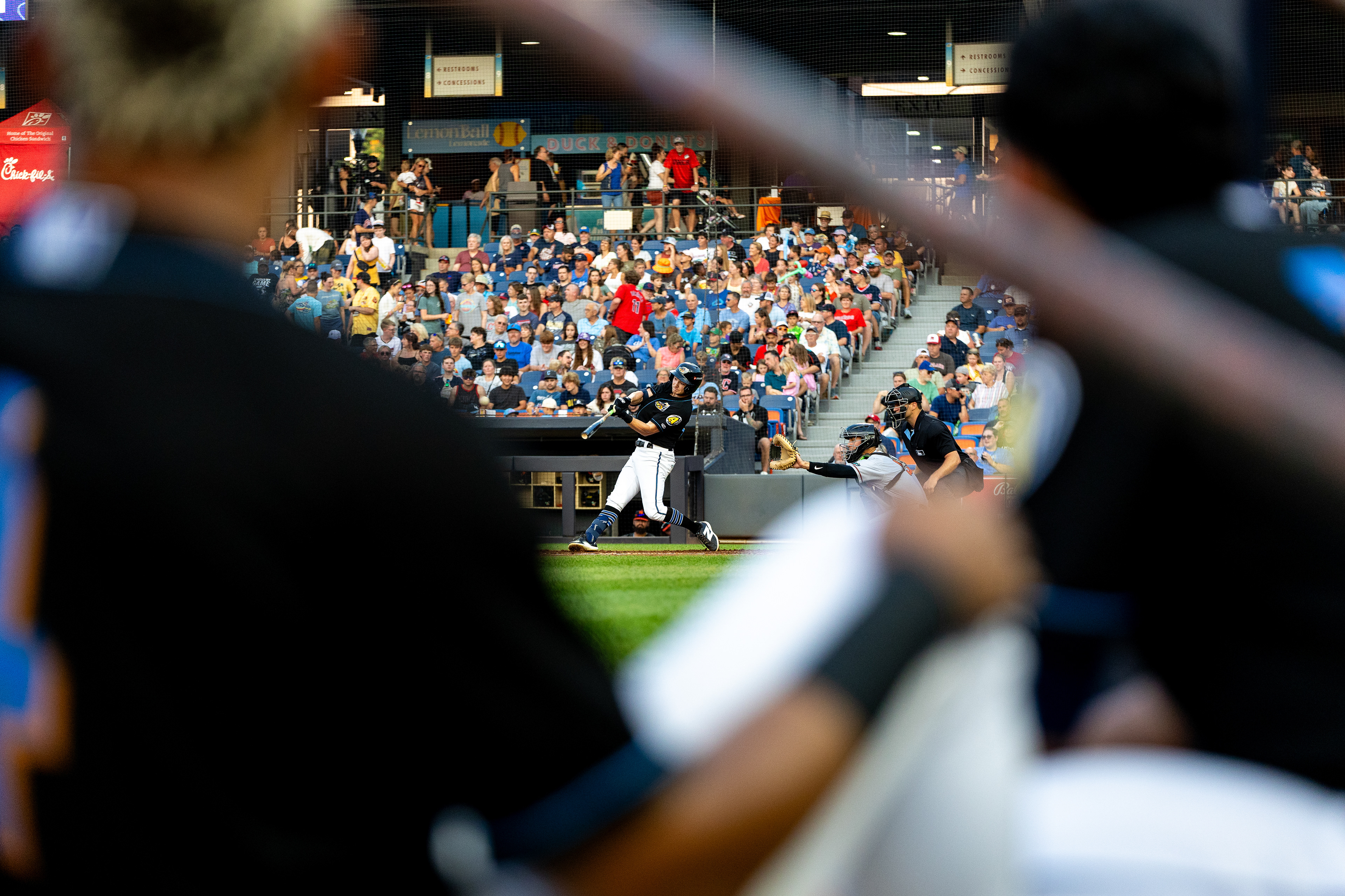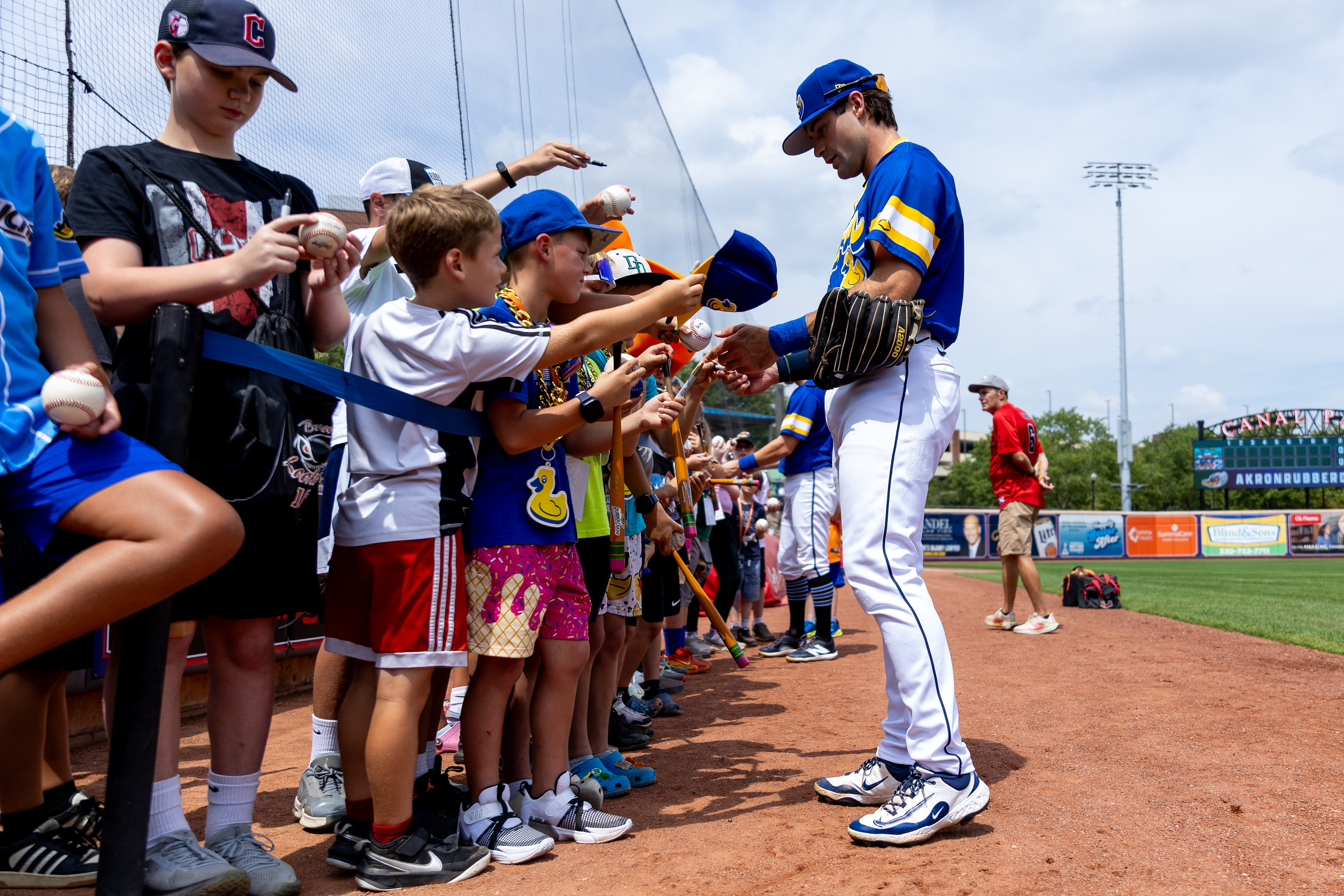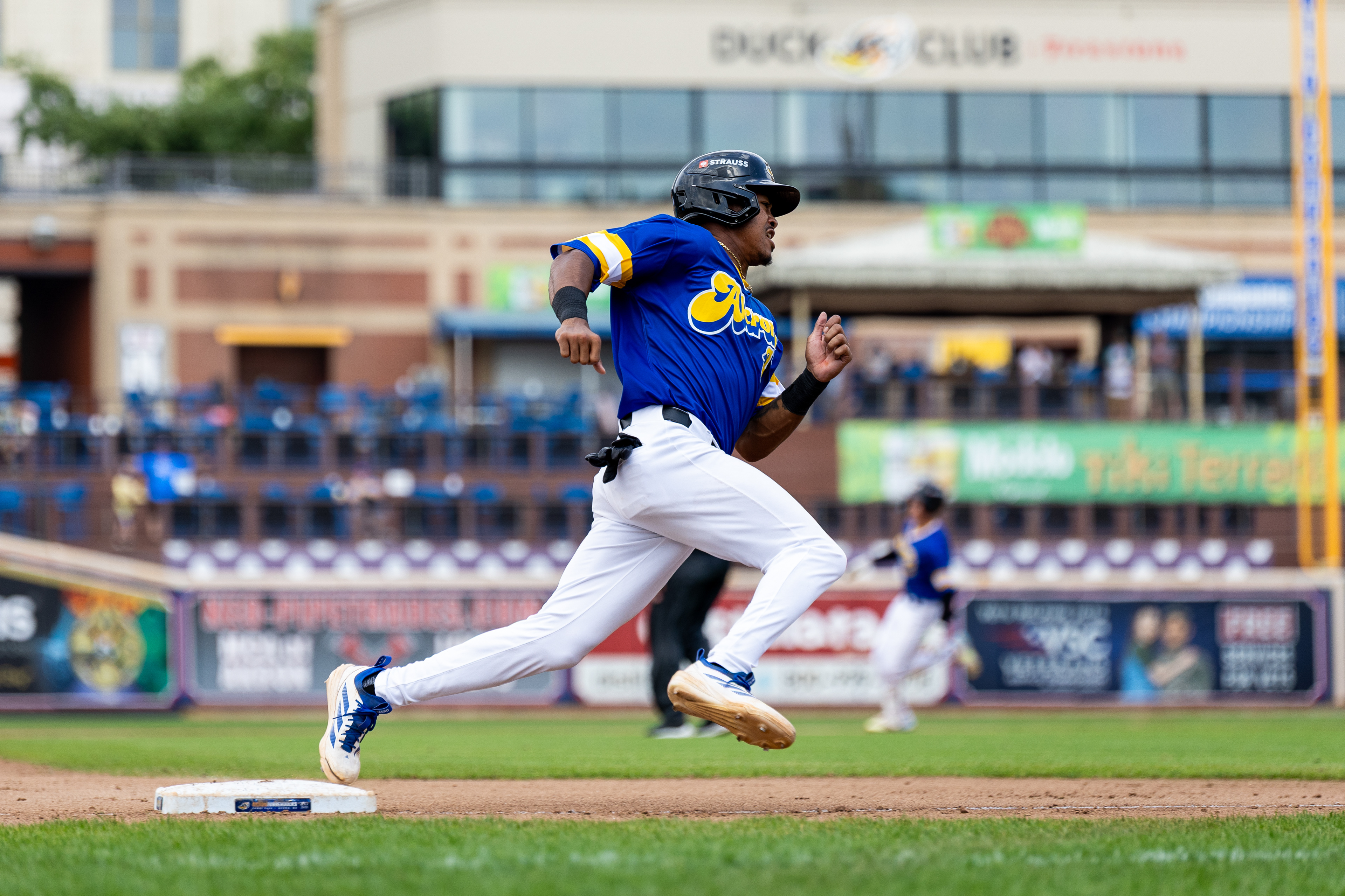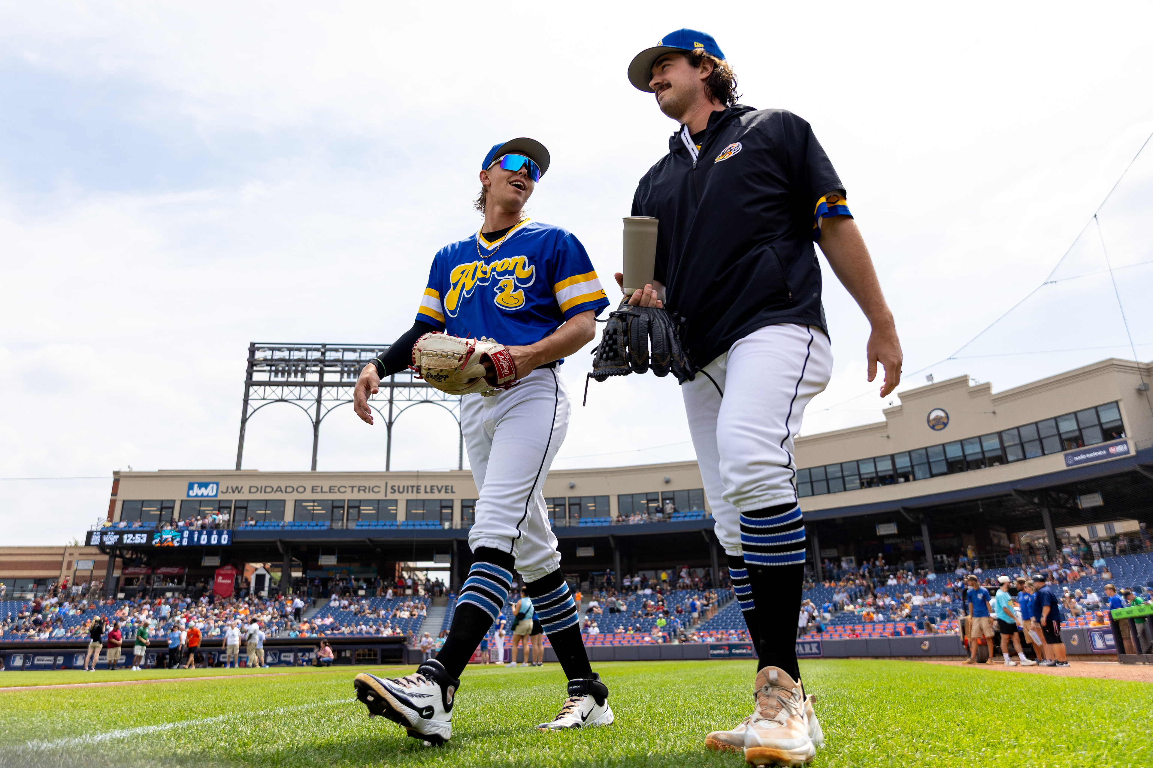 Akron RubberDucks infielder #13, Dayan Frias, shakes off gatorade that was poured on him after a 2-1 walk-off at Canal Park. The Akron RubberDucks hosted the Fightin Phils on August 11 2024.