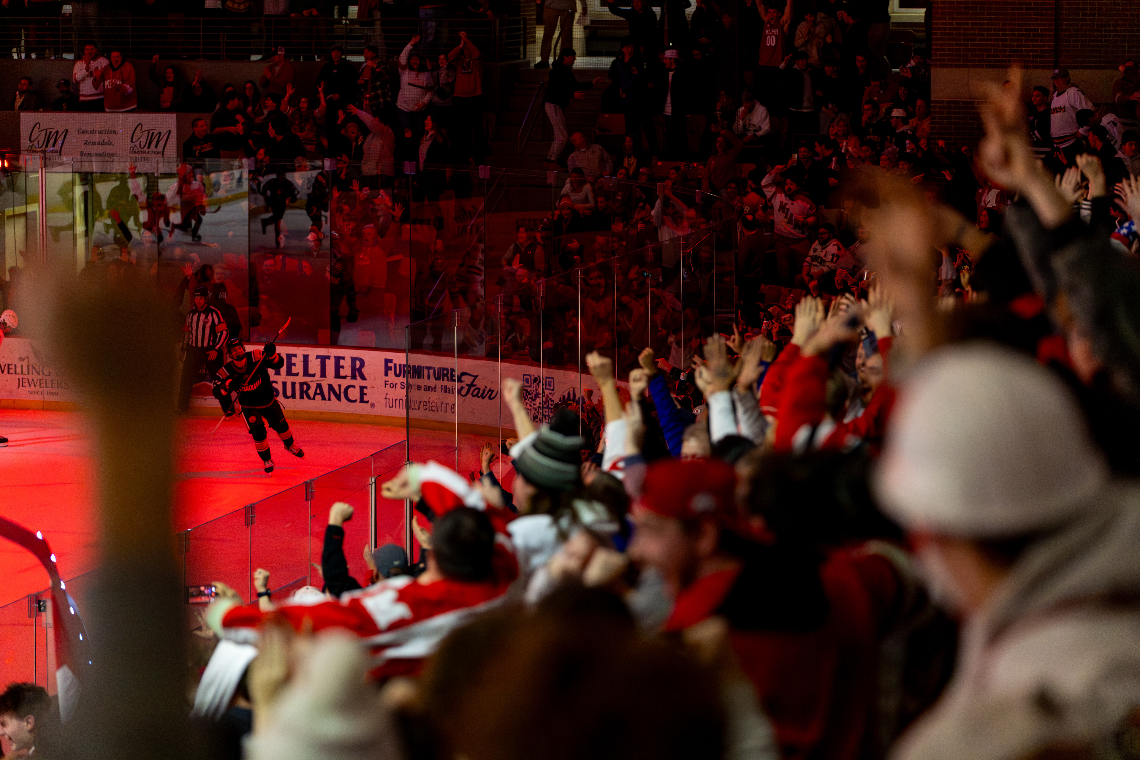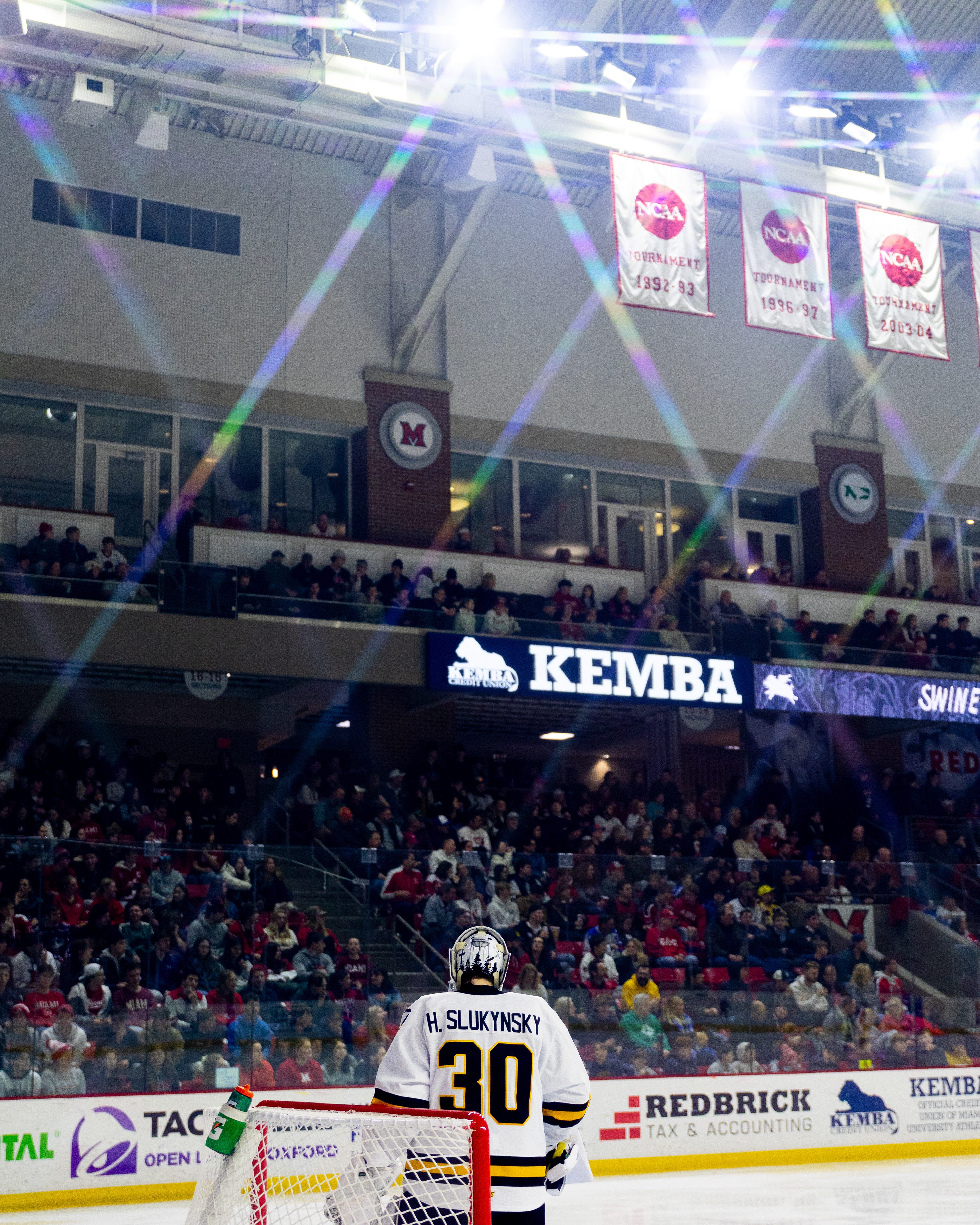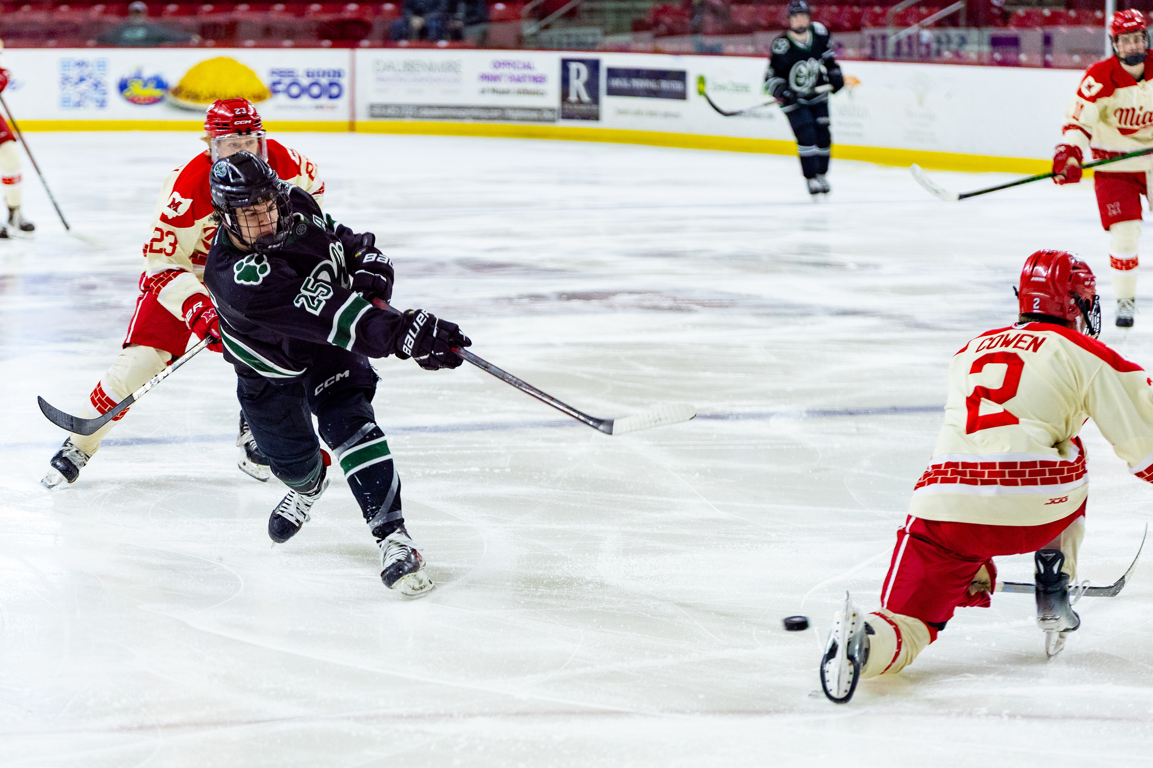 Miami Redhawks Forward #20, David Deputy, scores the GWG in overtime against Western Michigan to win 3-2 at Goggin Ice Center on February 6 2026.