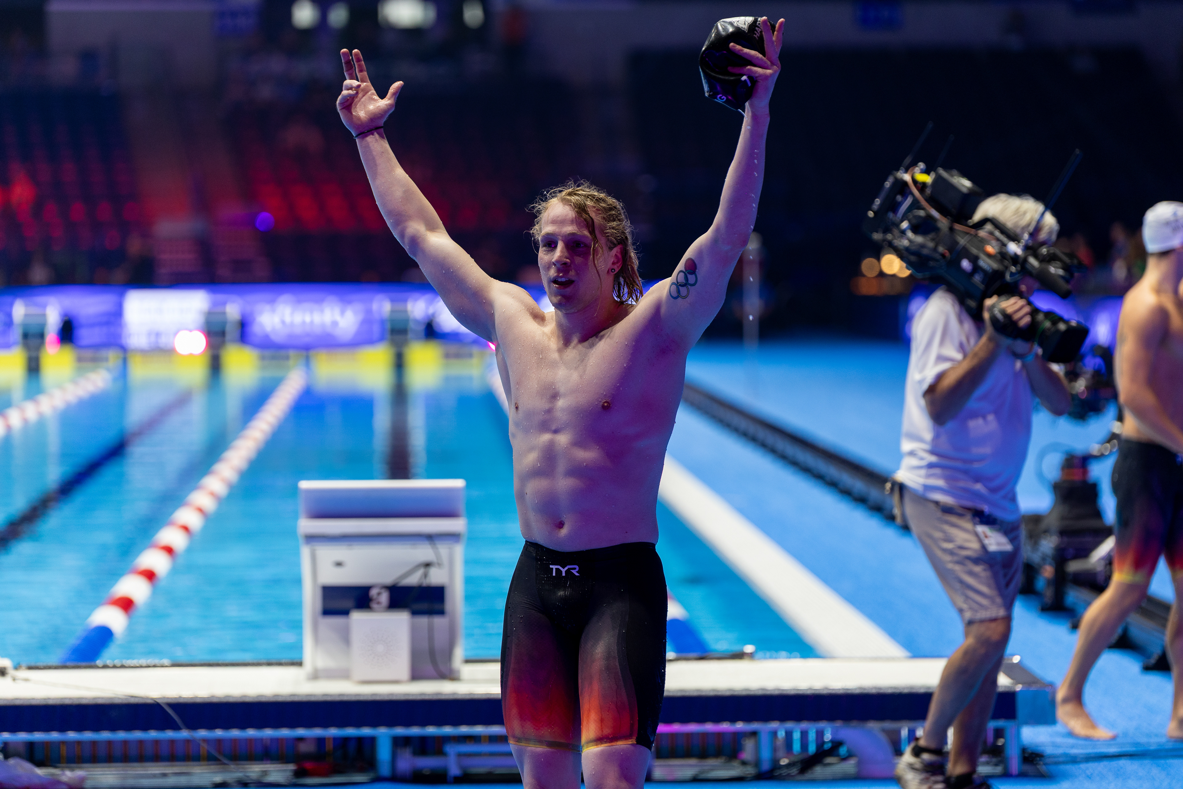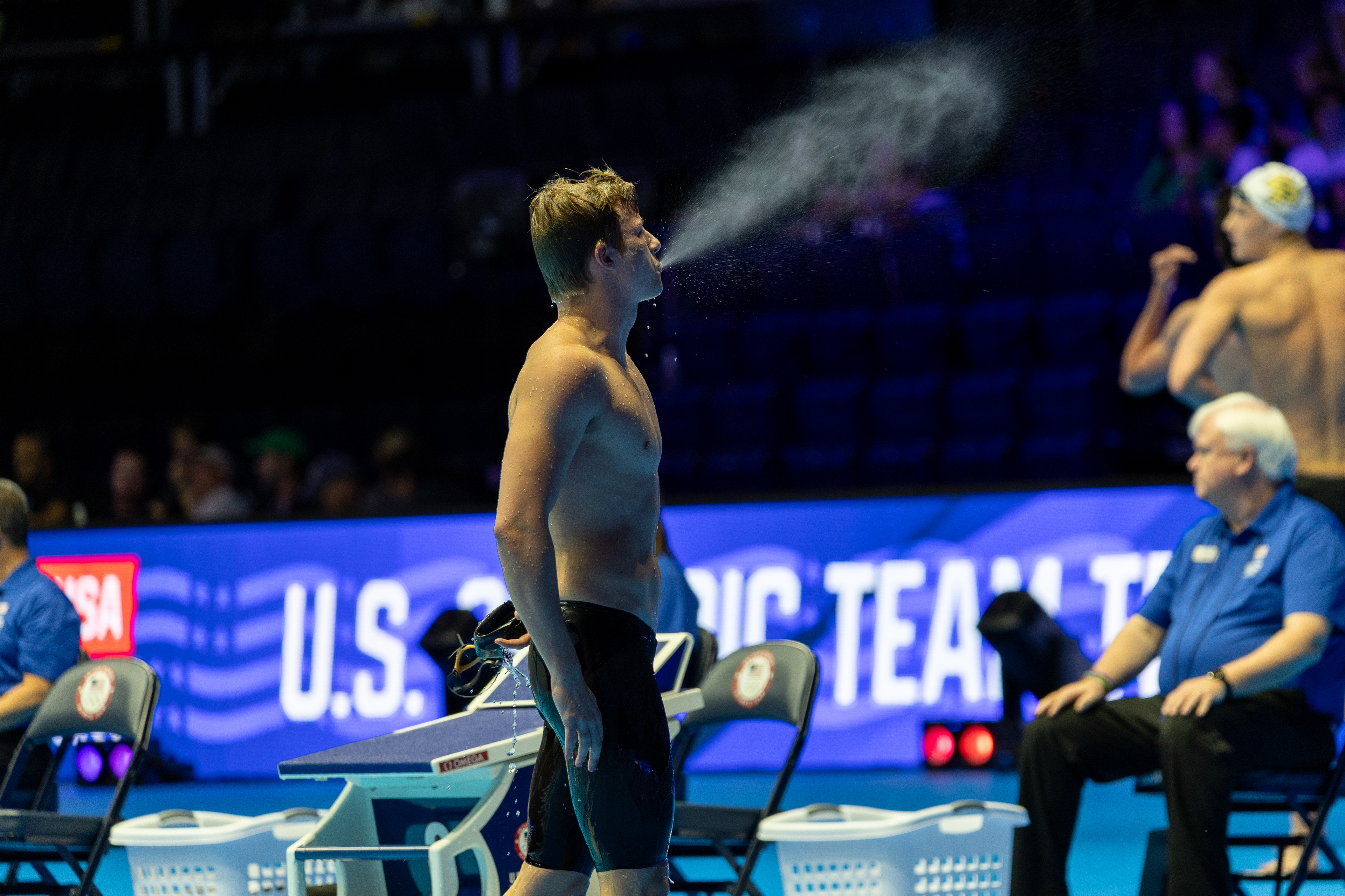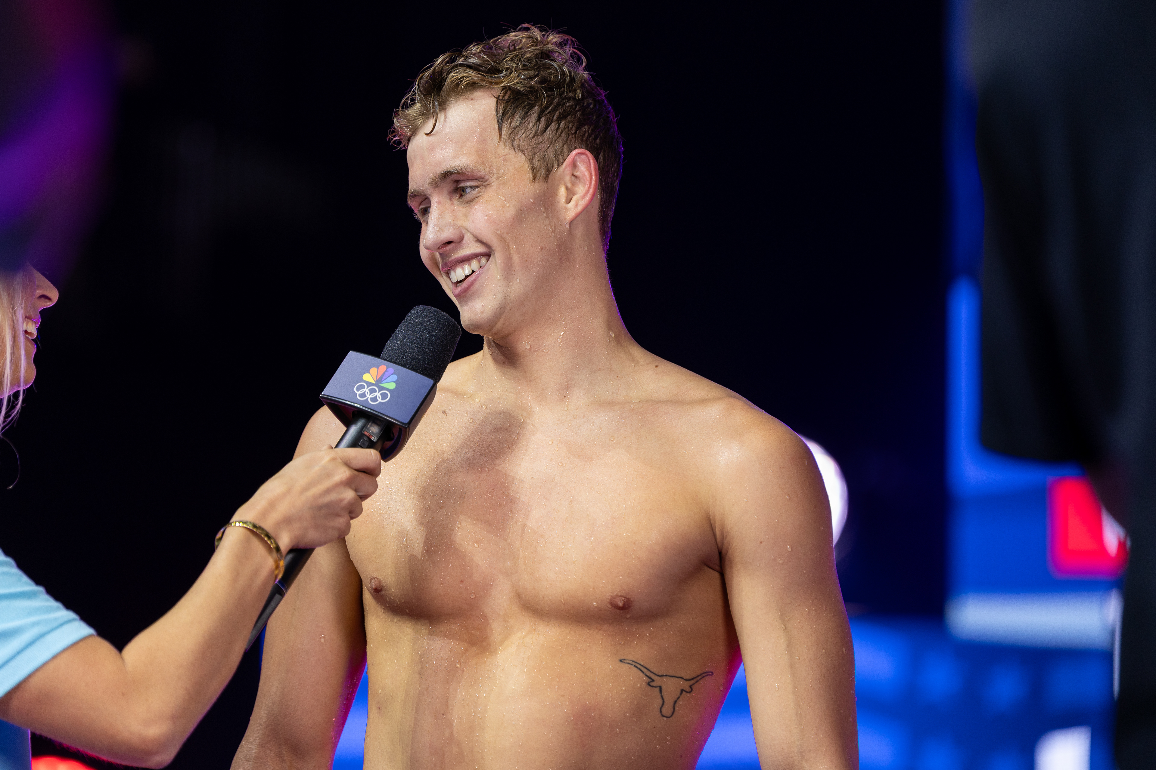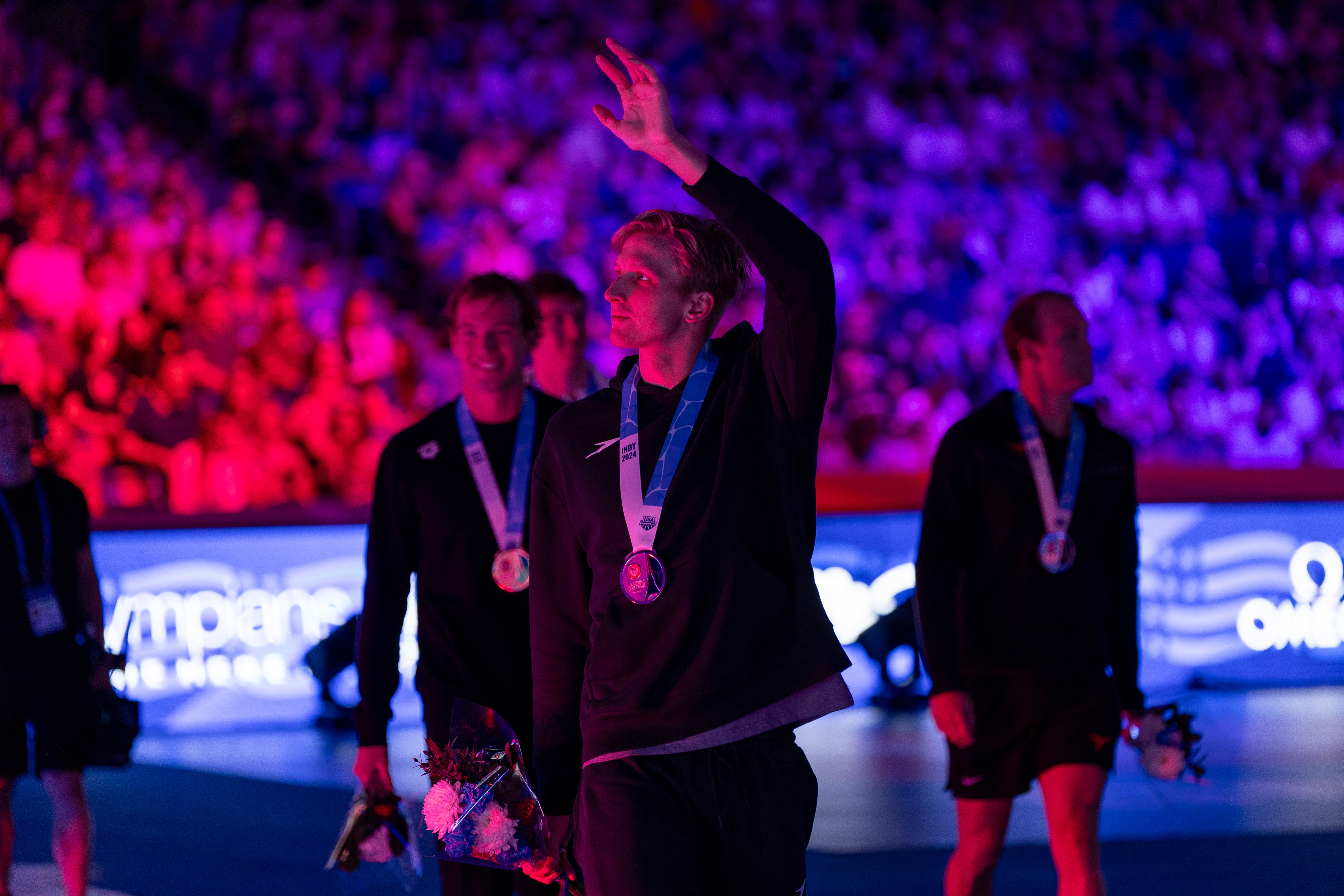 Carson Foster from Cincinnati, OH takes it all in before being interviewed by NBC after winning the 400 Individual Medley with a time of 4:07.64 at the U.S. Olympic Team Trials at Lucas Oil Stadium on June 16 2024.