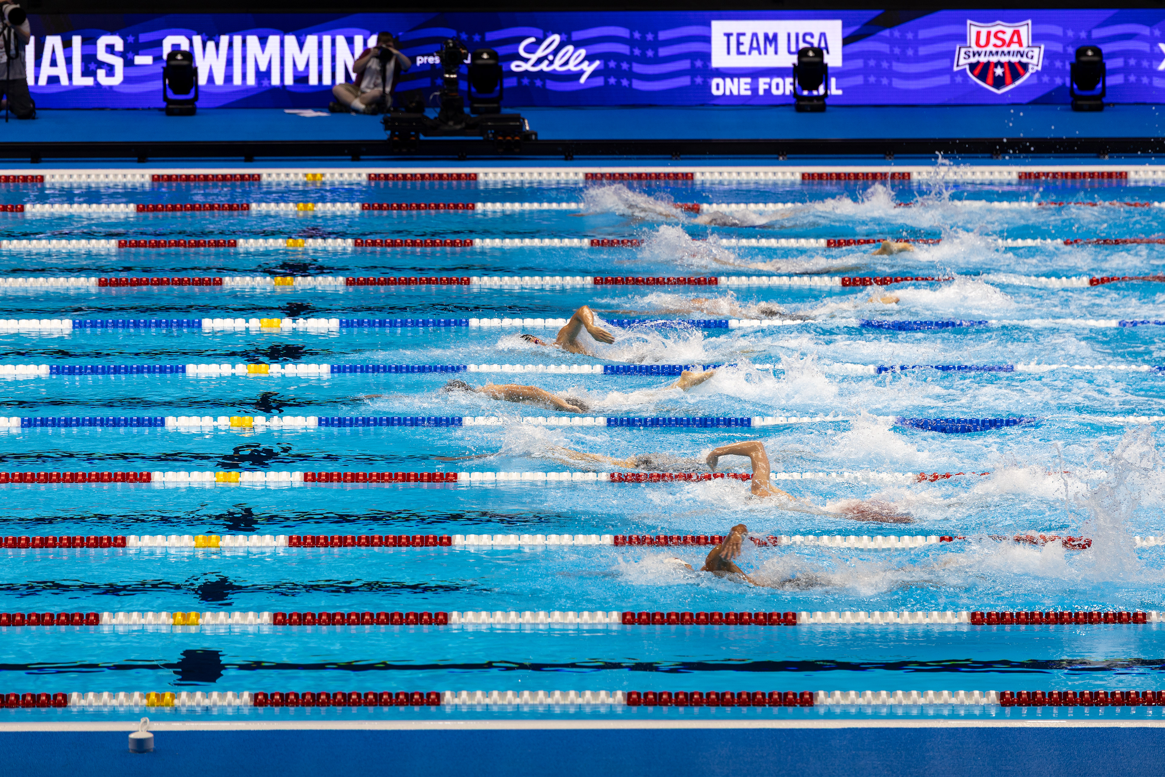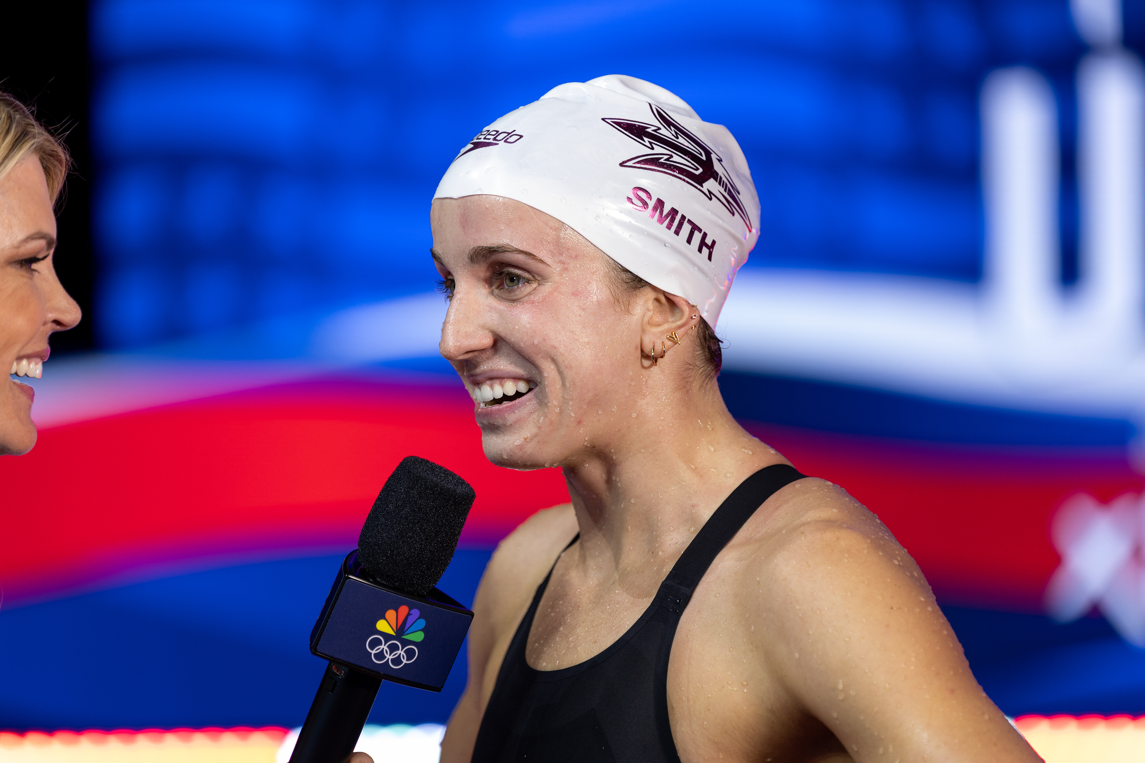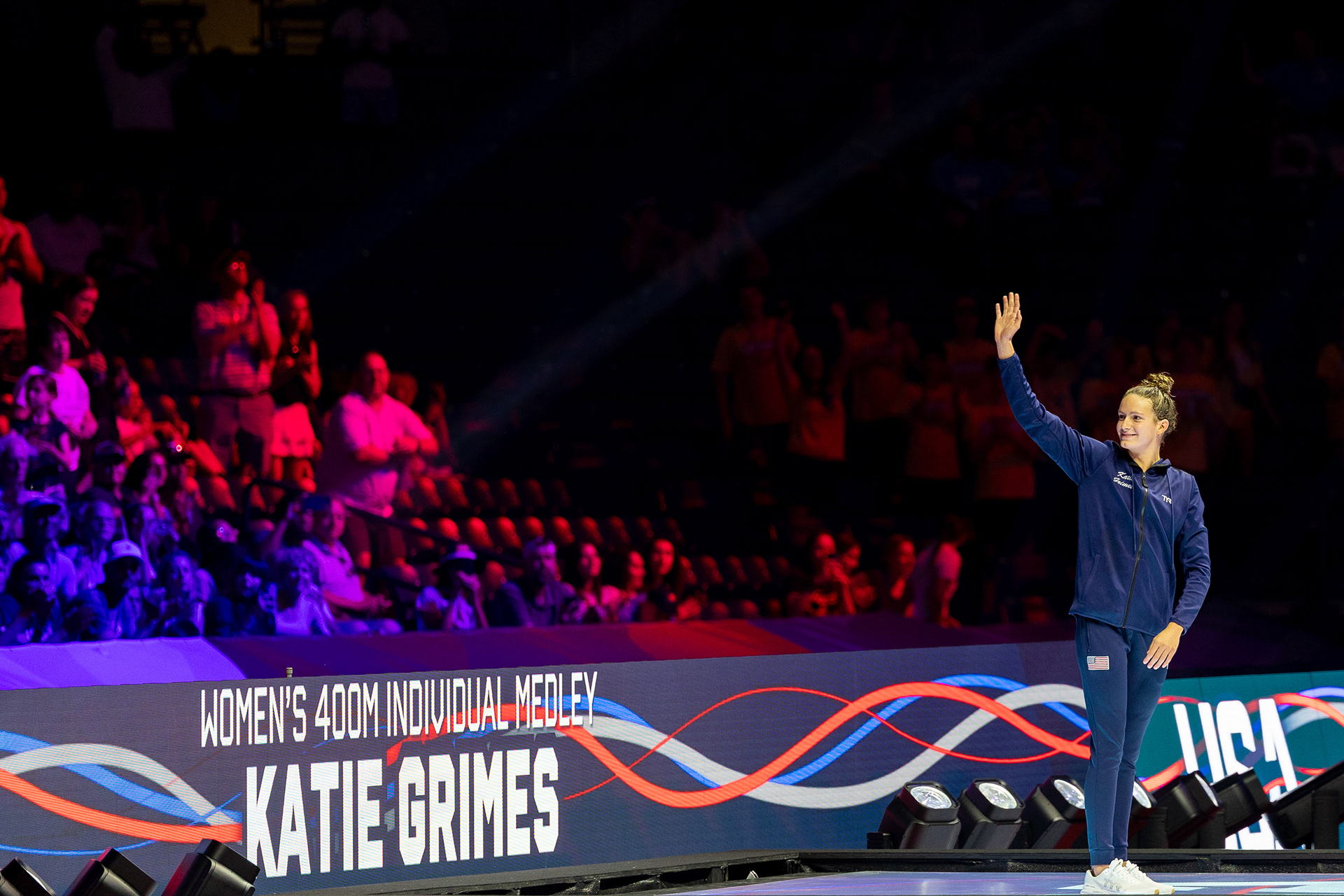 Carson Foster from Cincinnati, OH takes it all in before being interviewed by NBC after winning the 400 Individual Medley with a time of 4:07.64 at the U.S. Olympic Team Trials at Lucas Oil Stadium on June 16 2024.
