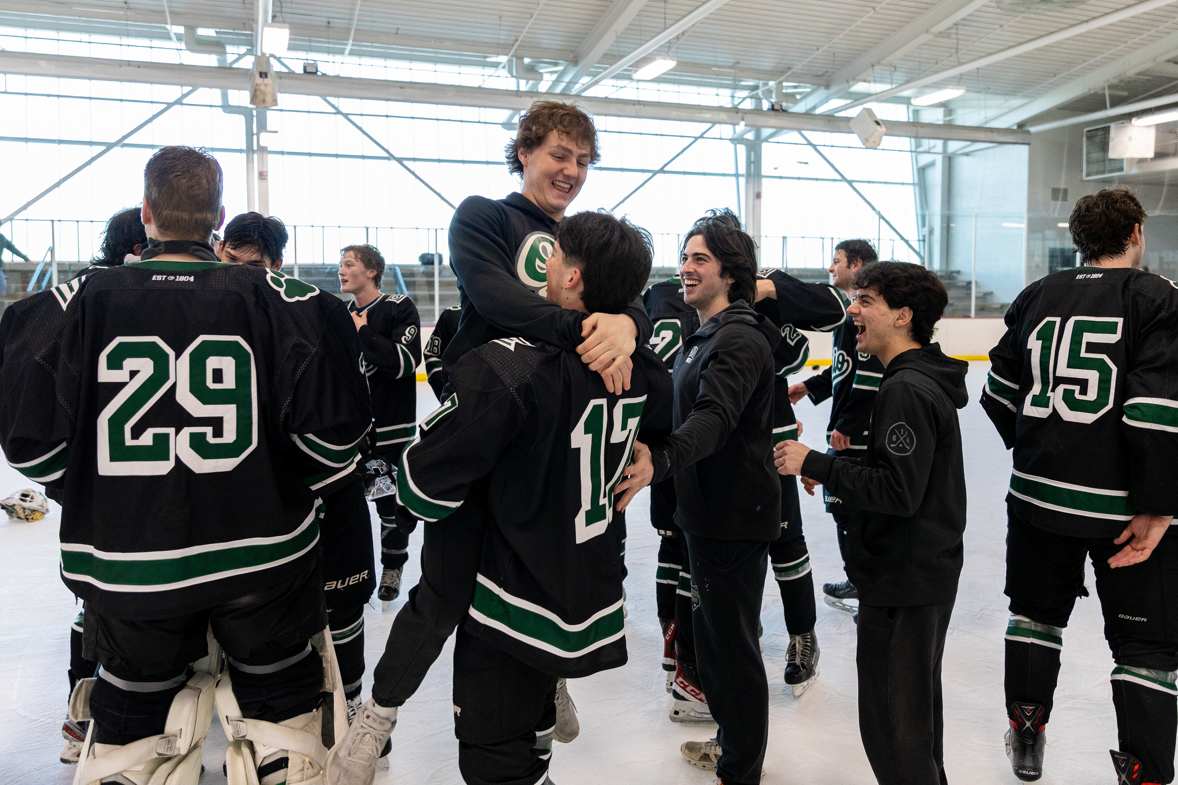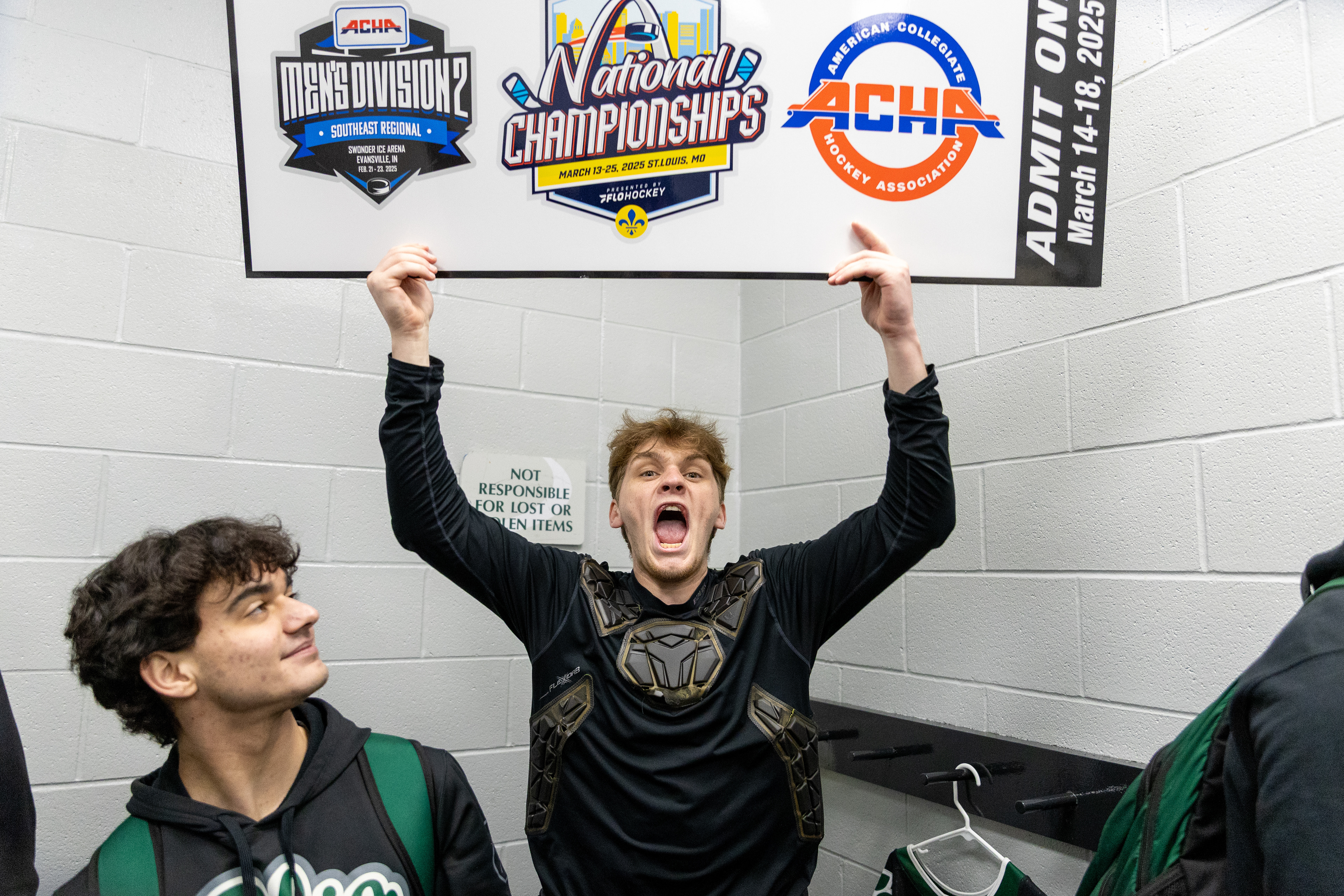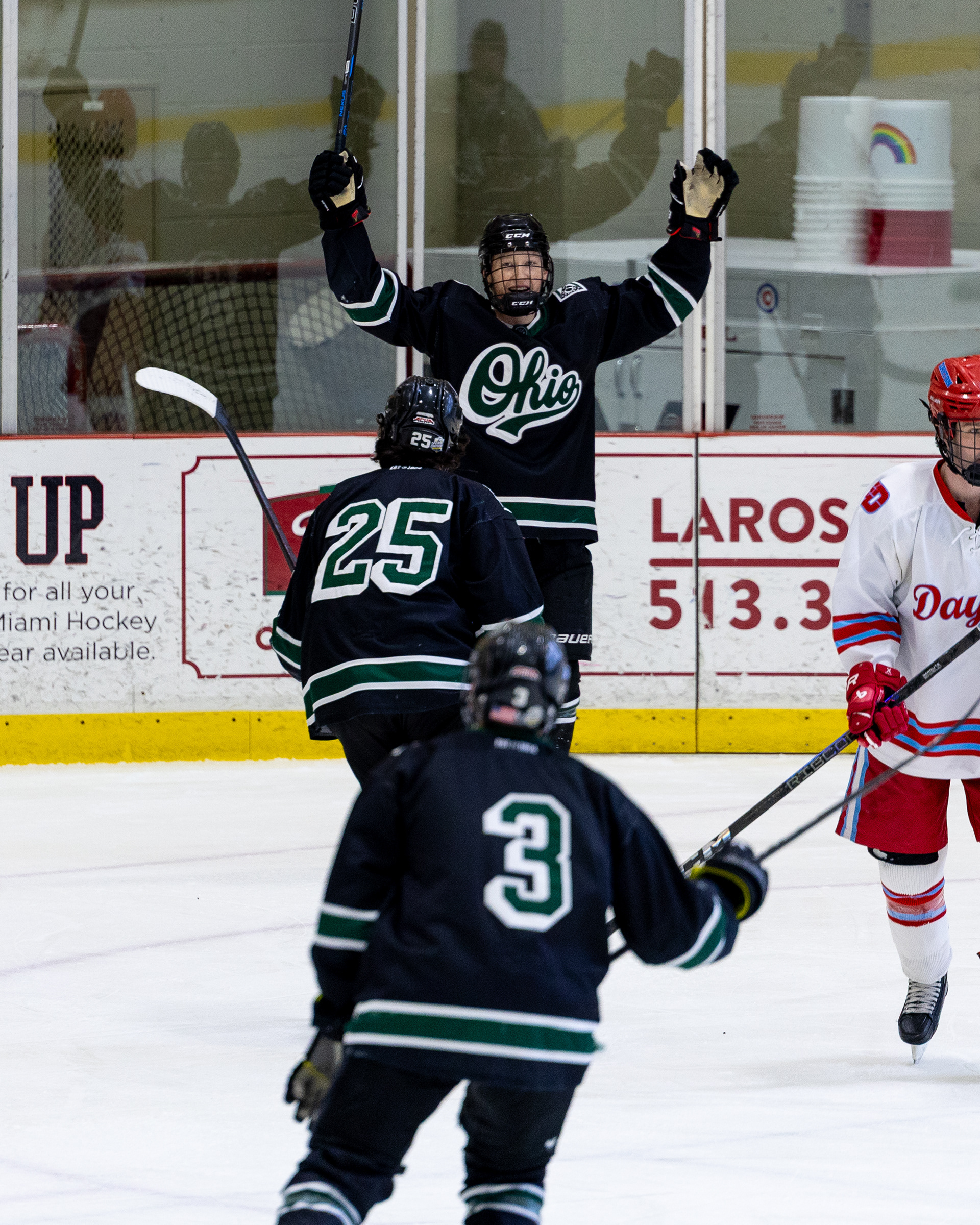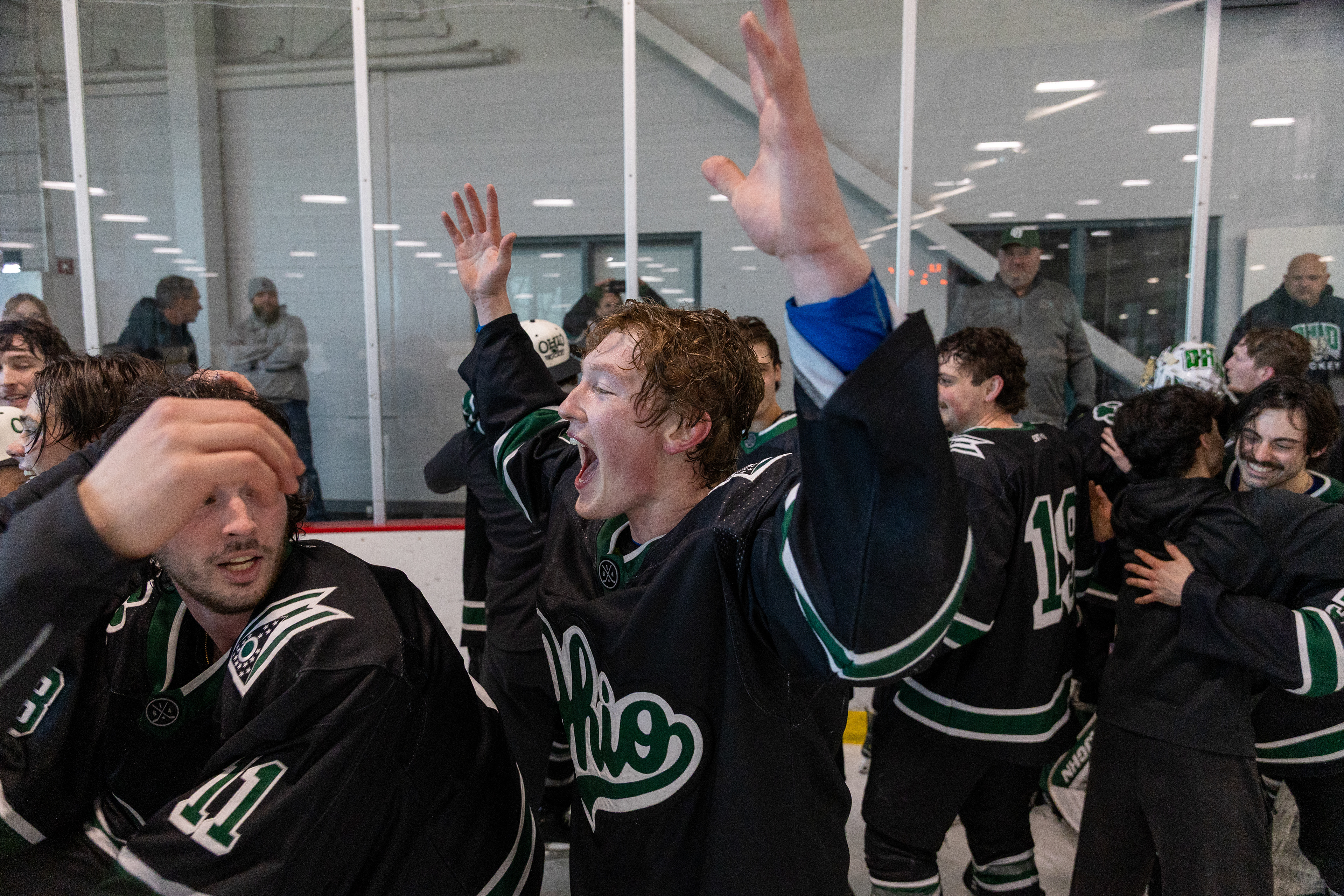 The 2024-25 Ohio University Division II Men's Ice Hockey team from Athens, OH poses for a photo after beating Miami University 4-1 to make them qualifiers for the 2025 ACHA M2 Nationals held in St. Louis. Photo taken at 2025 ACHA M2 Regionals at Swonder Ice Arena on February 23 2025.