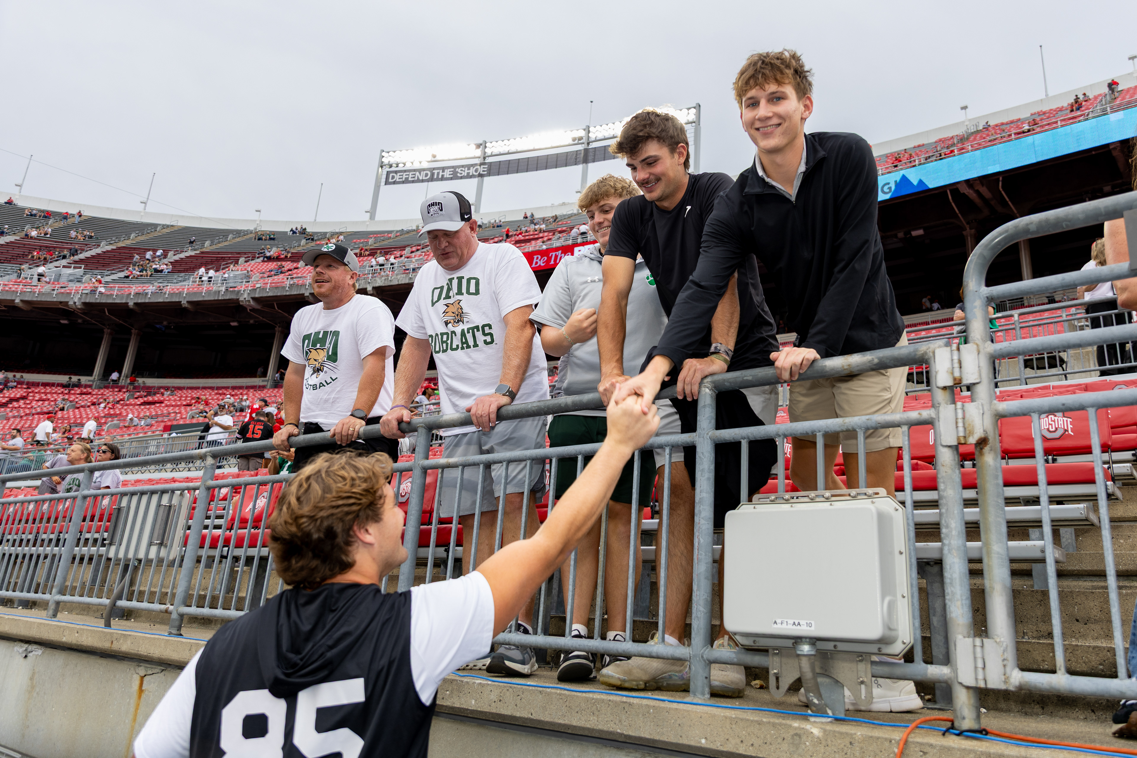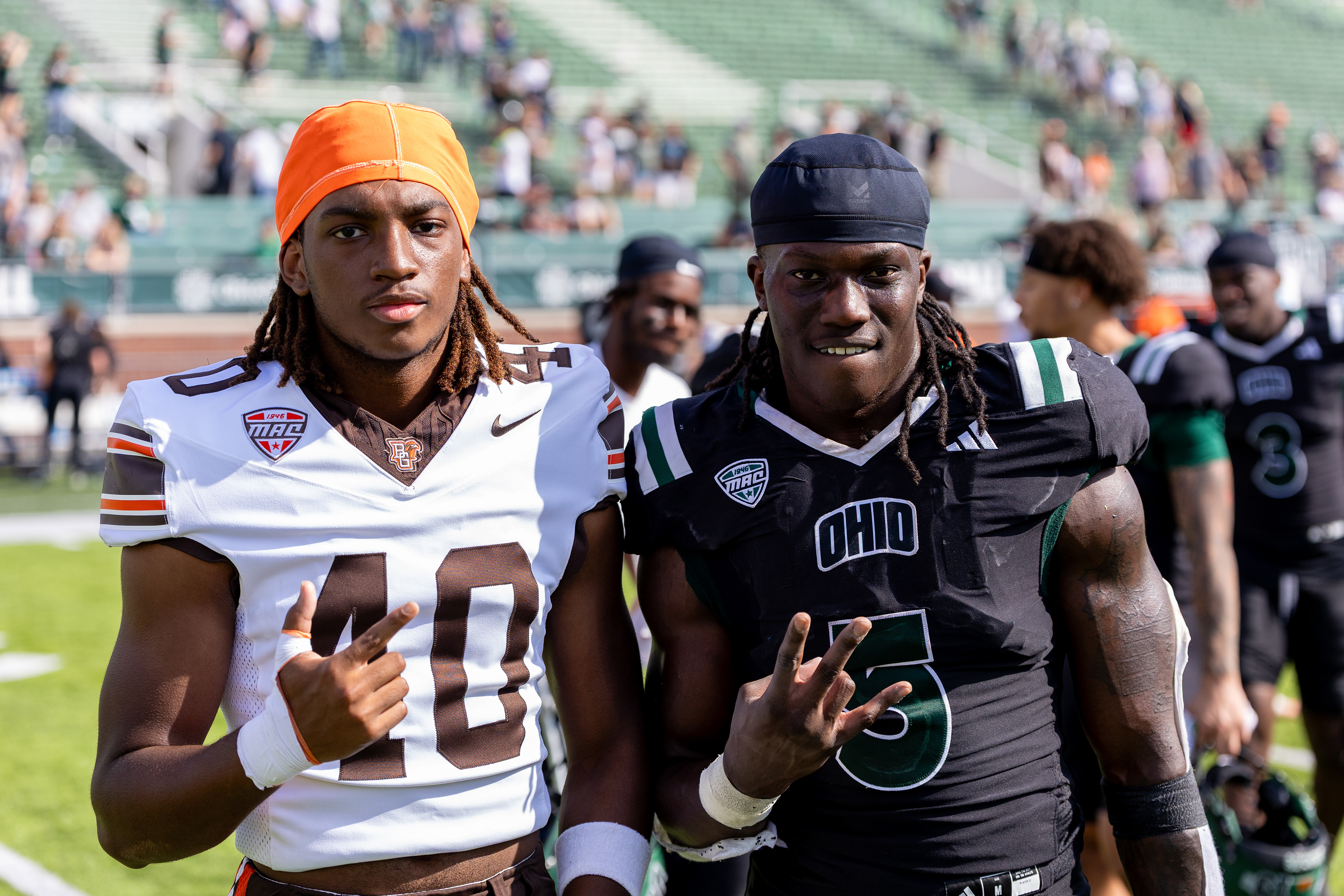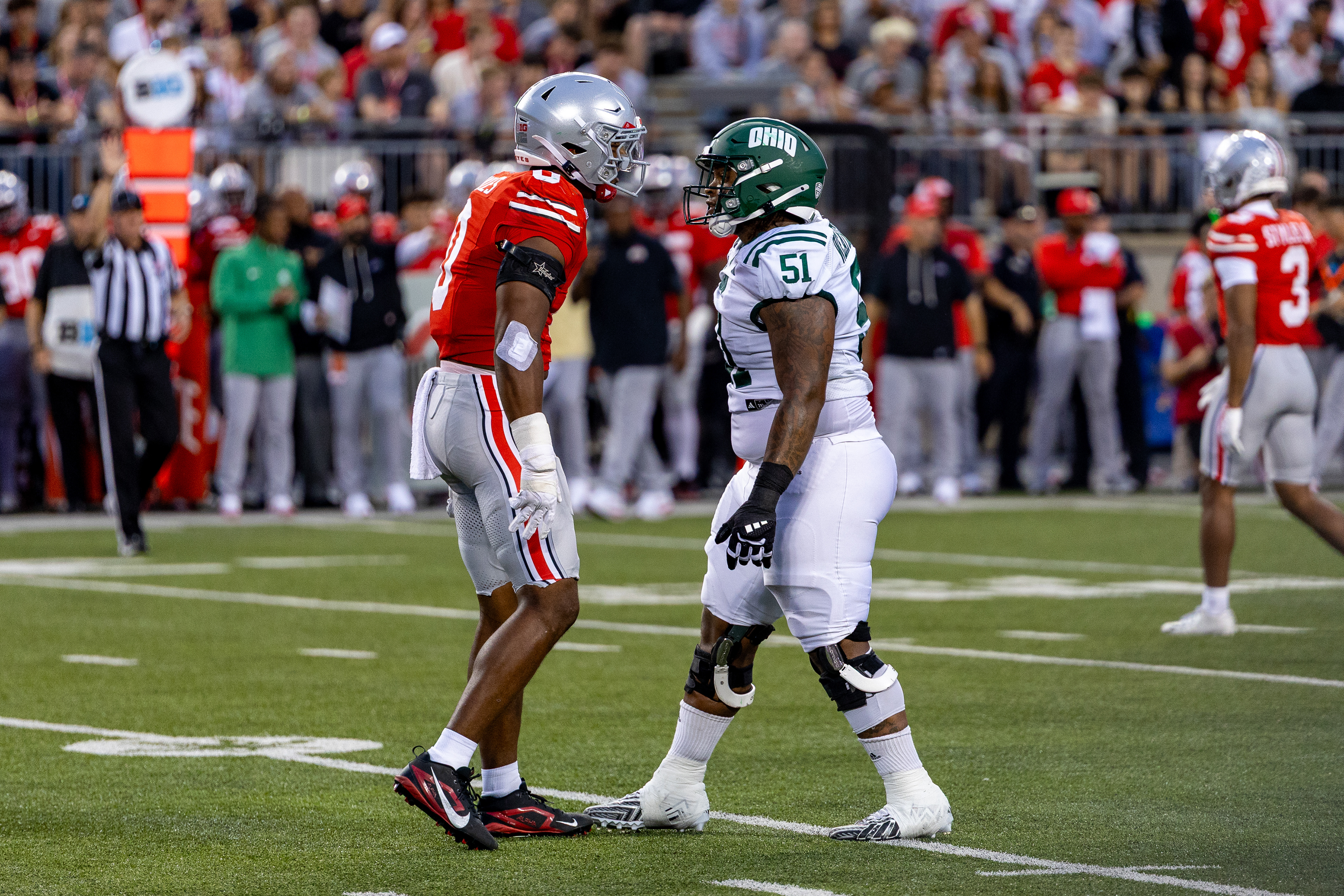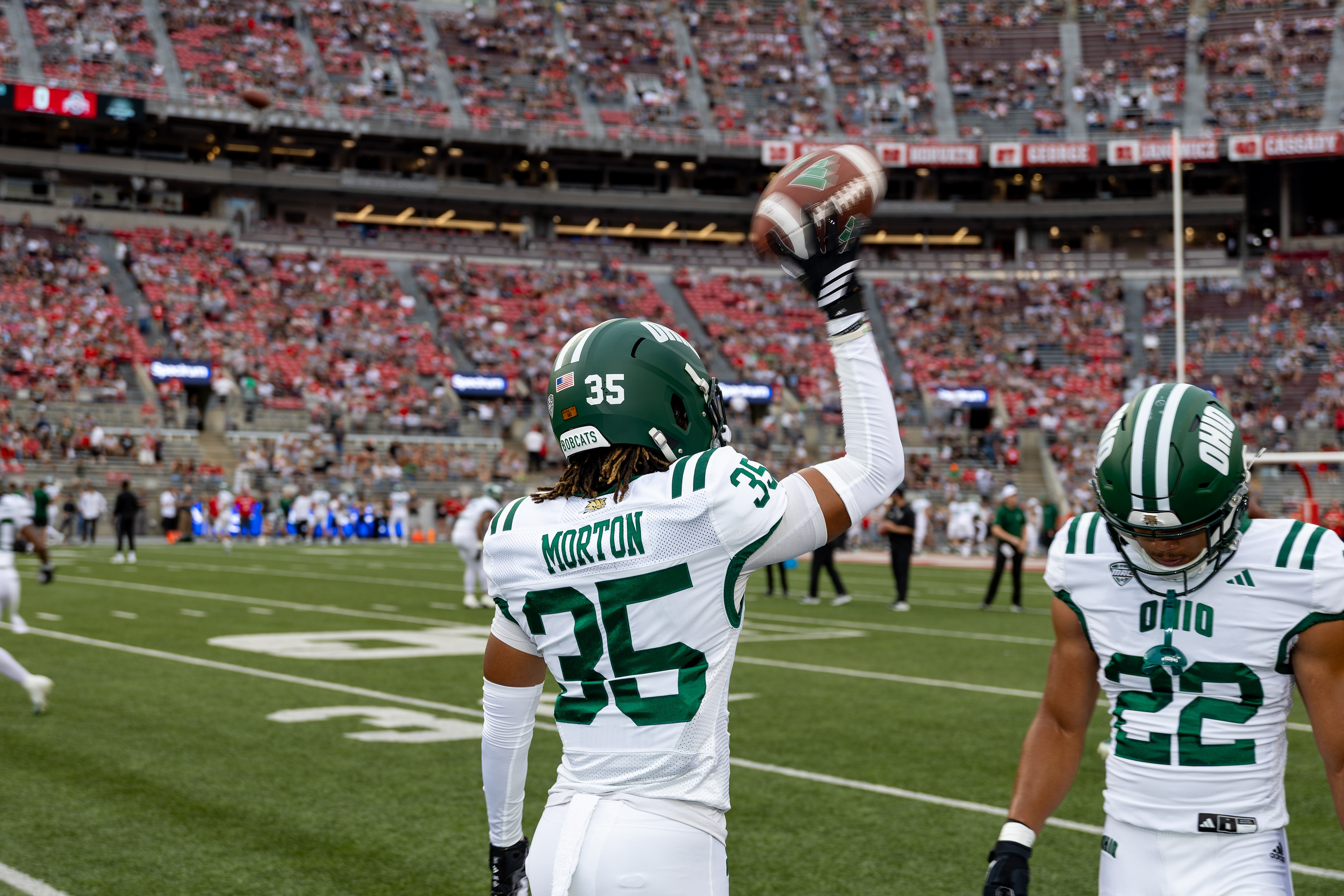 Ohio Bobcats #21, Ronald Jackson Jr., shakes hands with Ohio State Buckeye #25, Ty Howard, after the game ending in 37-9 with the Buckeyes winning at Ohio Stadium on September 13 2025.