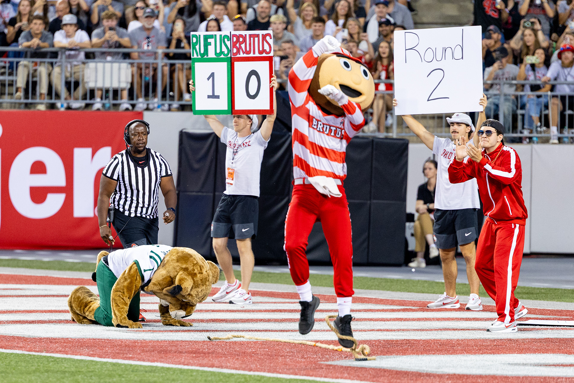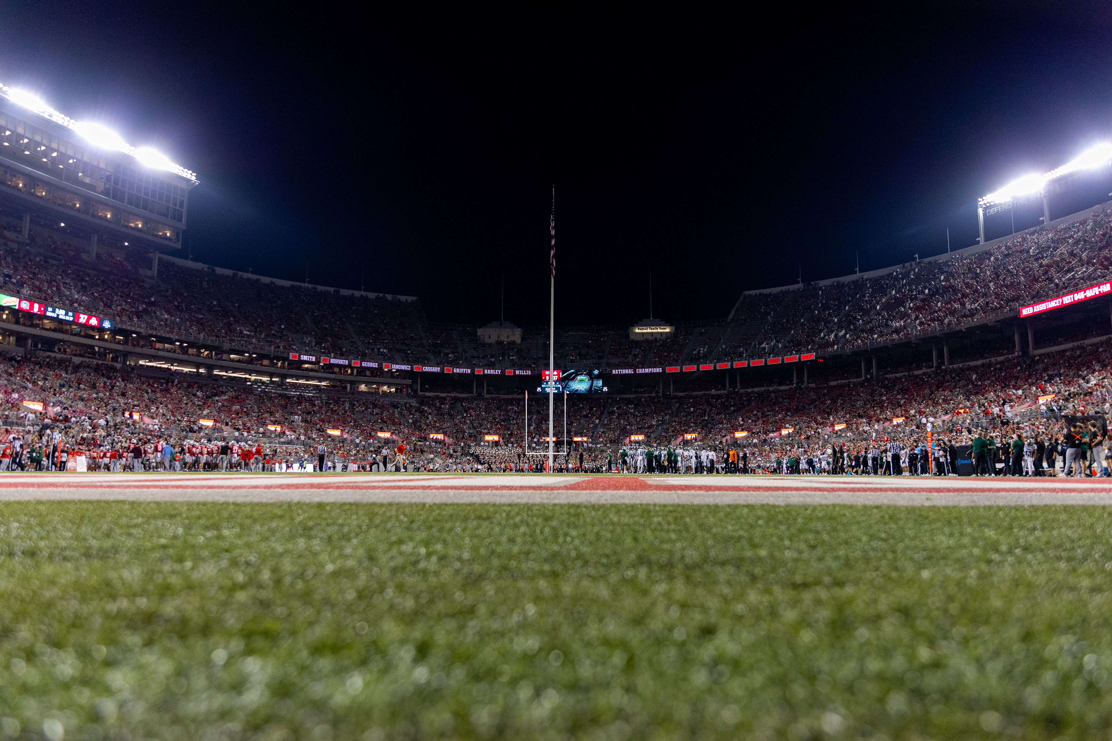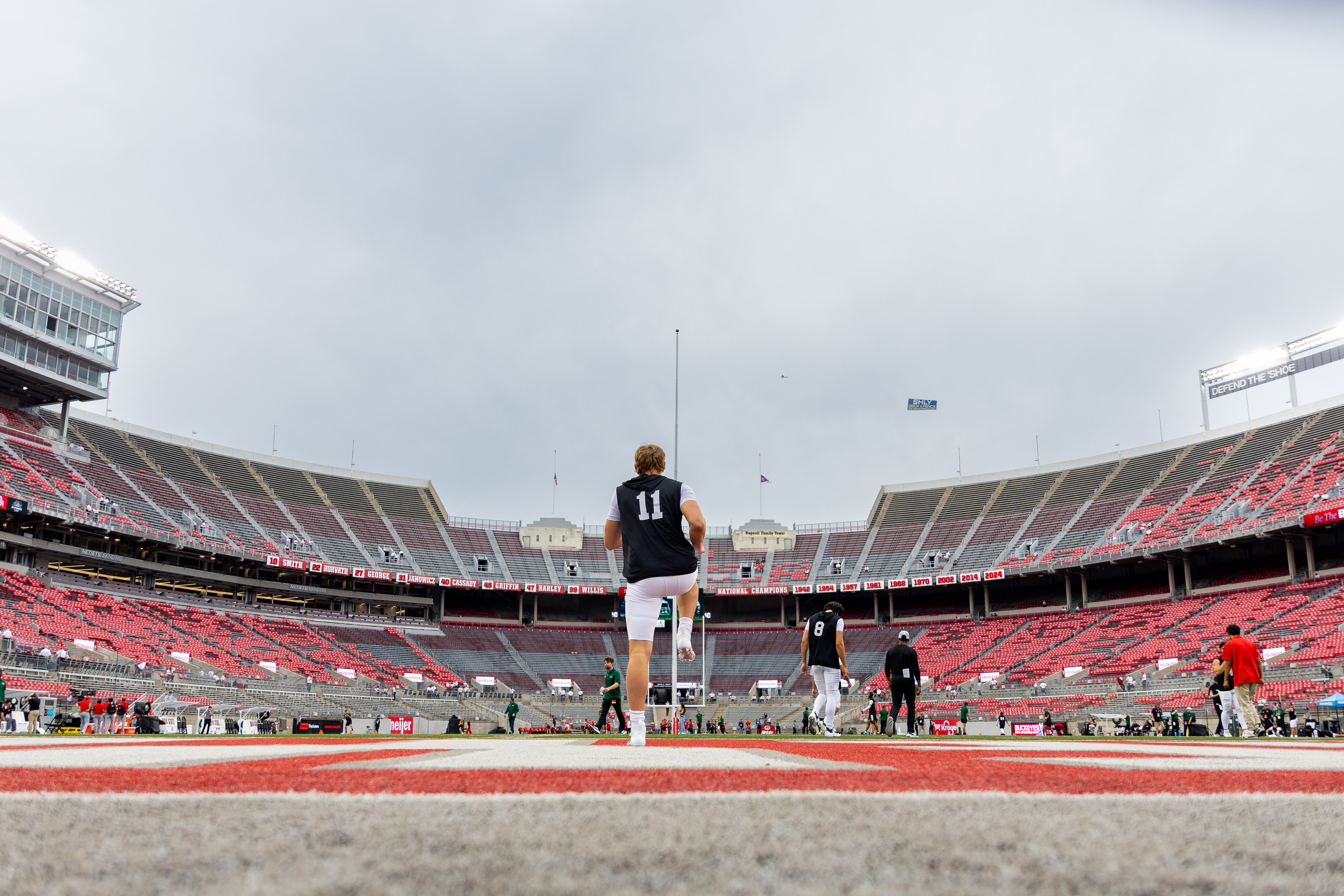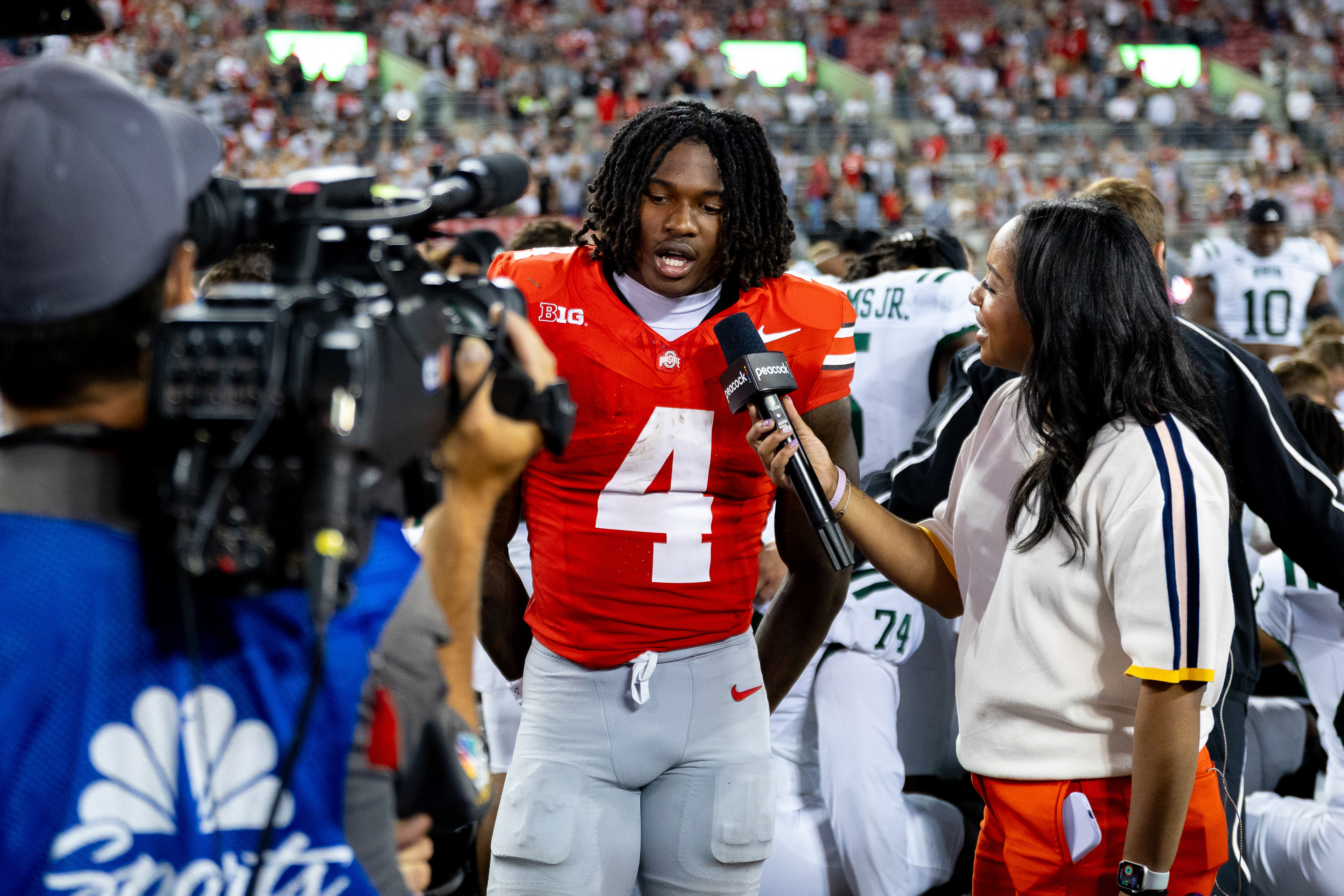 Ohio Bobcats #21, Ronald Jackson Jr., shakes hands with Ohio State Buckeye #25, Ty Howard, after the game ending in 37-9 with the Buckeyes winning at Ohio Stadium on September 13 2025.