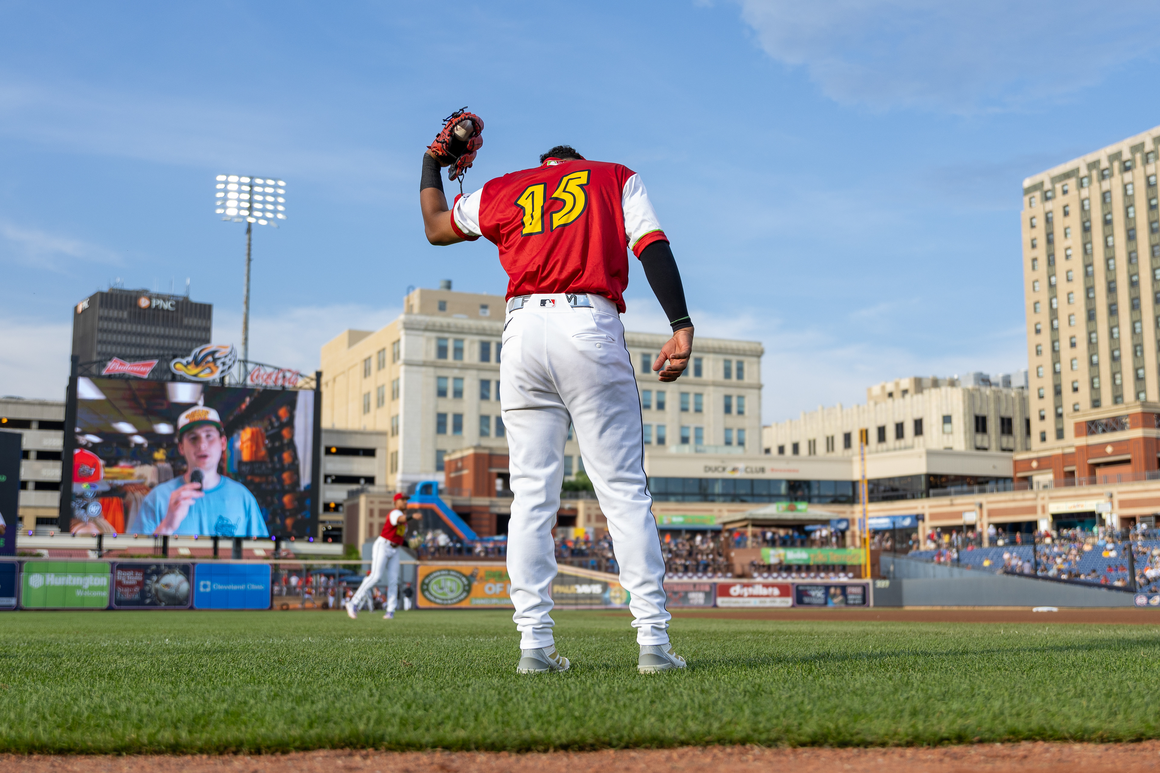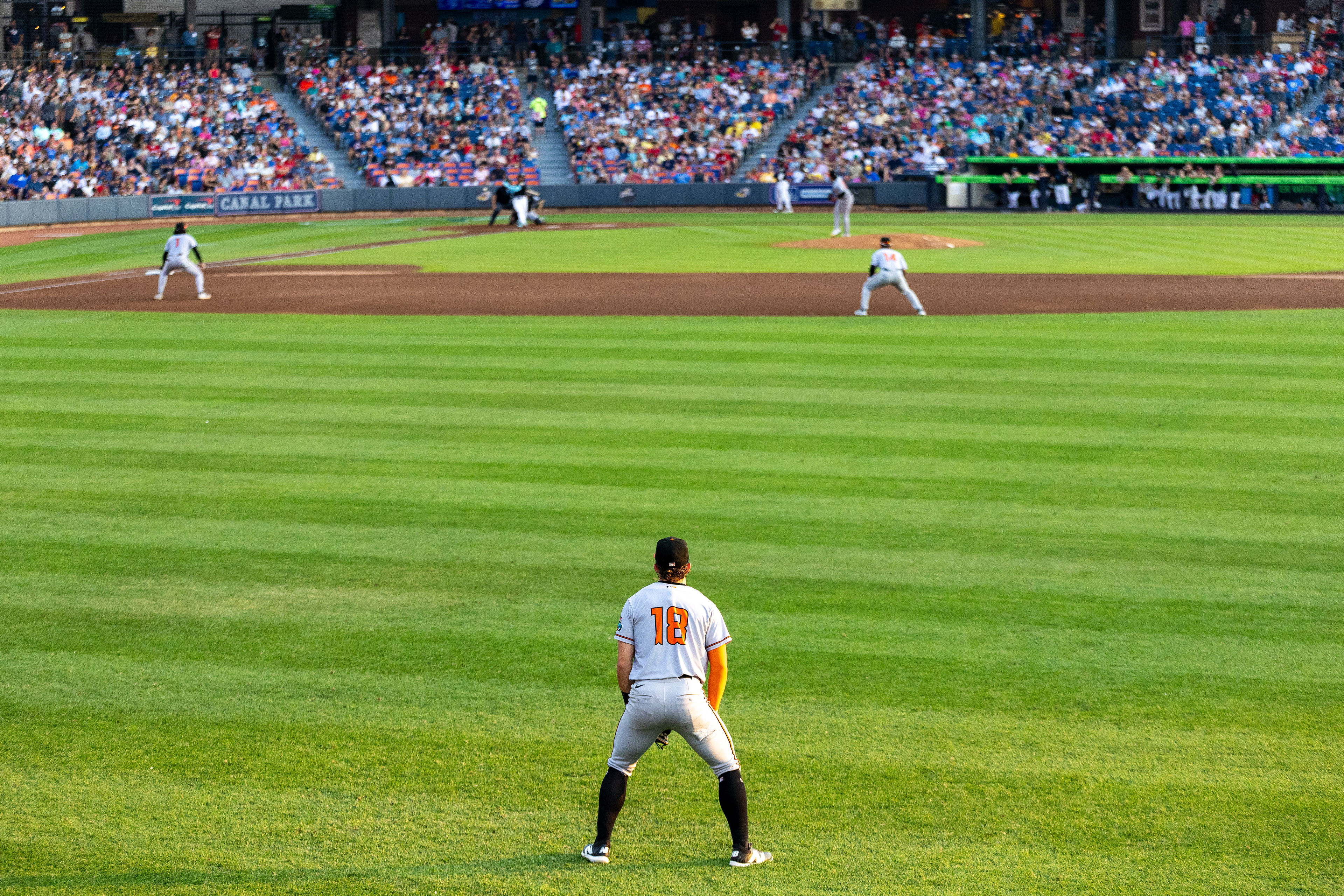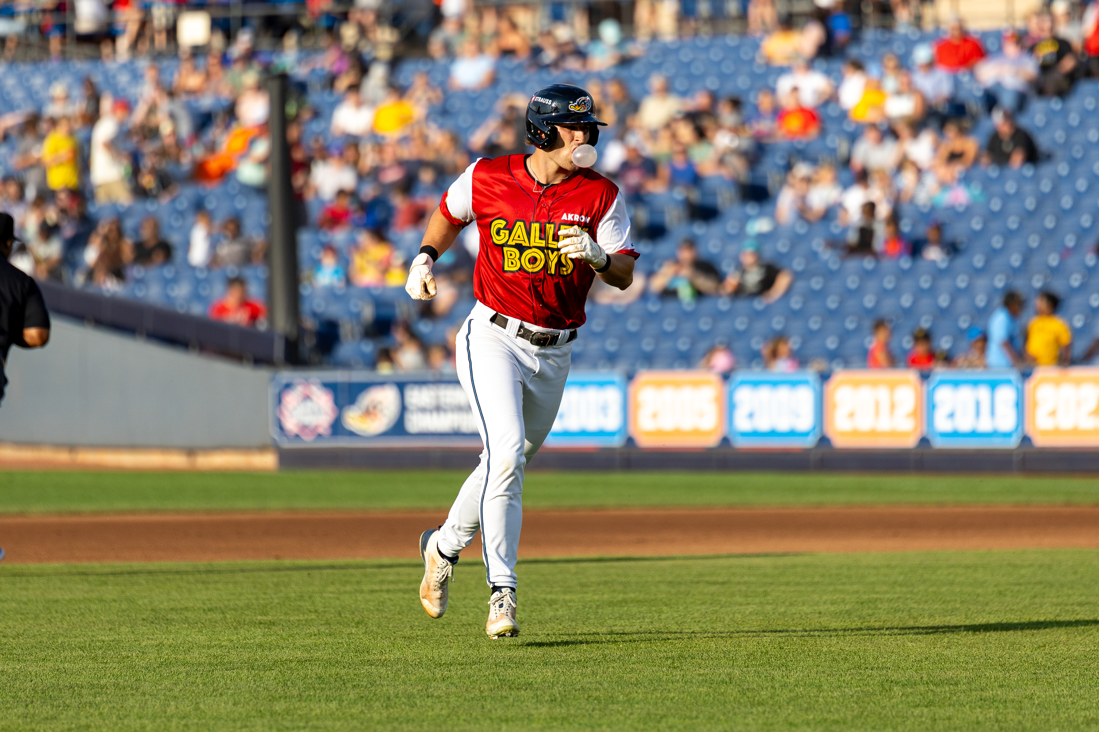 Akron Rubberducks #22, Joe Lampe, blows a bubble in the outfield during the game against the Chesapeake Baysox at Canal Park on August 9 2025.