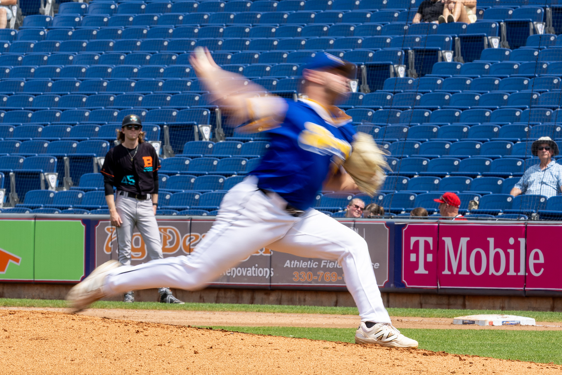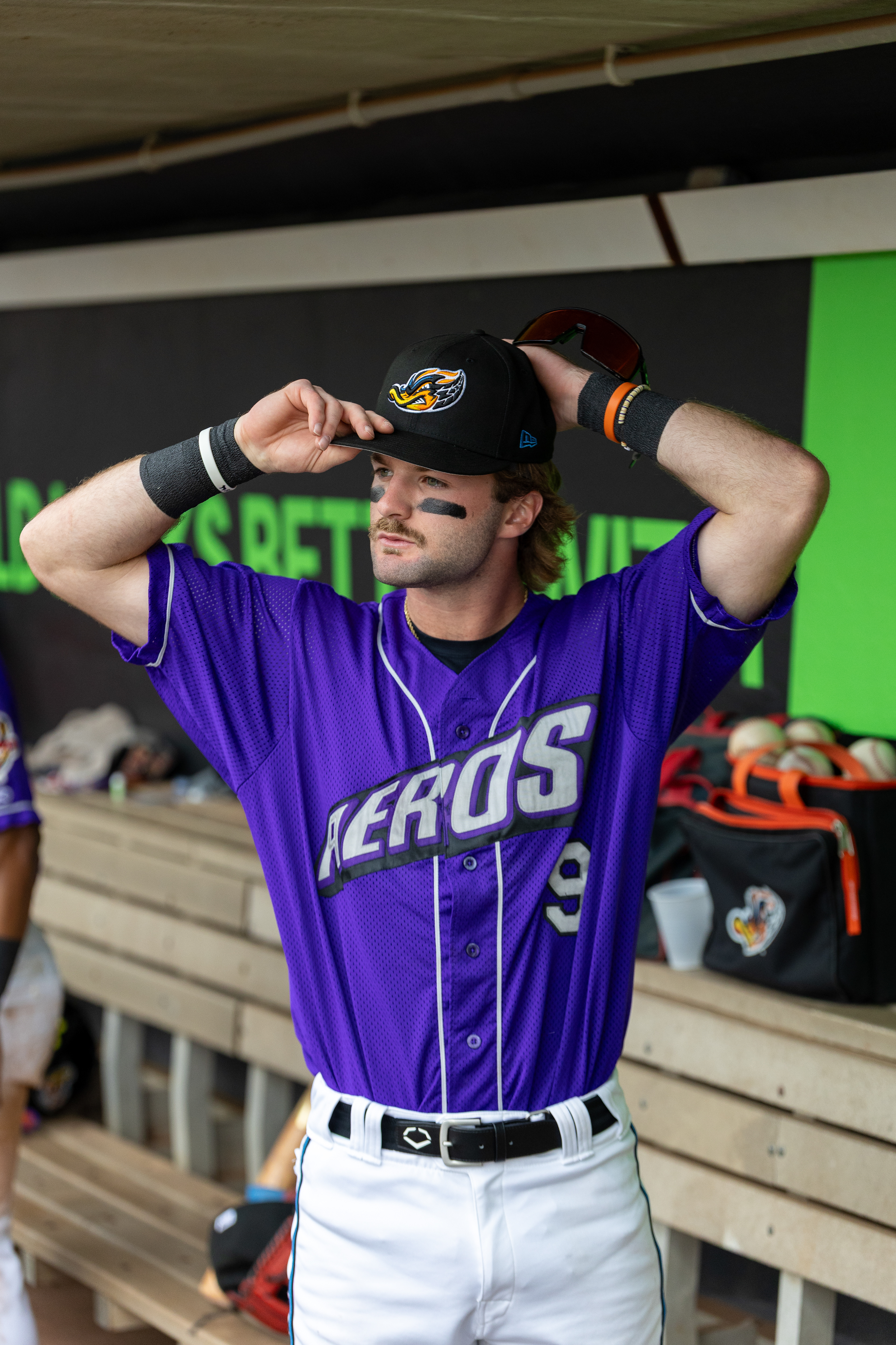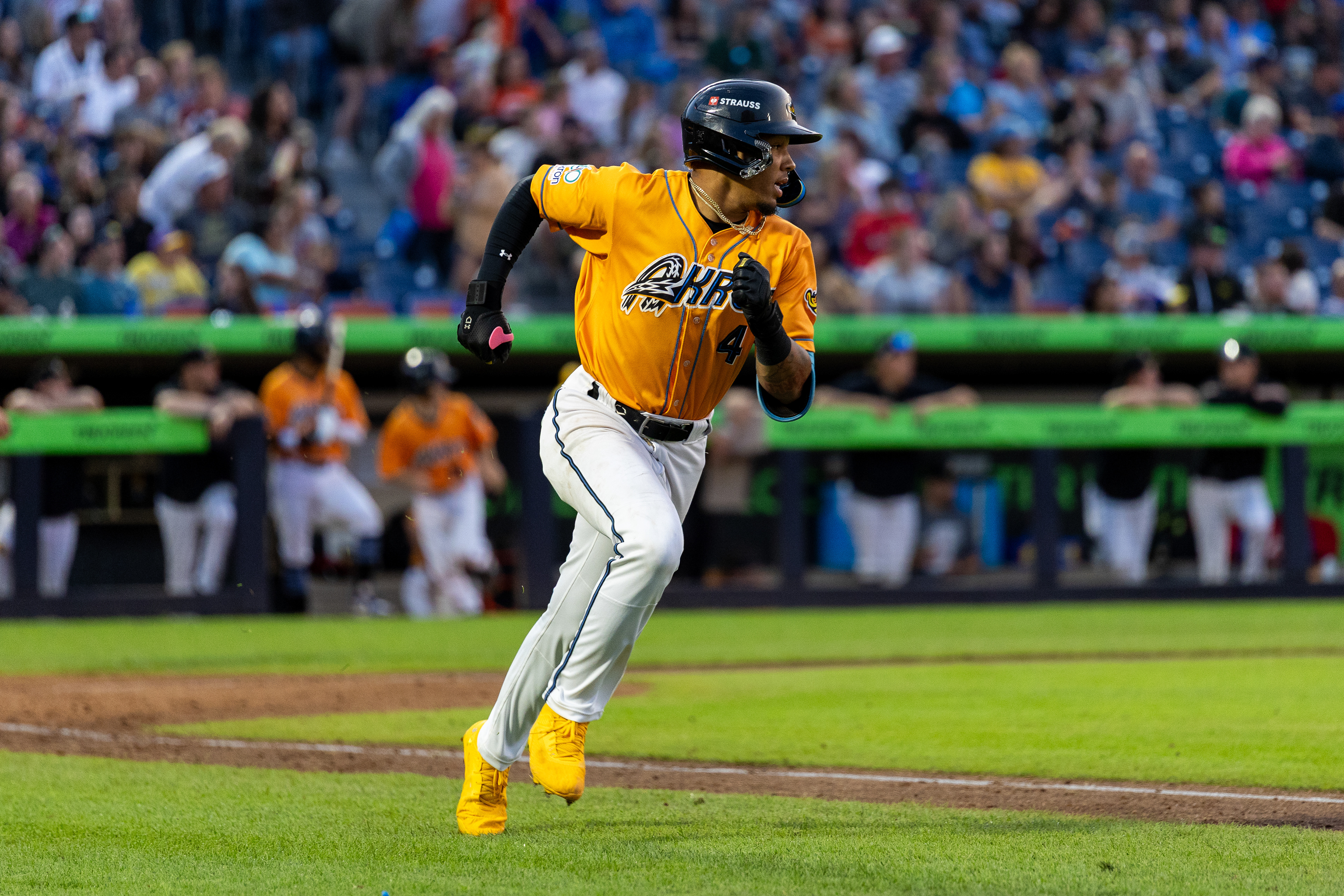 Akron Rubberducks #22, Joe Lampe, blows a bubble in the outfield during the game against the Chesapeake Baysox at Canal Park on August 9 2025.