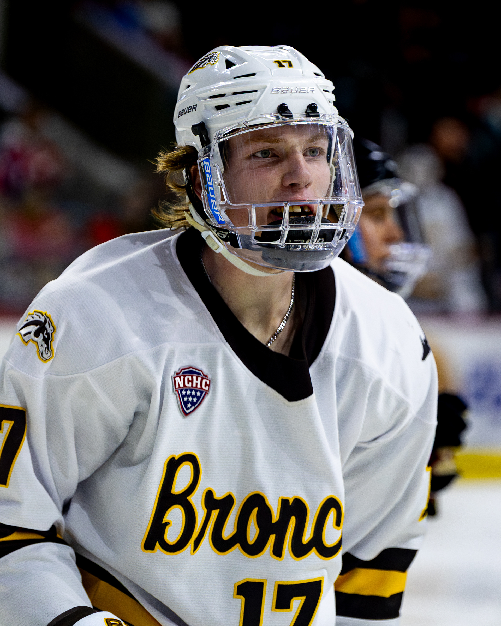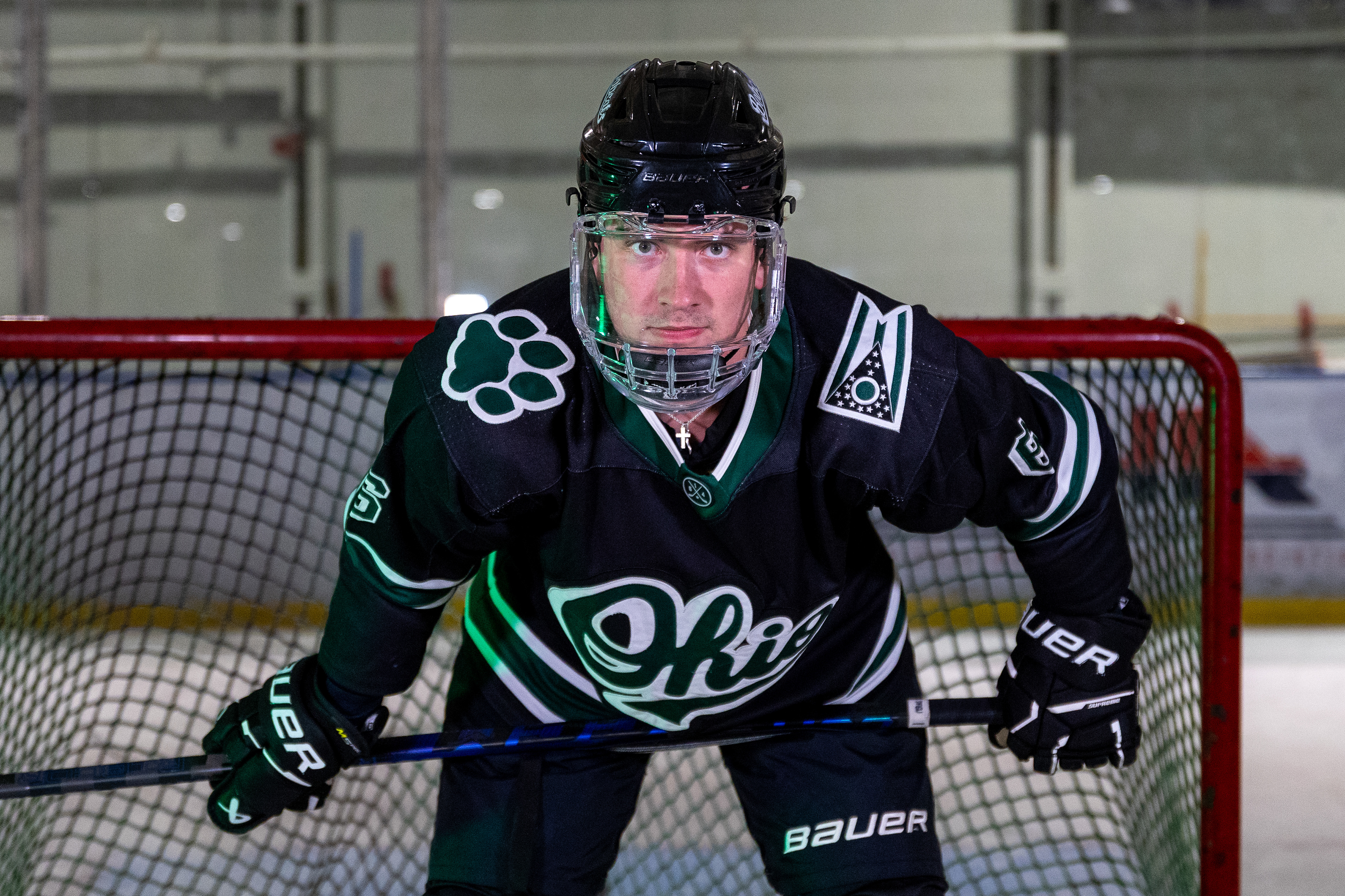 Ohio Bobcats Defenseman #17, Vinny Rengel, poses for a photo as he walks into the rink before a game at Bird Ice Arena.
