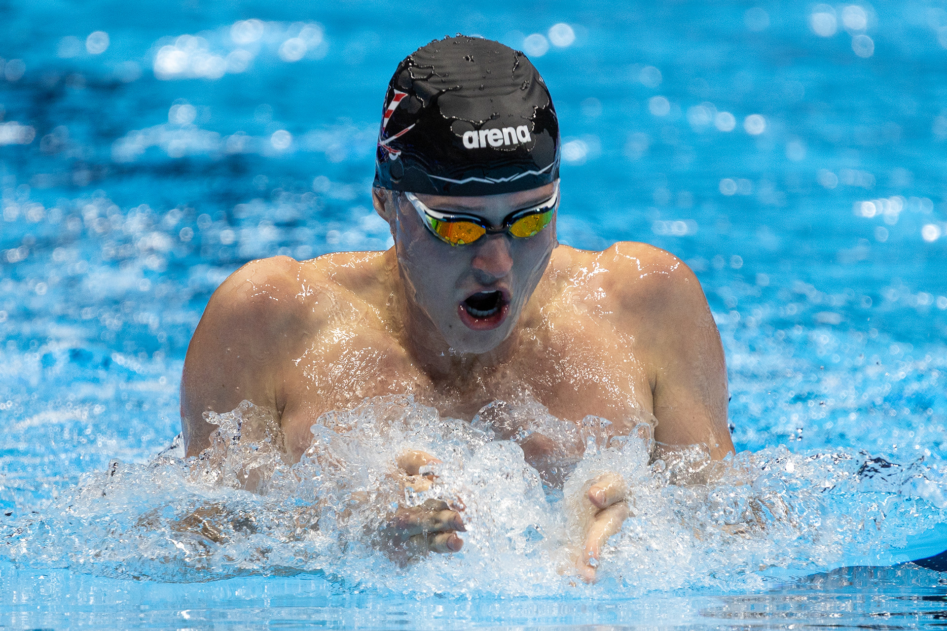 Nic Fink flexes after winning the 100 Breaststroke at the U.S. Olympic Swim Trials at Lucas Oil Stadium on June 16 2024.