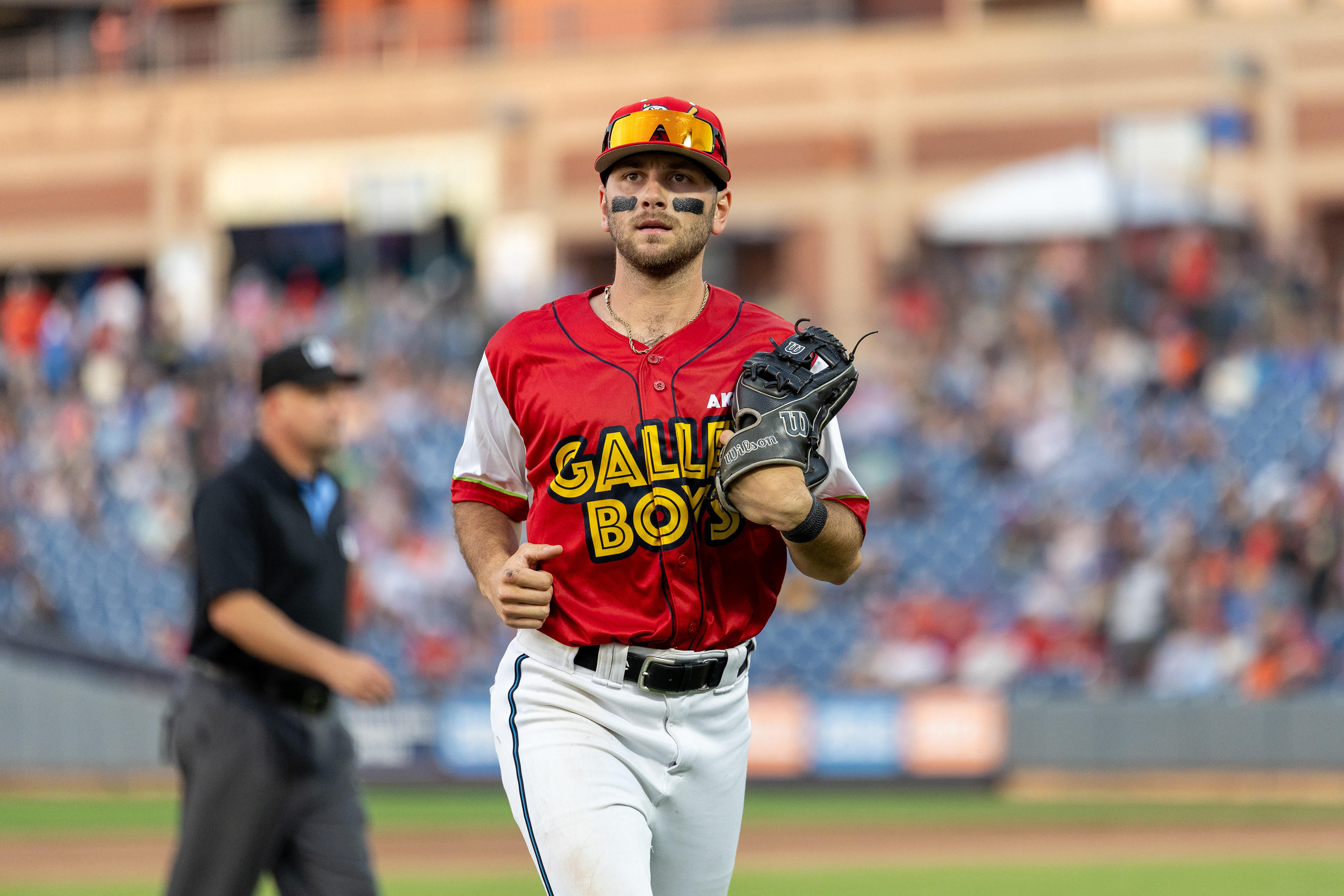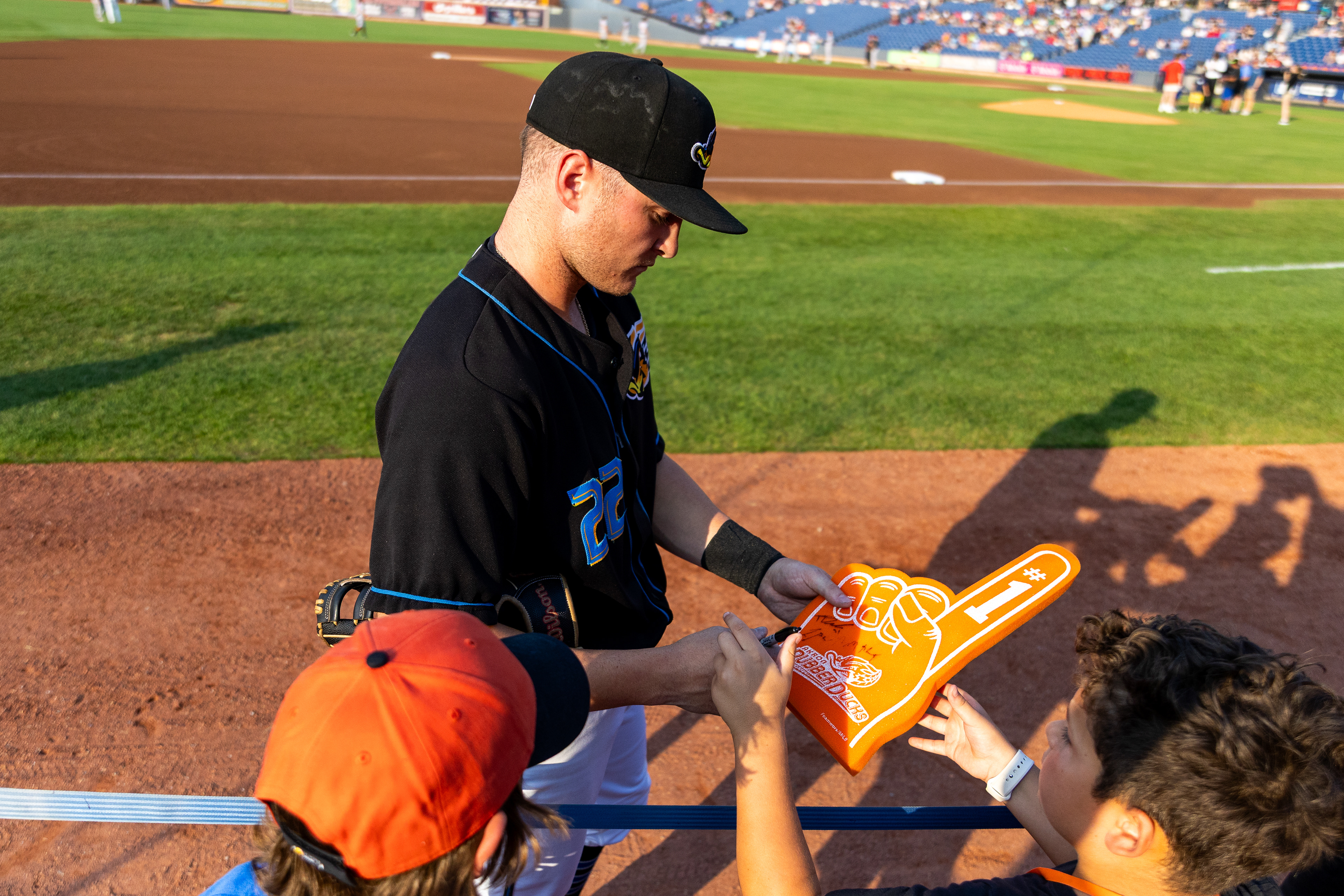 Alexfri Planez signs a little kid's ball after a walk-off win at Canal Park on August 11 2024.