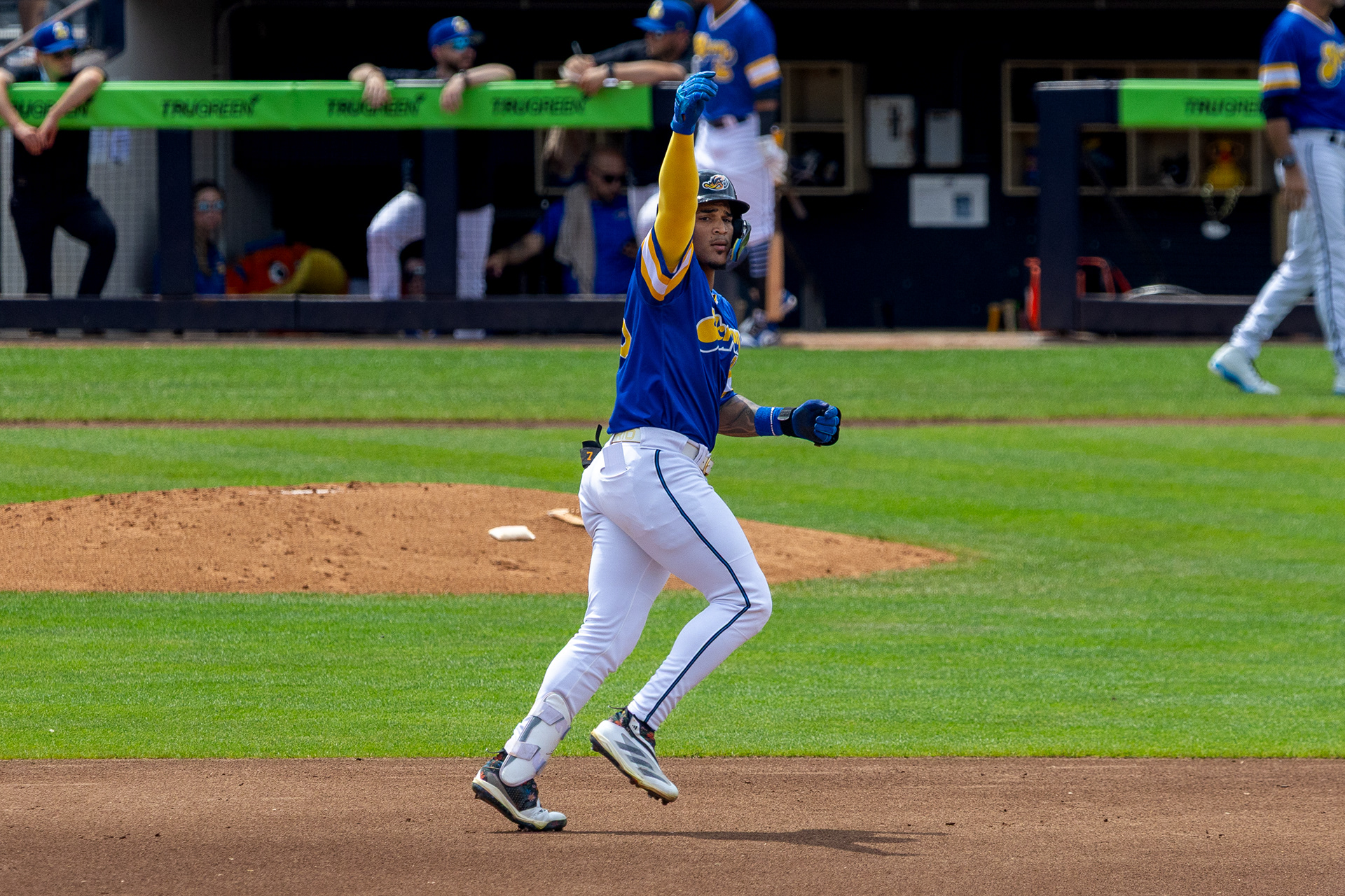 Yordys Valdes celebrates his home run while running the bases at Canal Park on August 11 2024.