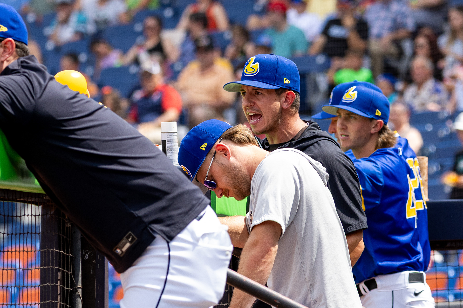 Micael Ramirez leans over the dugout at Canal Park on August 11 2024.