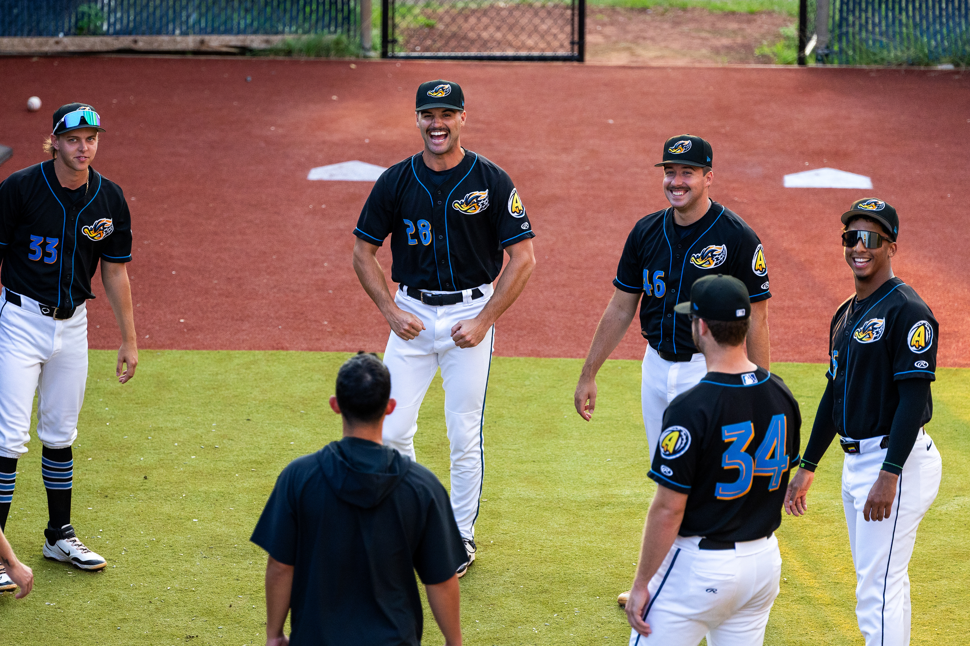 The Akron Rubberducks team celebrates on the field after a walk-off on August 11 2024.