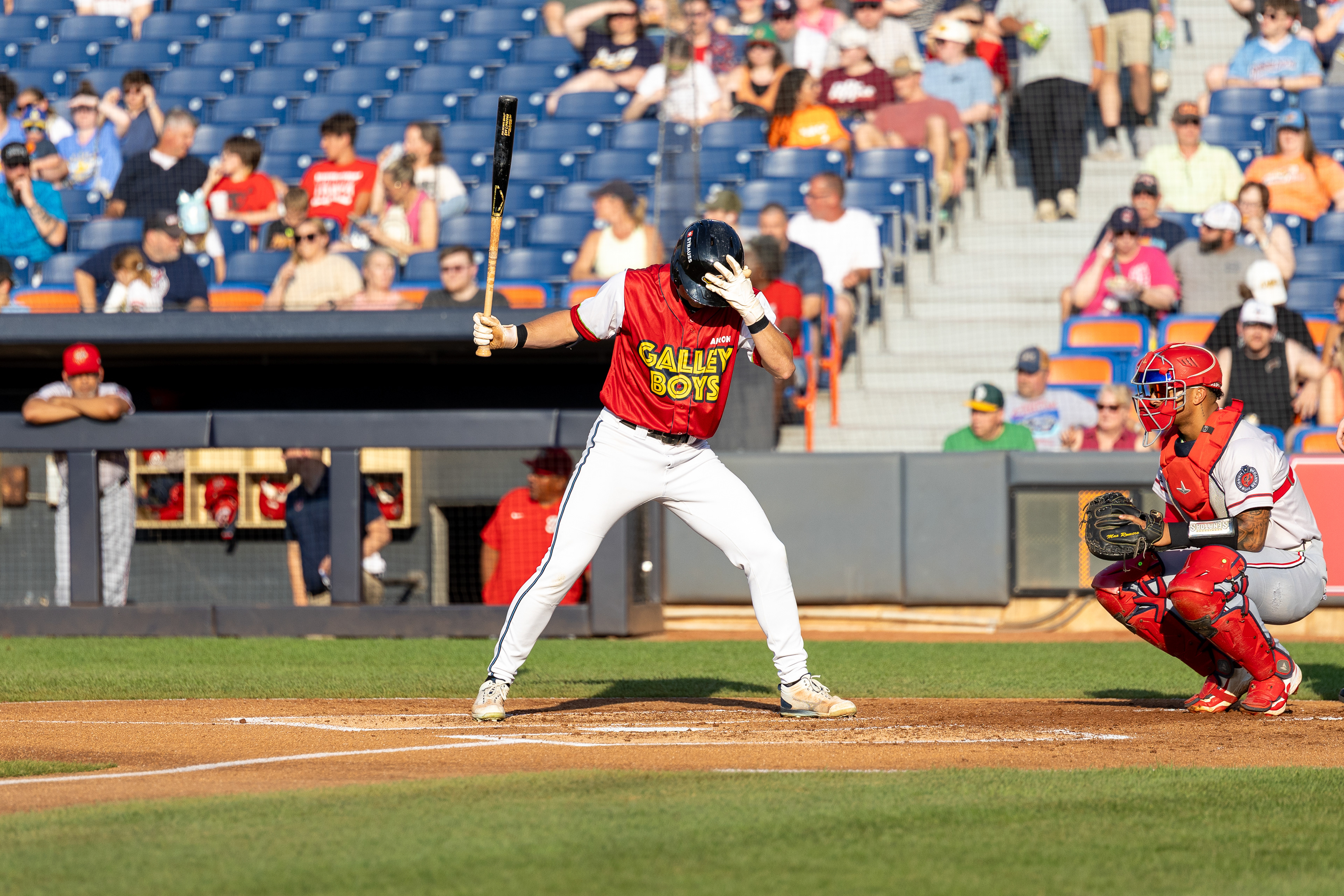 Otto Kemp tests out his bat before he heads to the plate at Canal Park on August 11 2024.