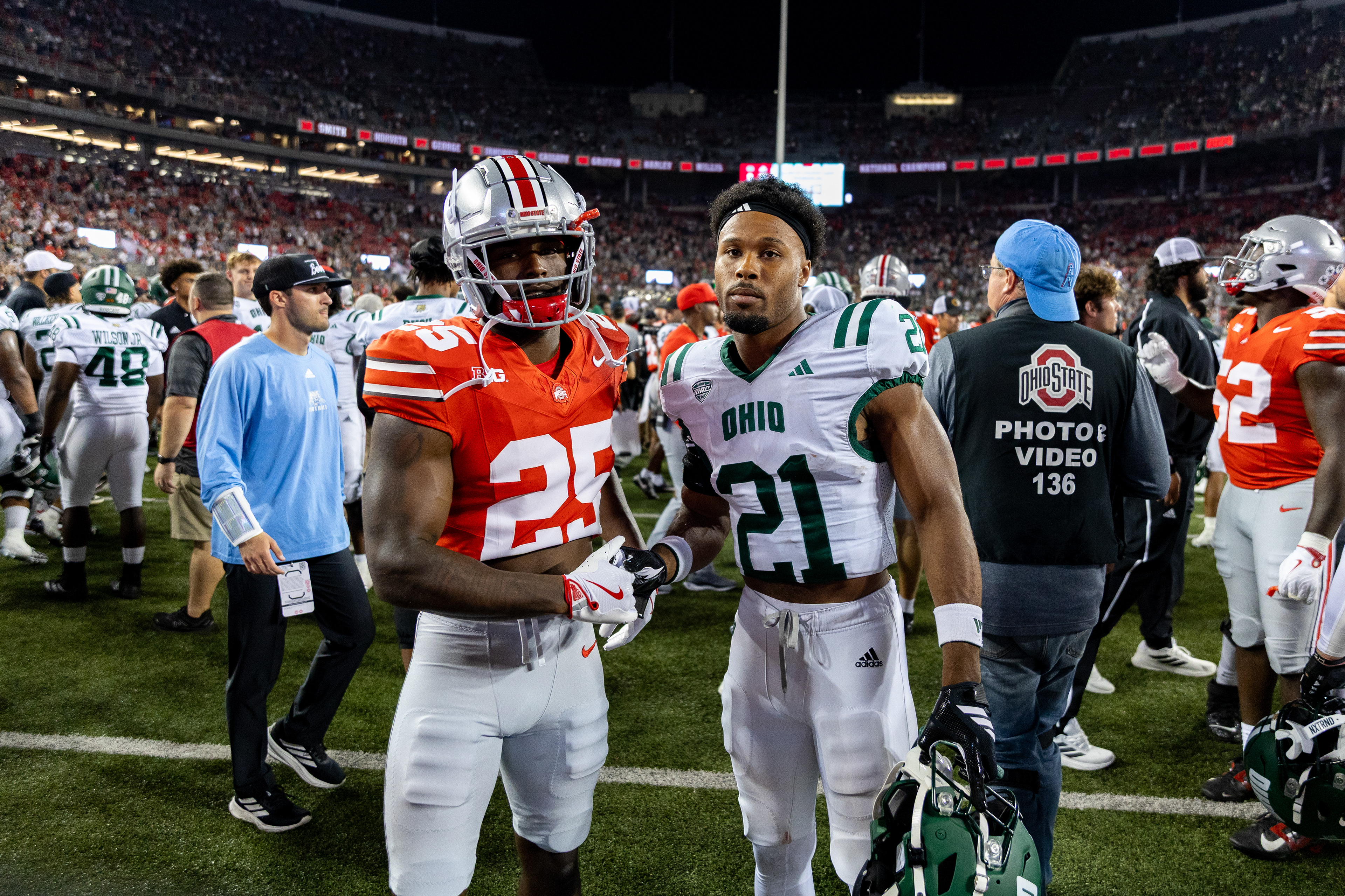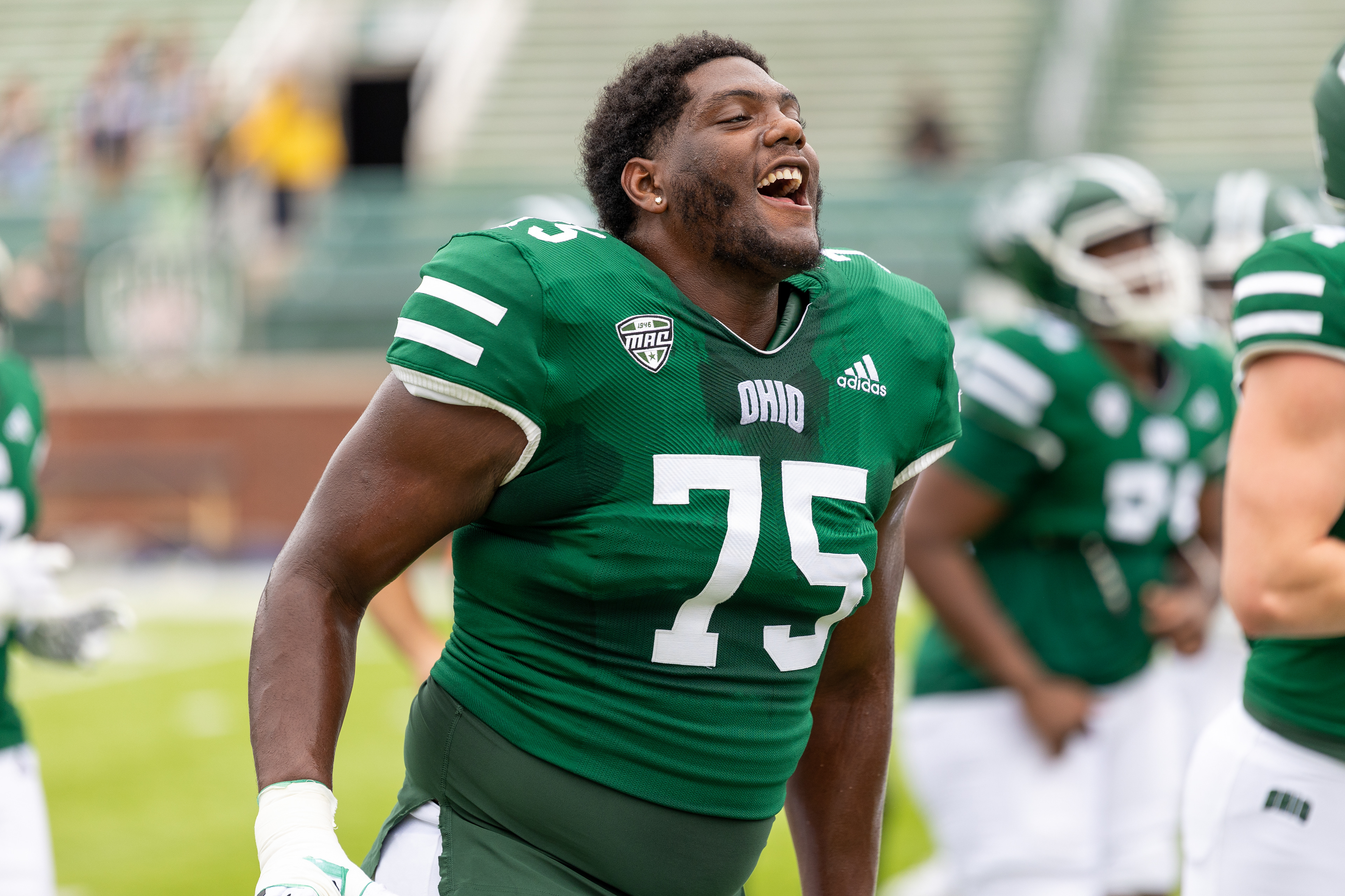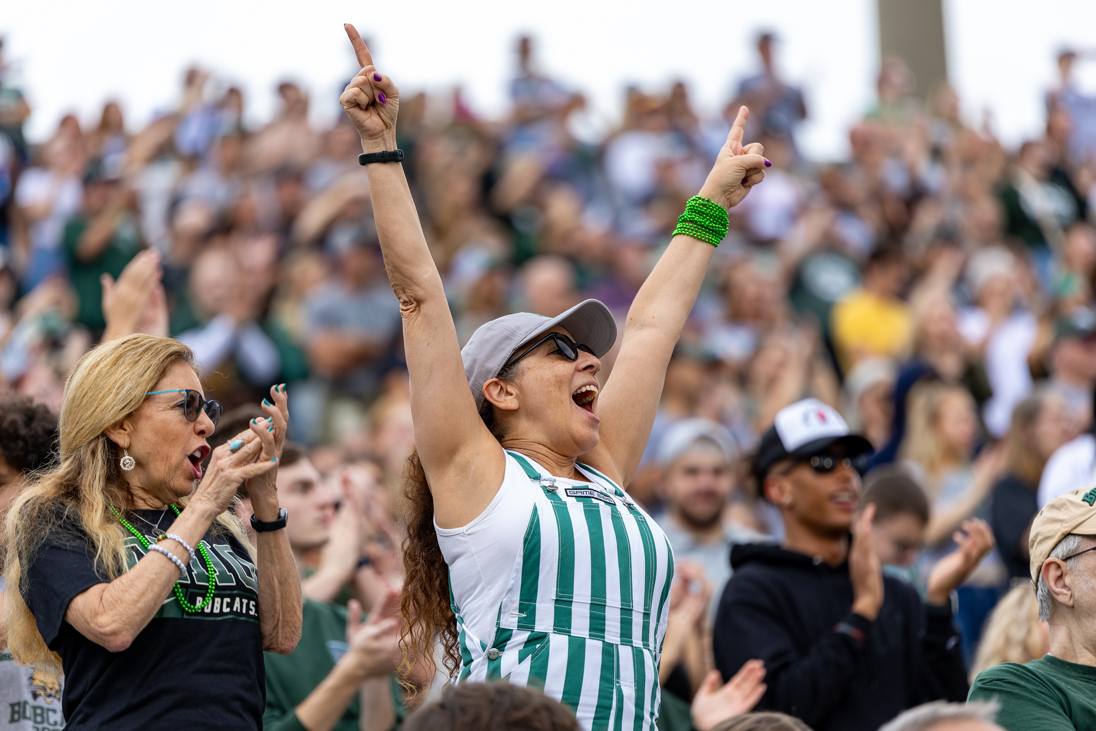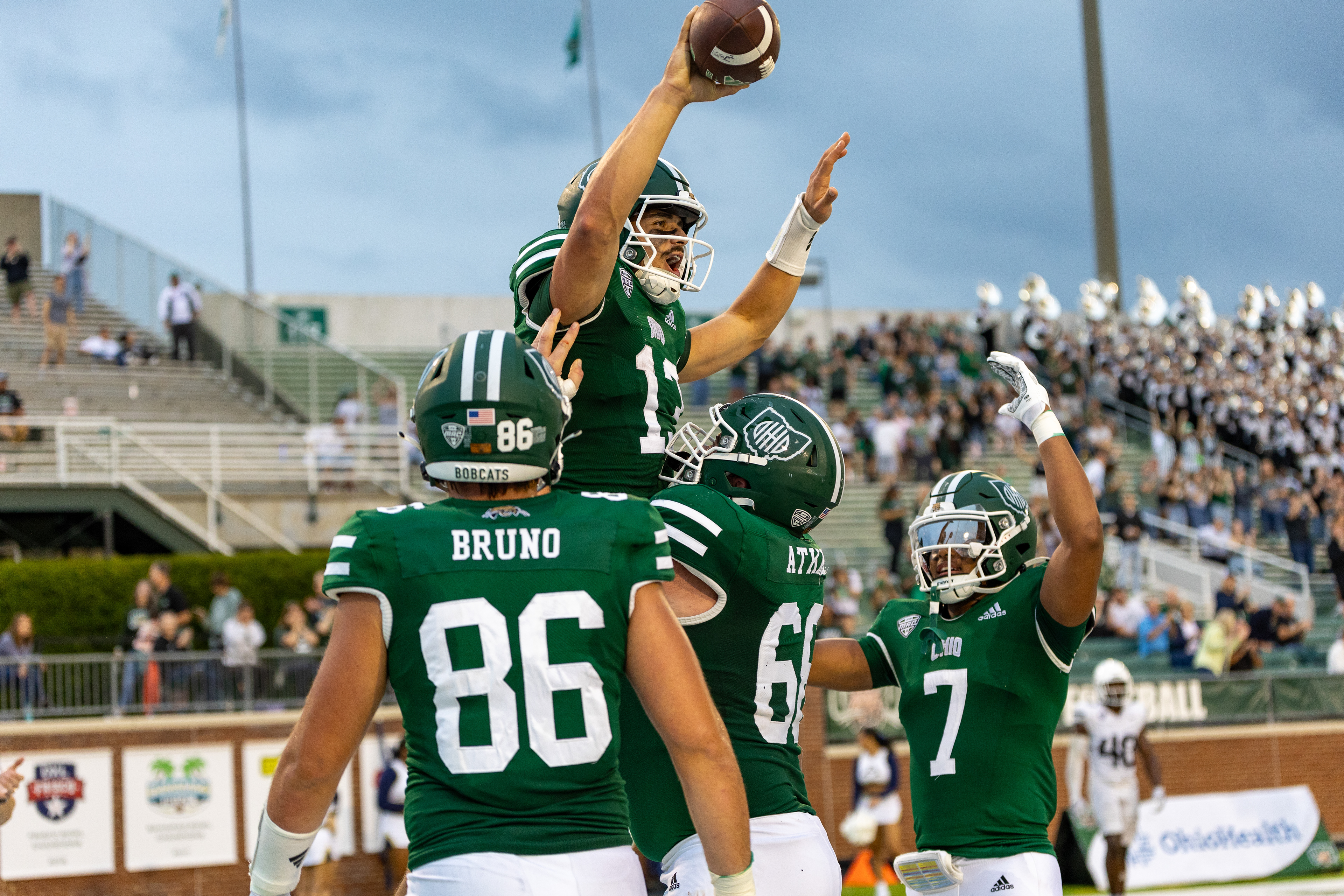 Ohio Bobcats #6, Coleman Owens, celebrates after a touchdown against the Buffalo Bulls at Peden Stadium on October 26 2024.